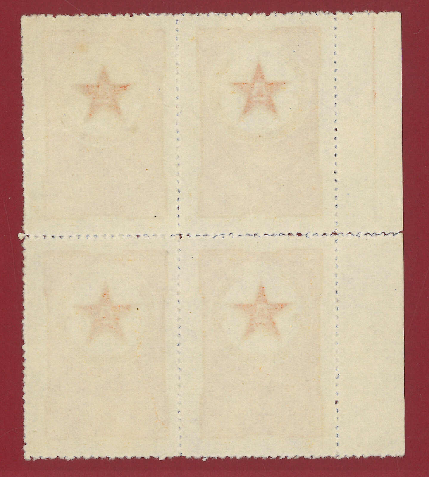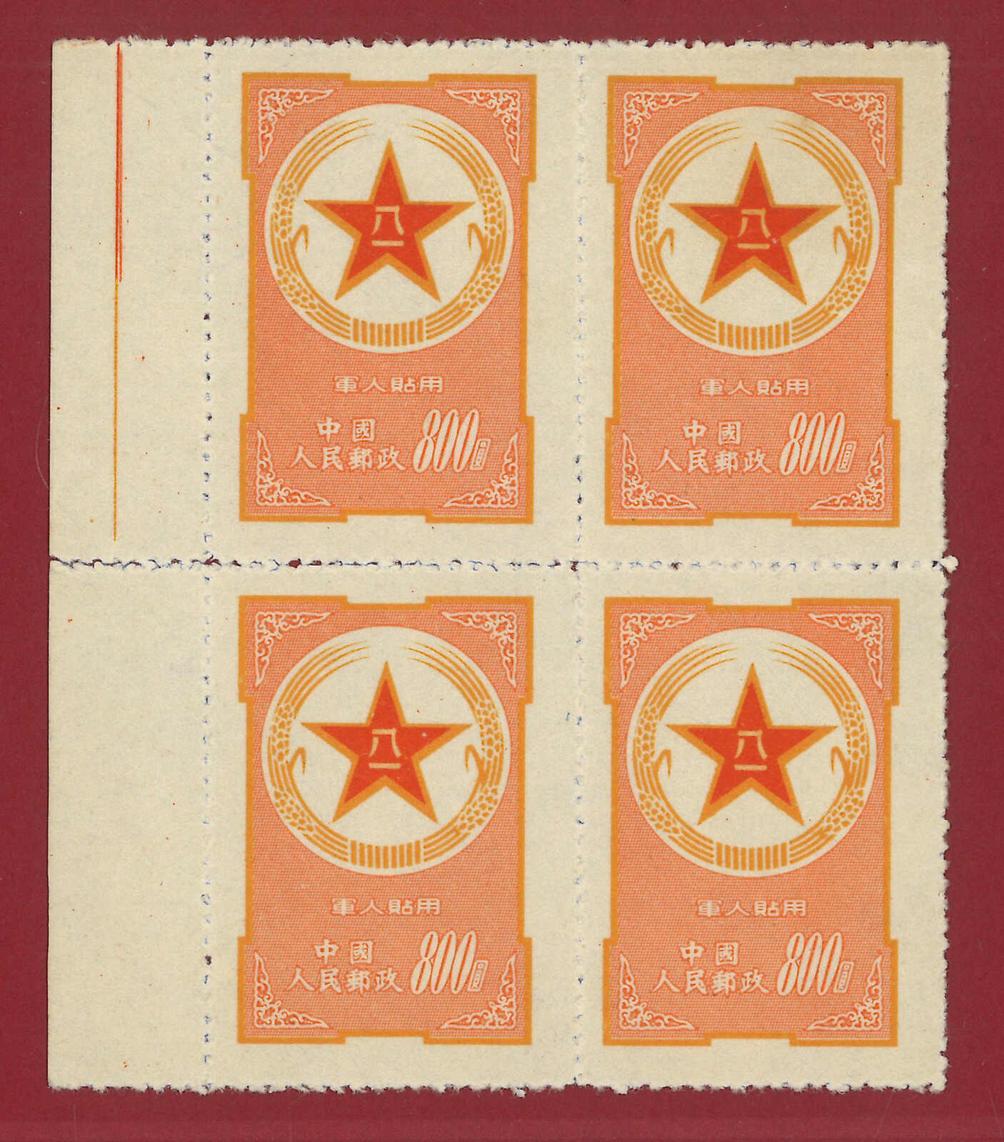 1953年M1黃軍郵四方連新,帶左紙邊,無貼。中央橫齒部分斷開。(Image 1)