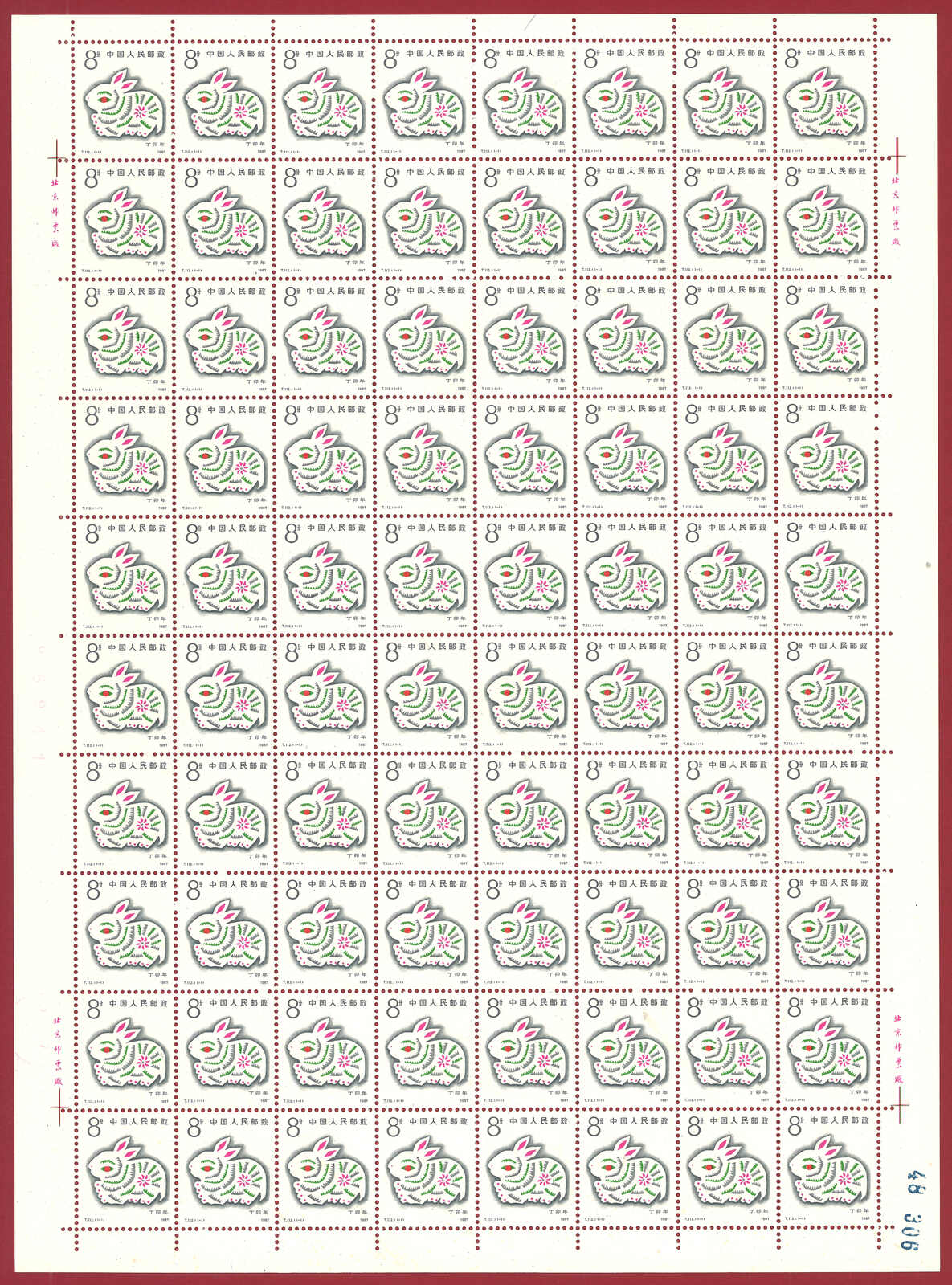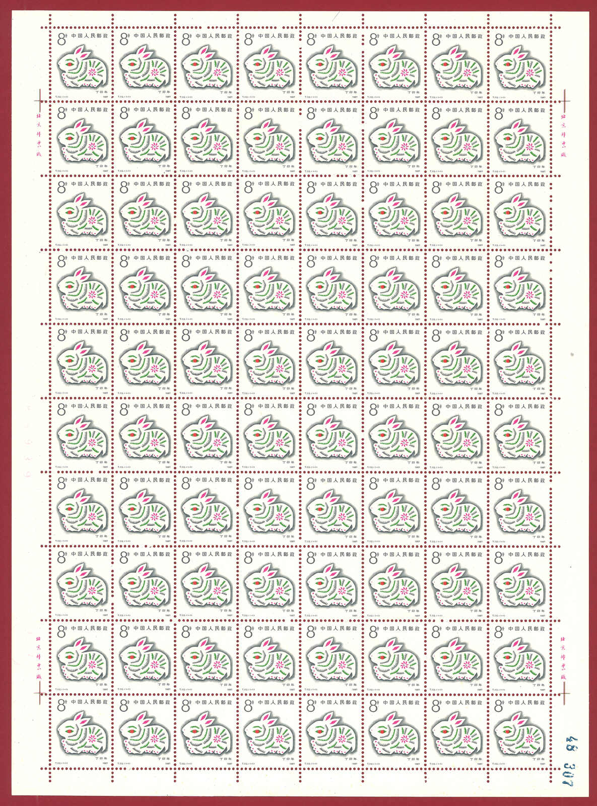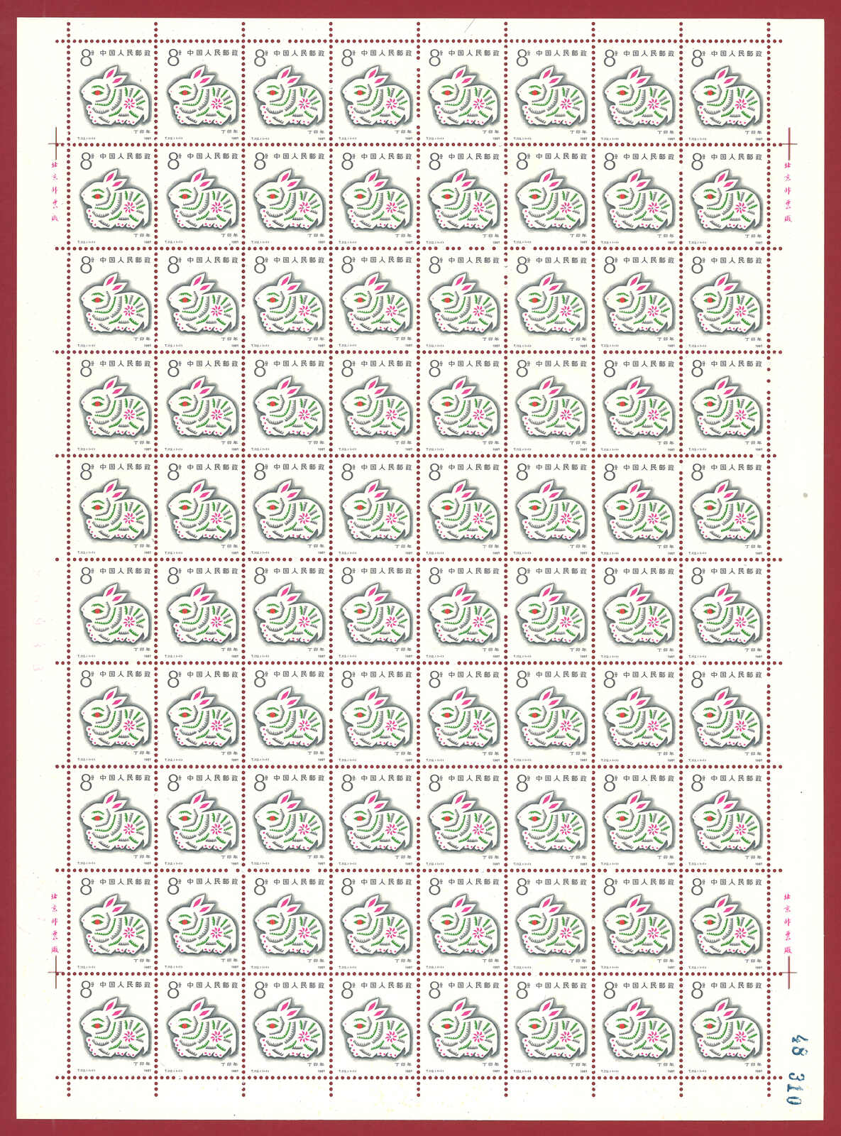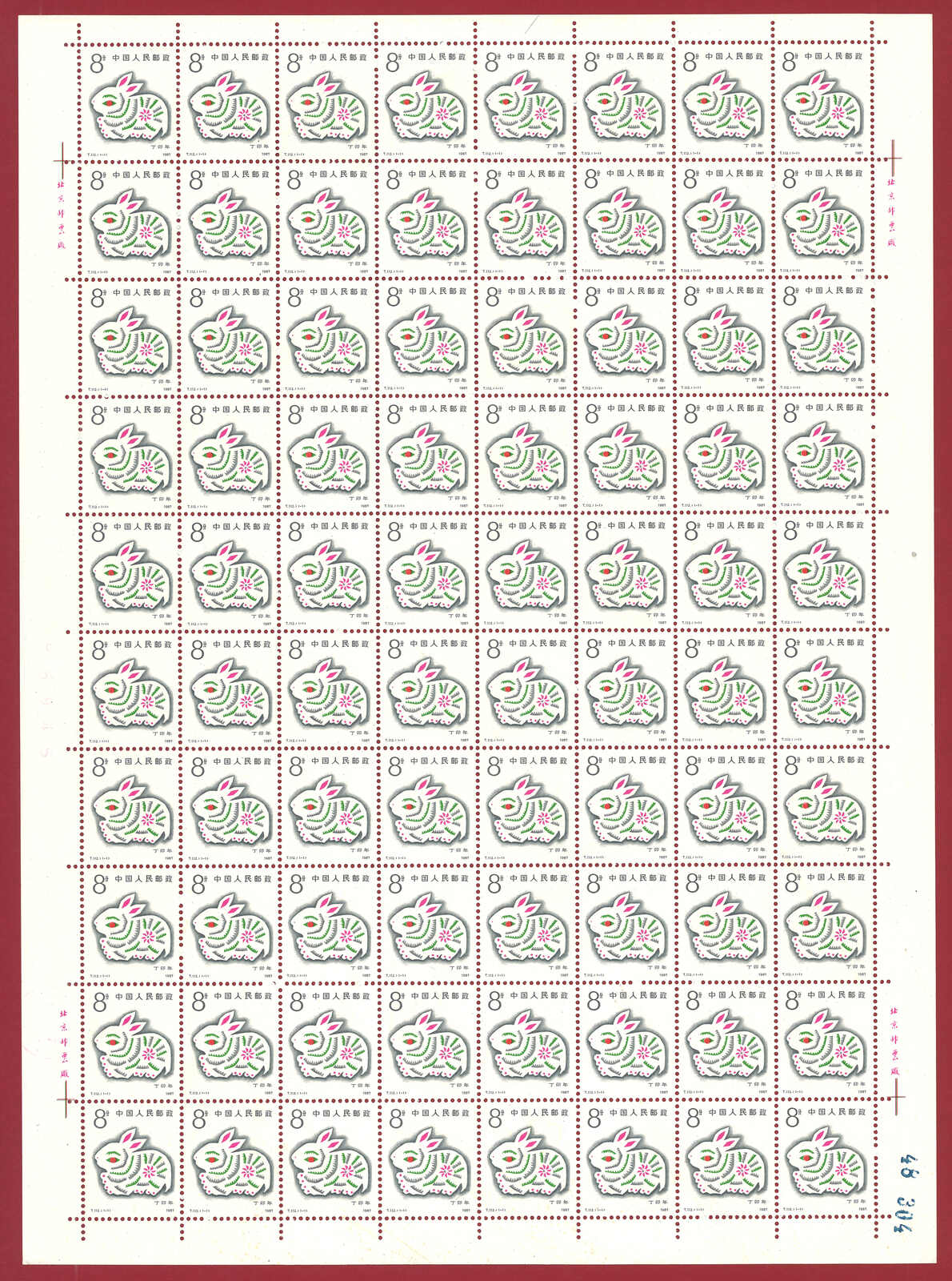 1986年T107虎年及1987年T112兔年版票各10版新,共1600枚。(Image 1)