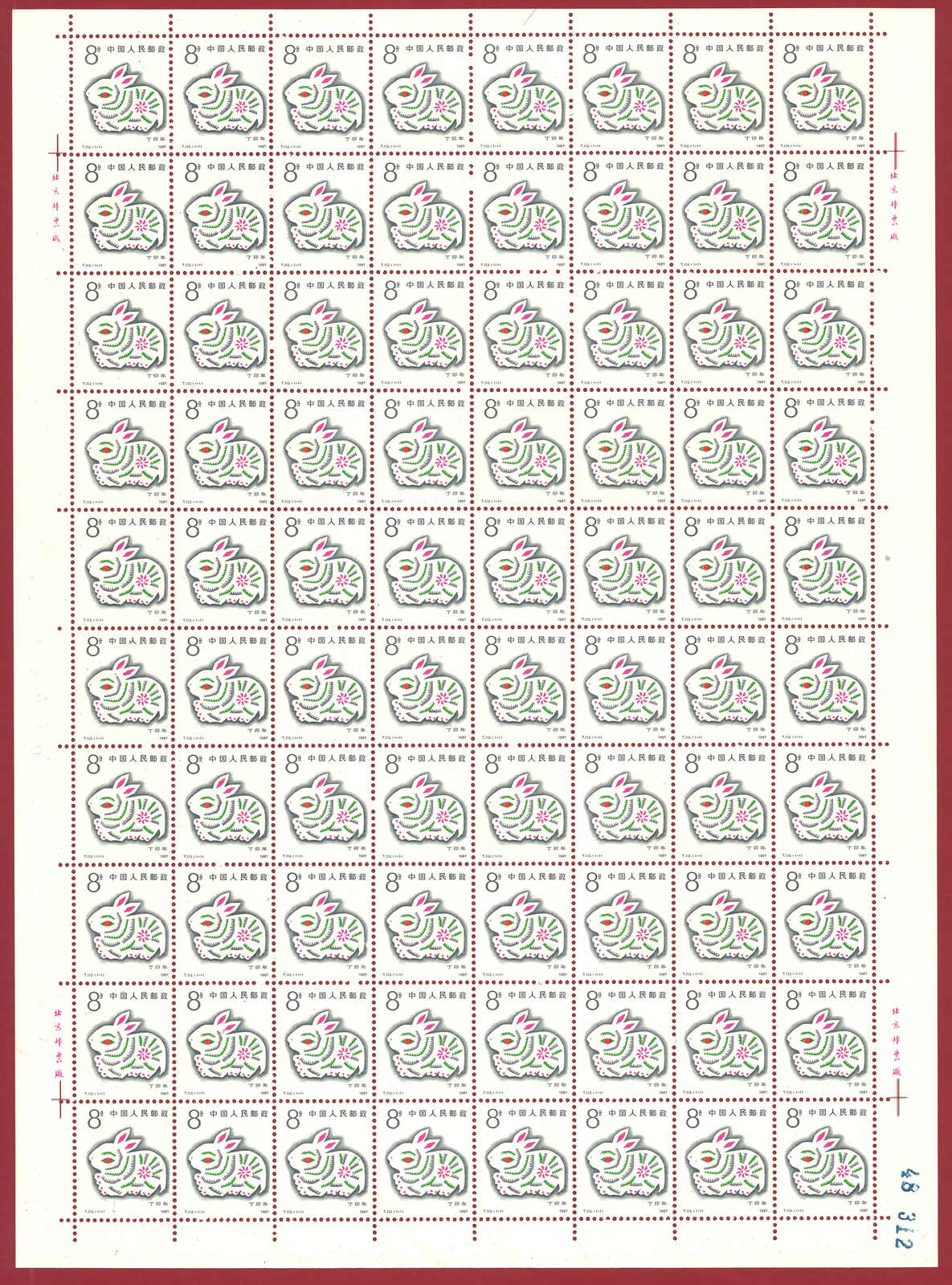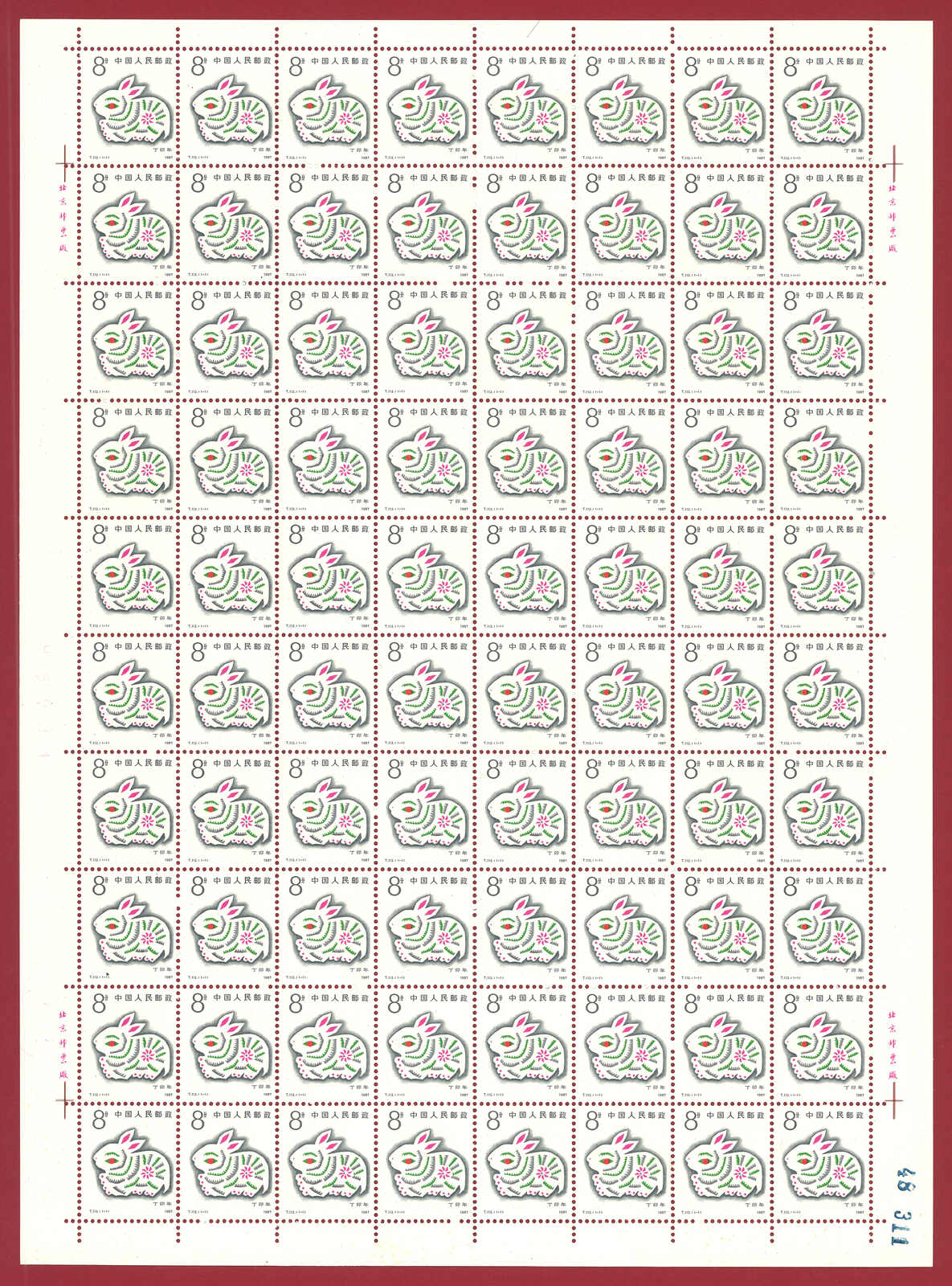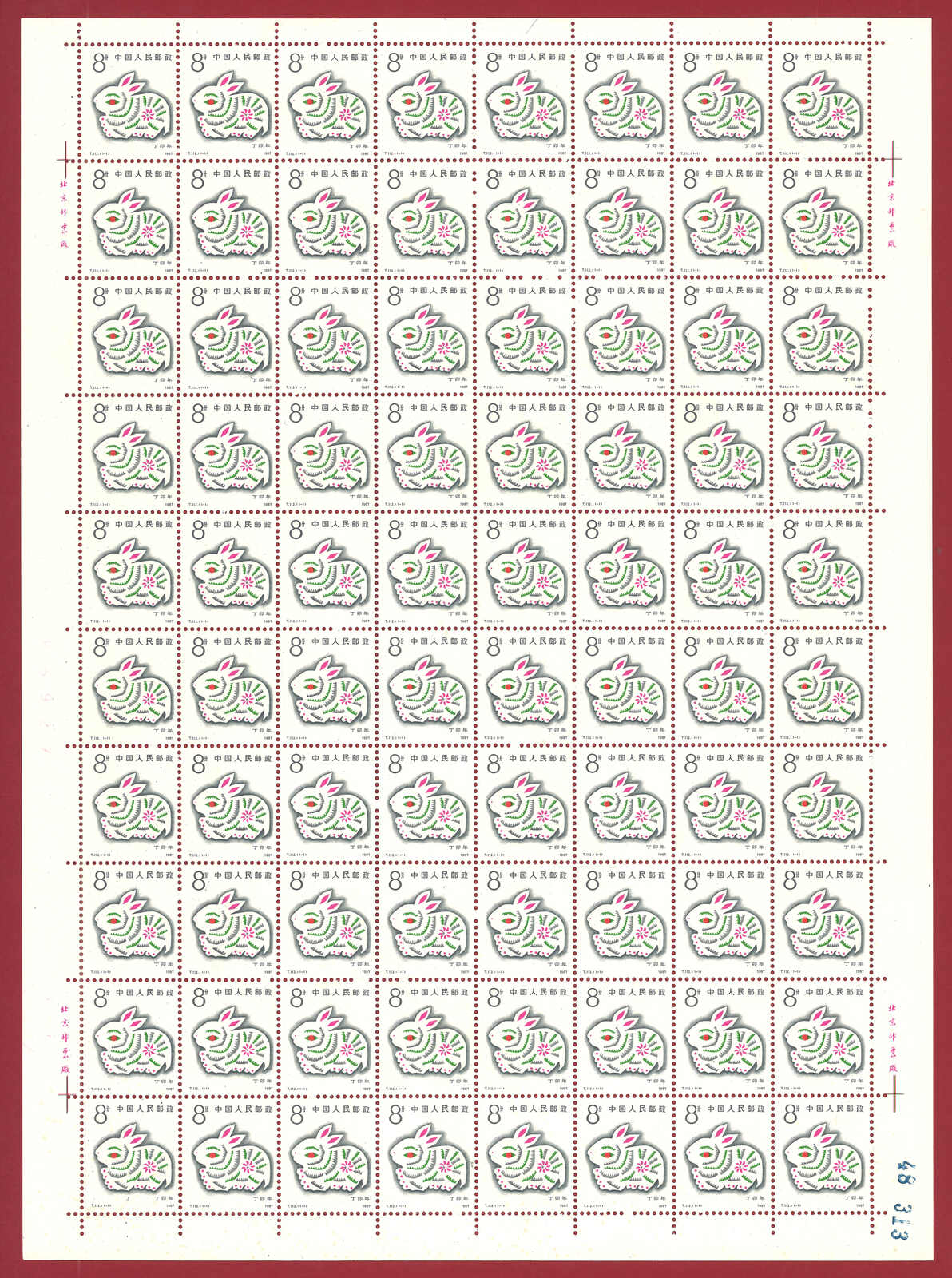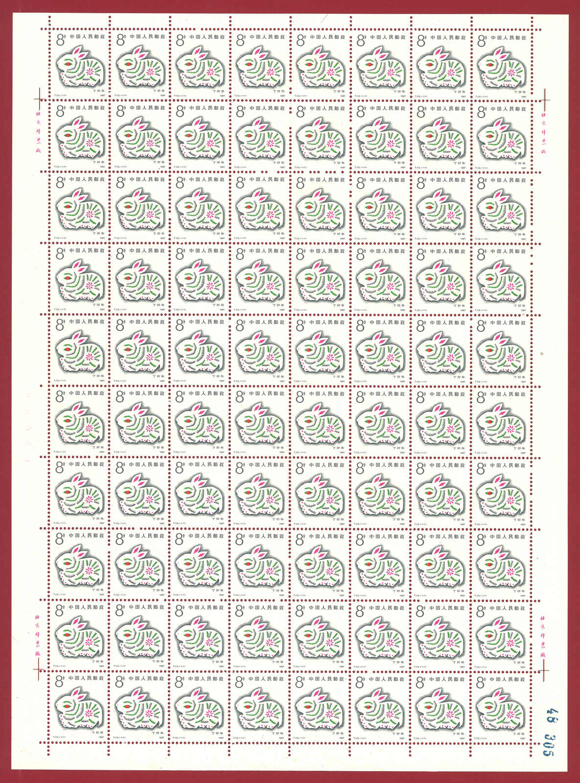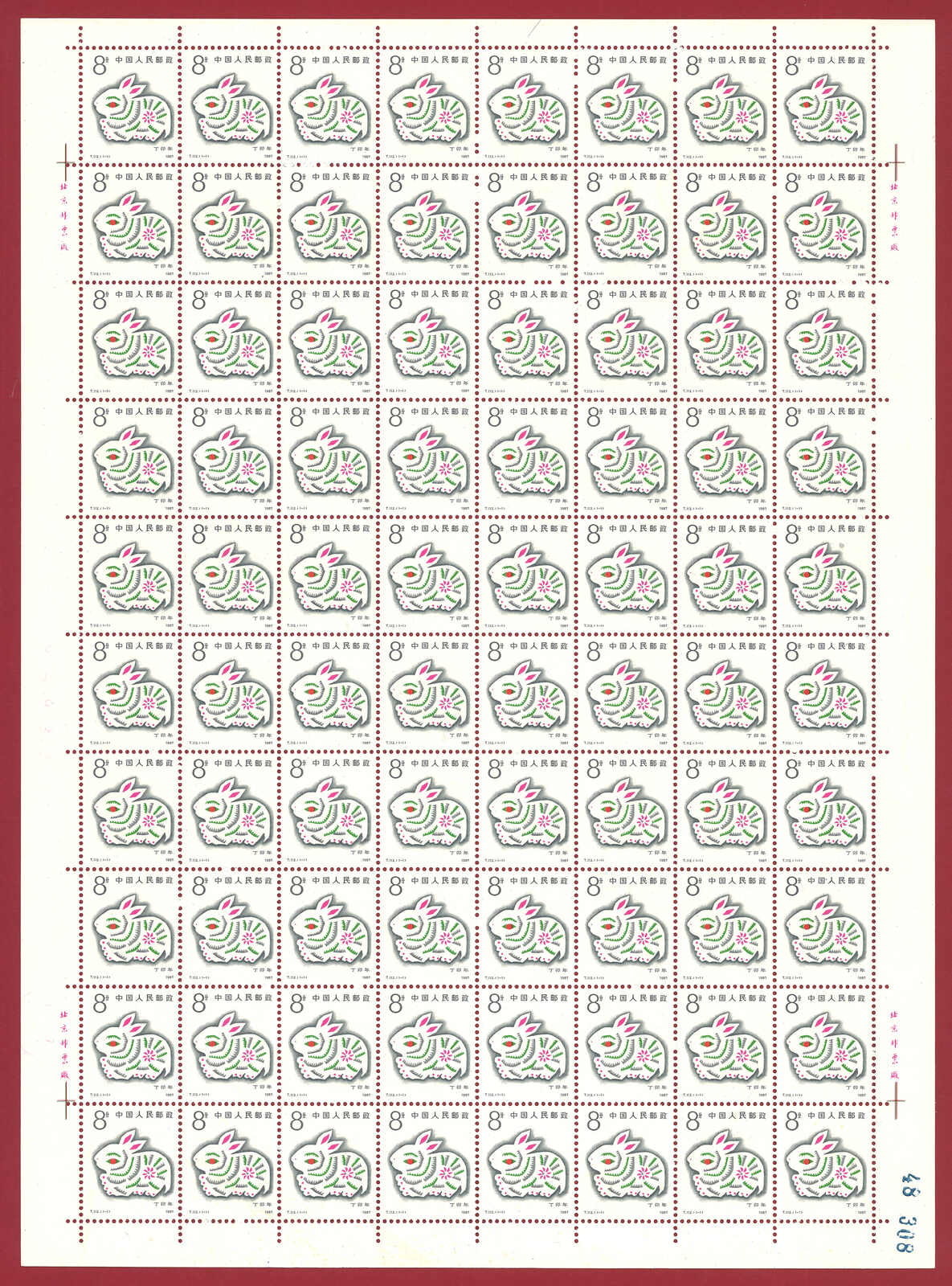 1986年T107虎年及1987年T112兔年版票各10版新,共1600枚。(Image 1)