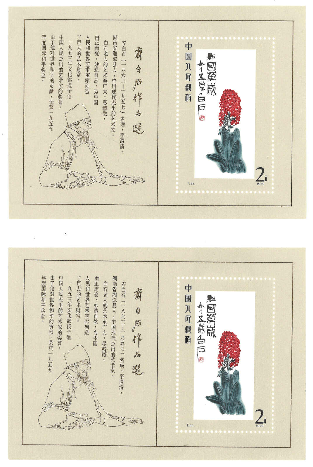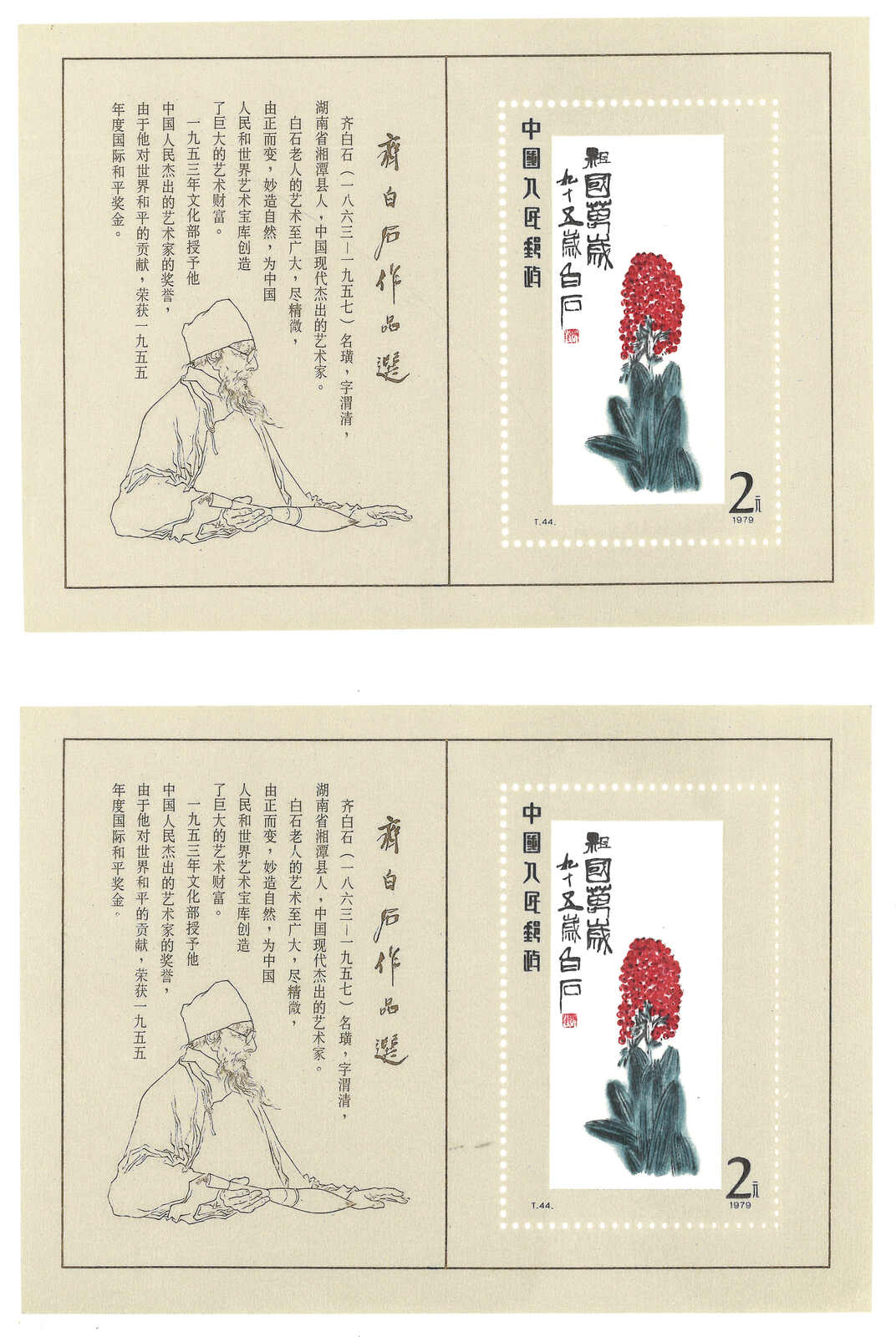 1980年T44M齊白石小型張新x2,原膠無貼。(Image 1)