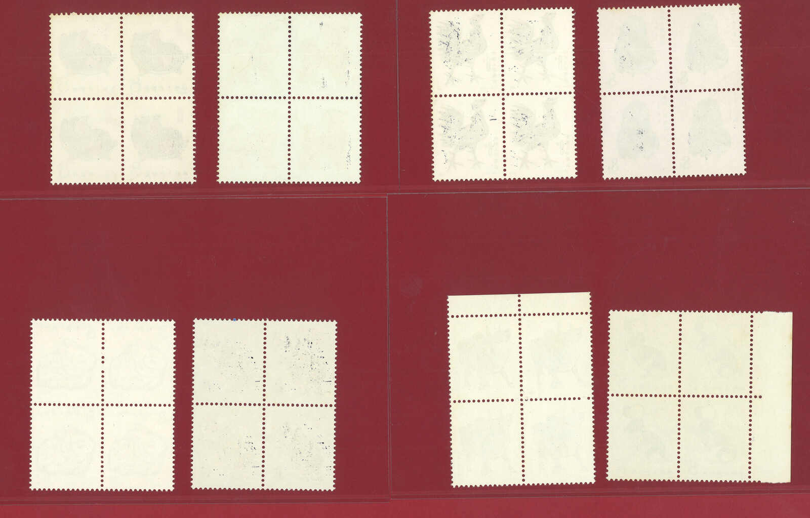1981年T58雞年及1982年T70狗年連票新,前者為十方連,後者24枚。原膠無貼,微黃。部分齒間有折。(Image 1)