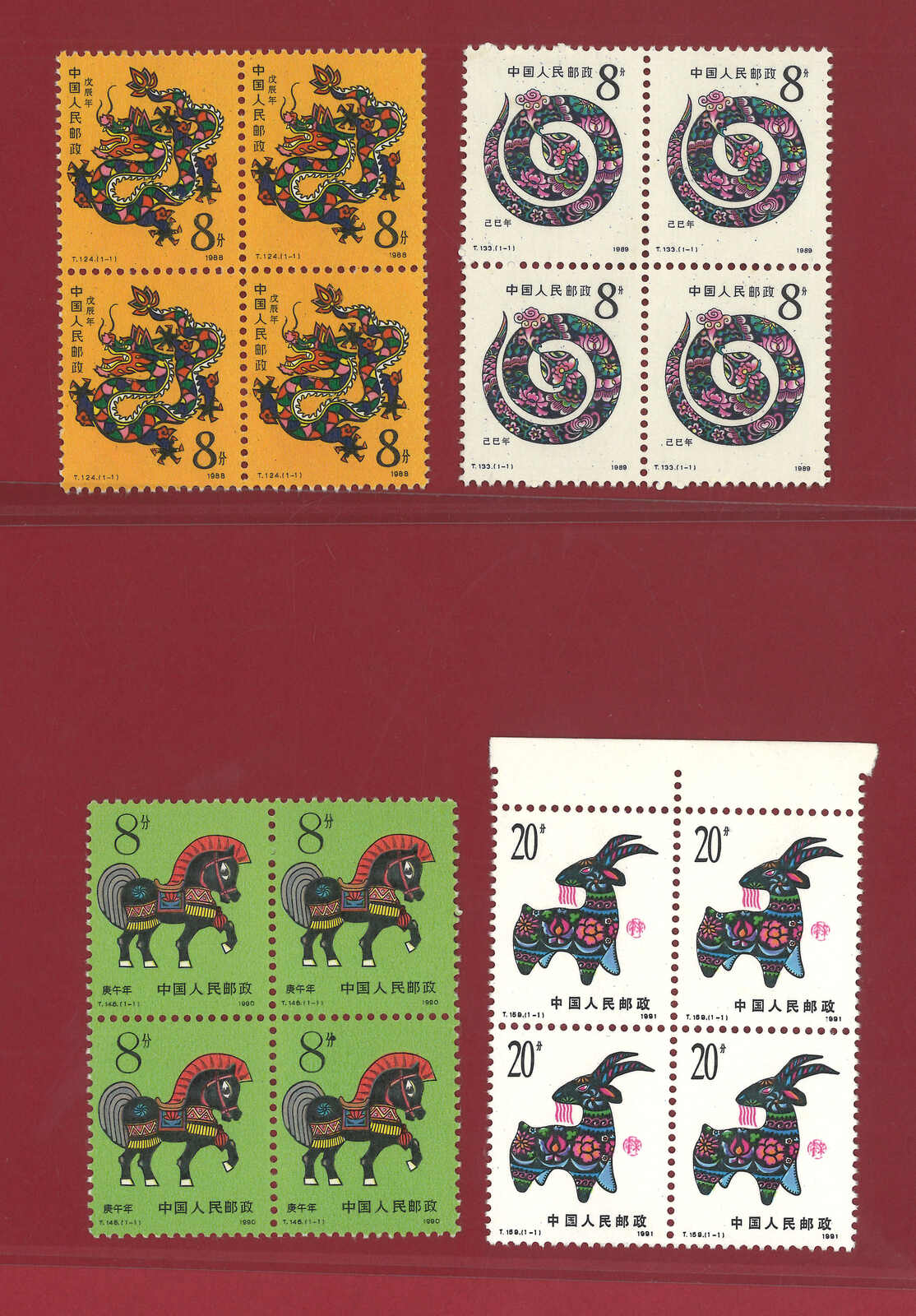 1980-1991 PRC 1st round lunar year issues set in block of 4, from T46 Monkey to T159 Ram complete, partly with margin. All MNH with original gum. Light toning. F-VF.