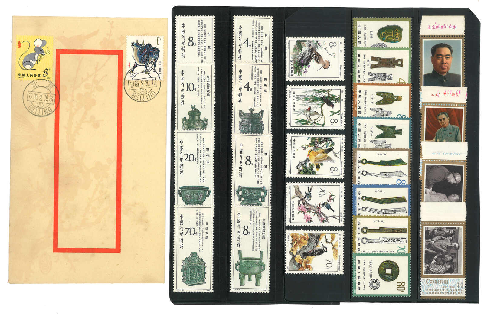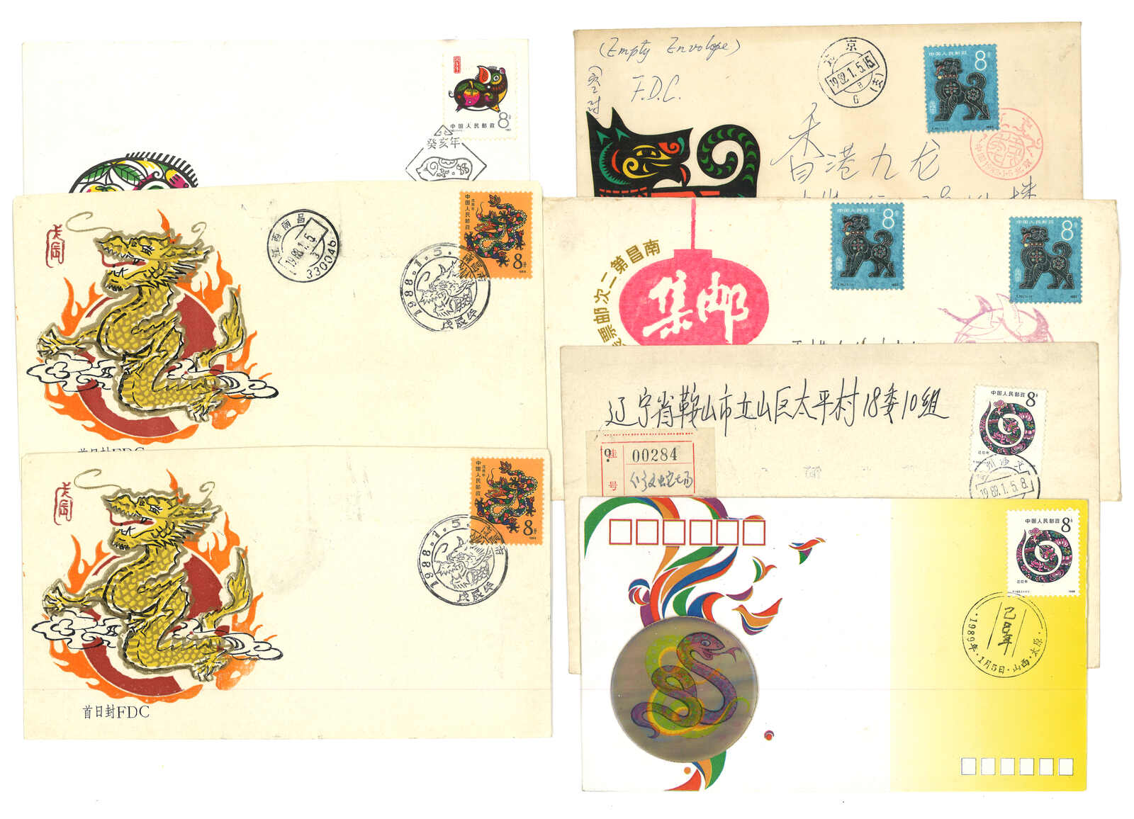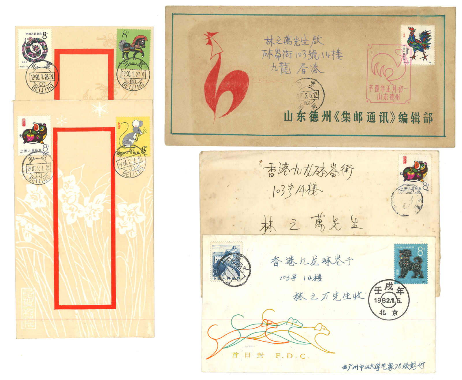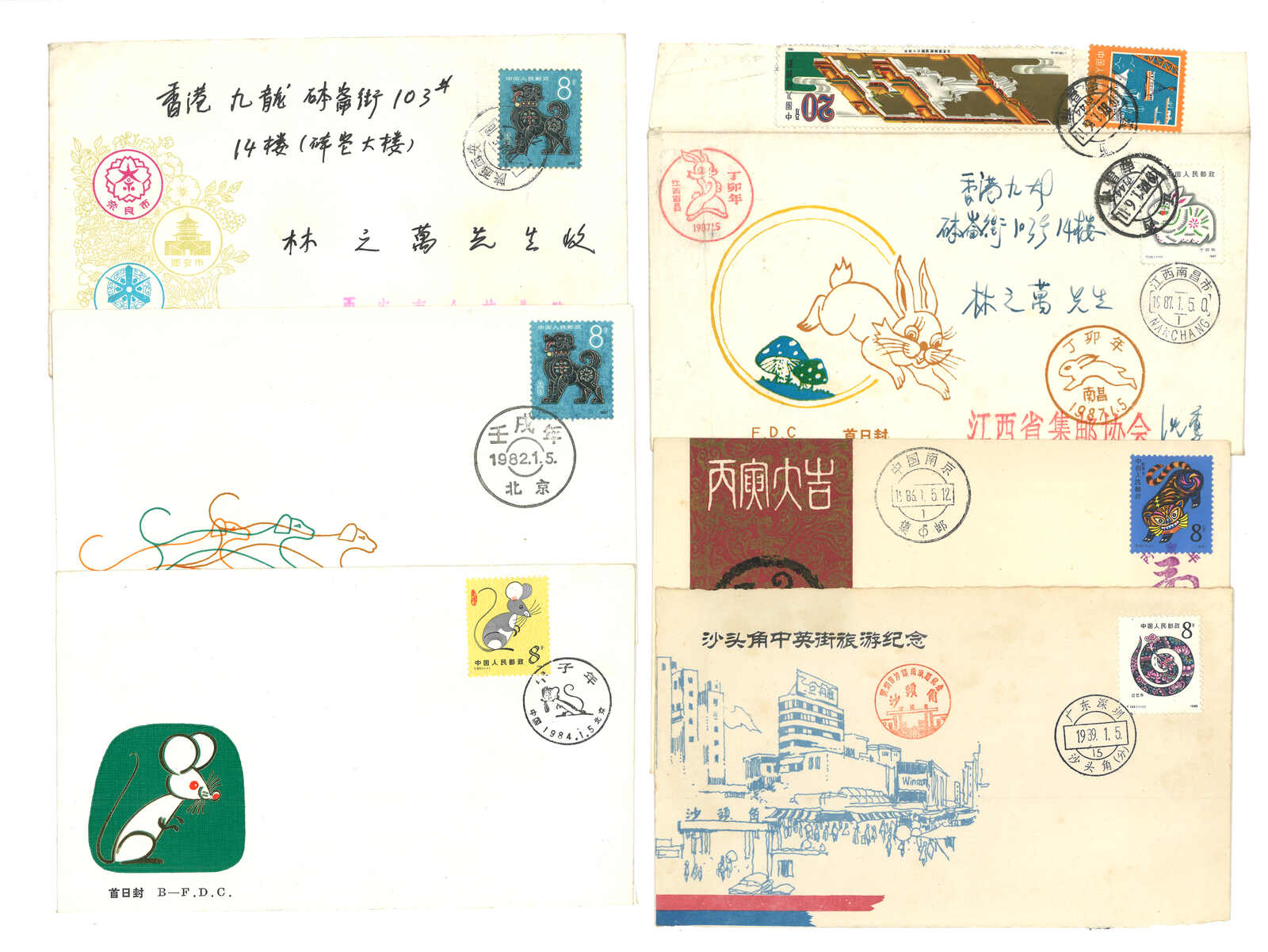 一組約85件貼新中國生肖票之信封,大多貼第一輪之鼠、雞、虎、狗票等,包含首日封及實寄封。(Image 1) (Image 2) (Image 3) (Image 4)