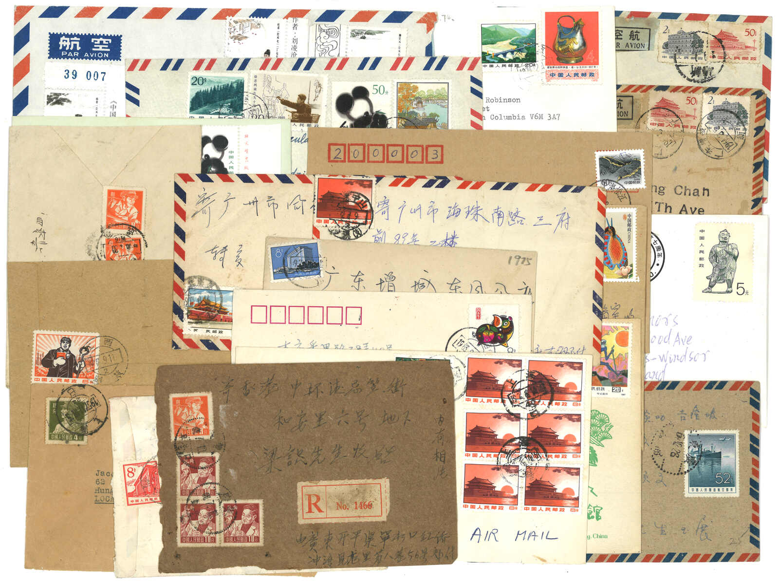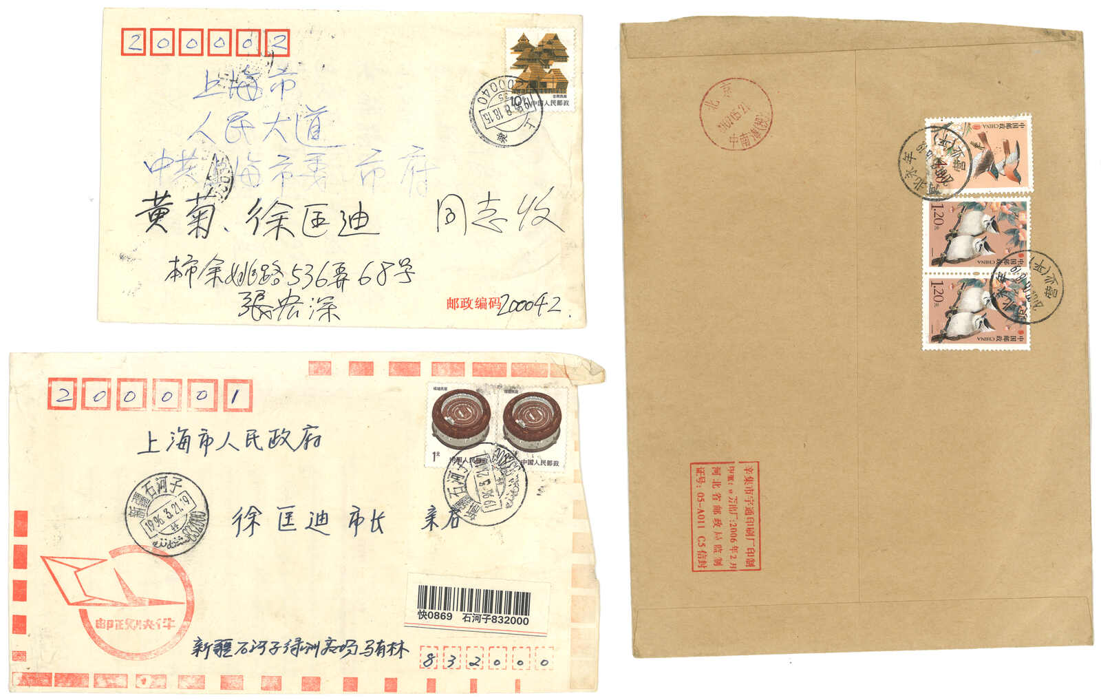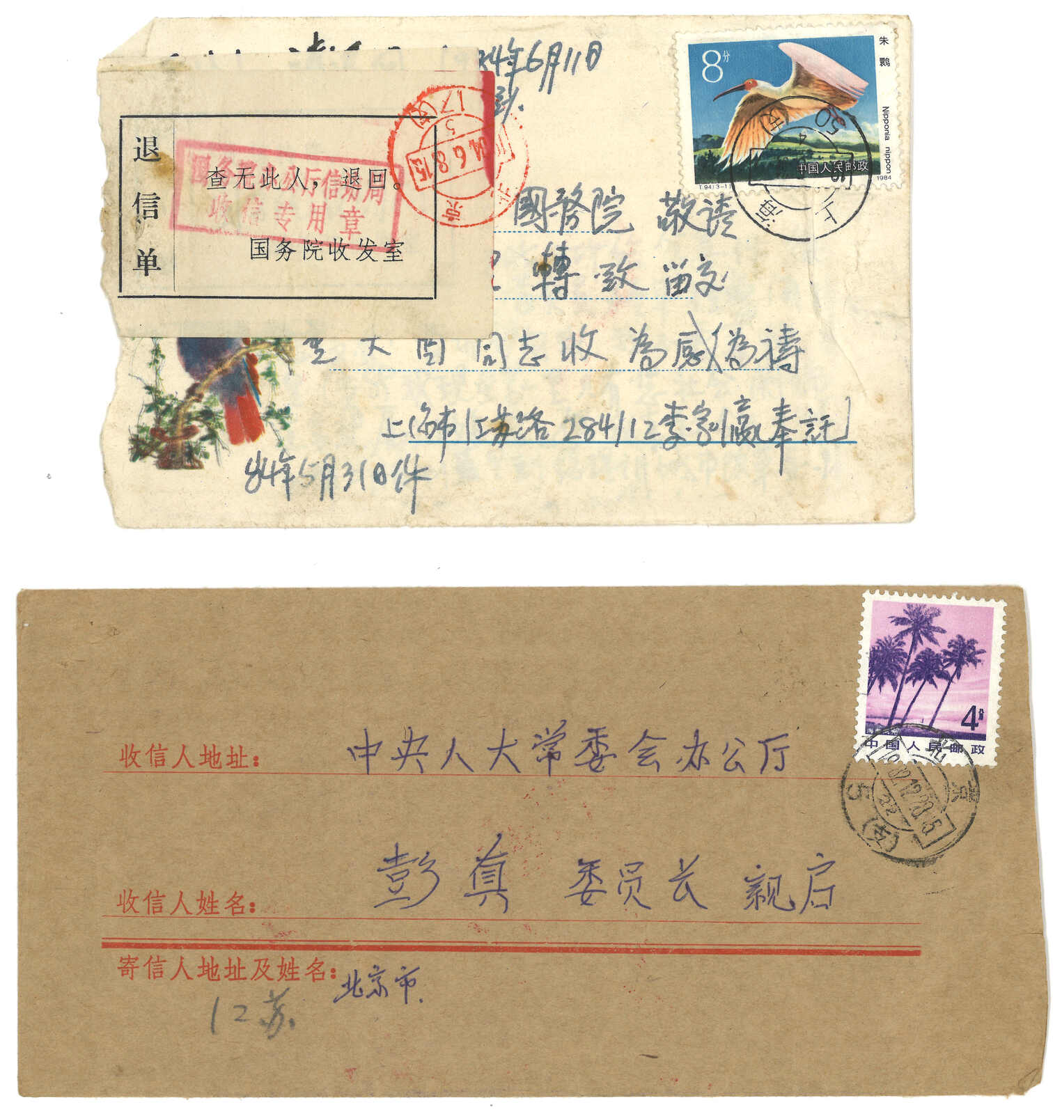 1990年代一組五件寄新中國高級官員之信封,包括彭真及吳邦國。(Image 1) (Image 2) (Image 3)