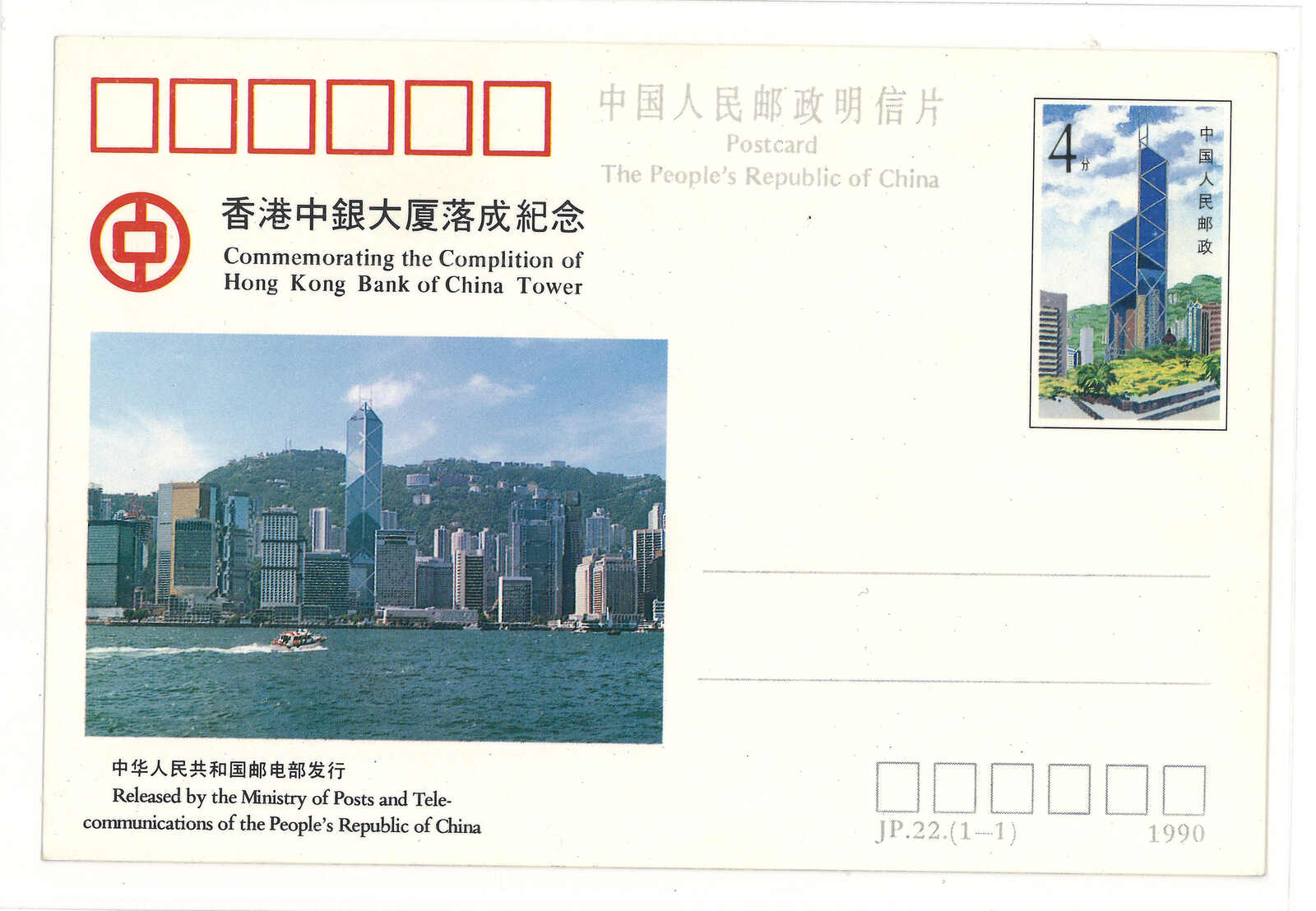 1990年撤銷發行JP22(1-1)香港中銀大廈落成紀念4分郵資片新。(Image 1)