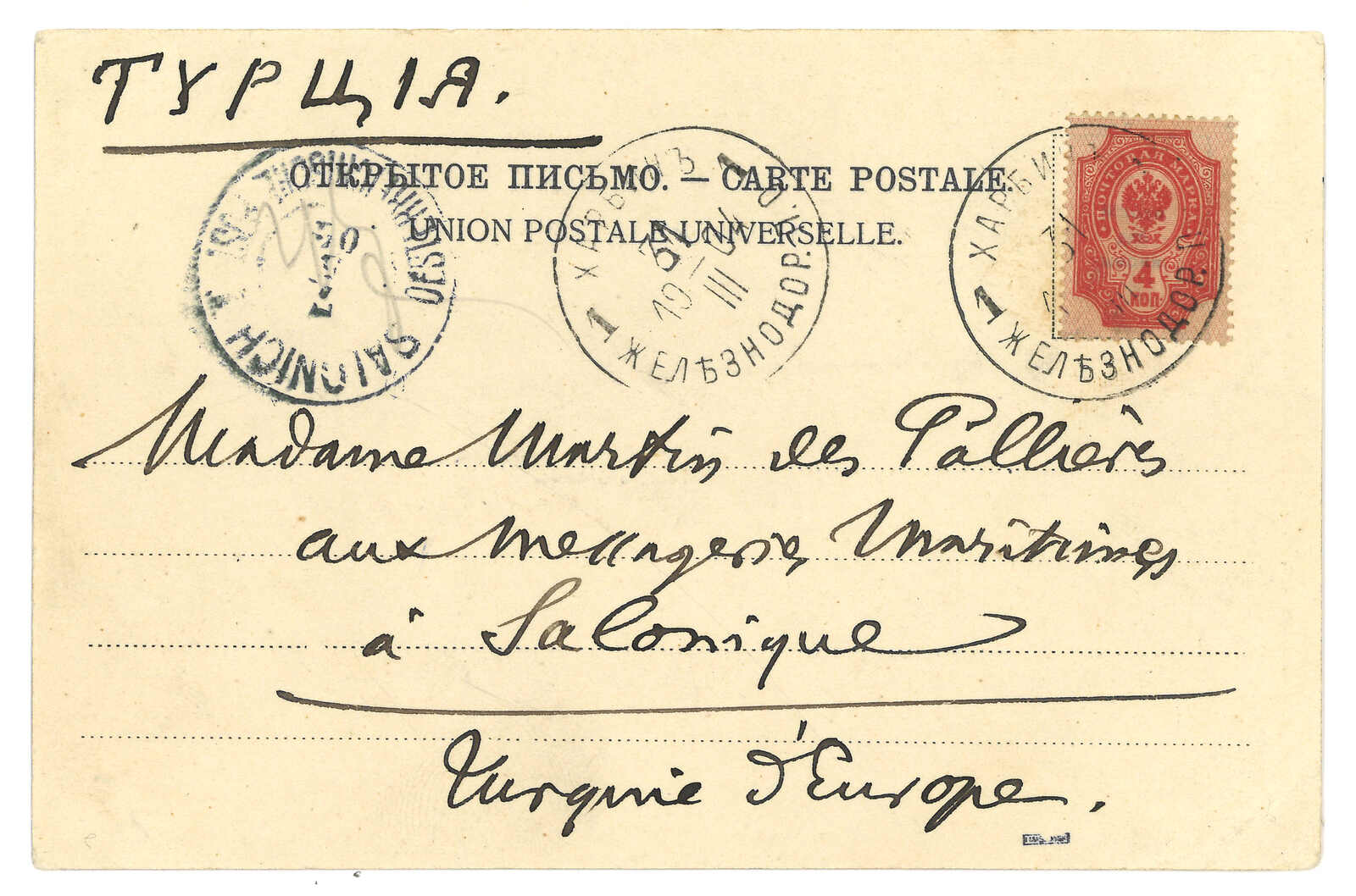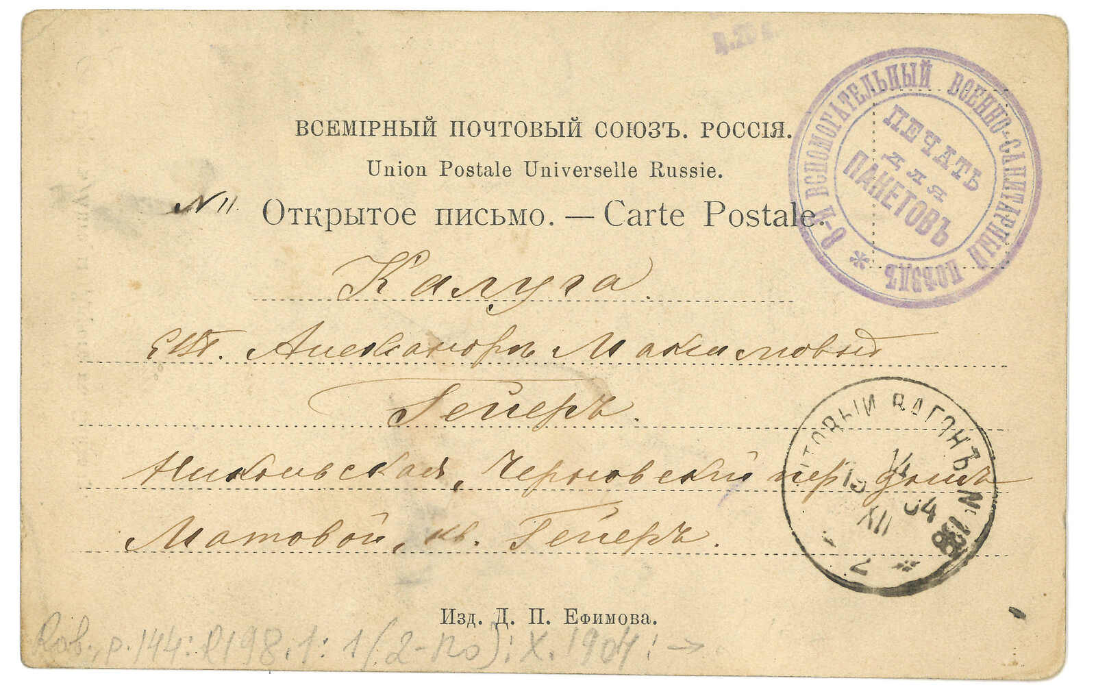 2628 image1903 a group of 3 picture postcards and stationery card from Port Arthur Russian PO, f.w. Arms with or without KATAI ovpt, tied by 17th FPO in 1903. Transit Postal Wagon 260 to Germany or Romania.