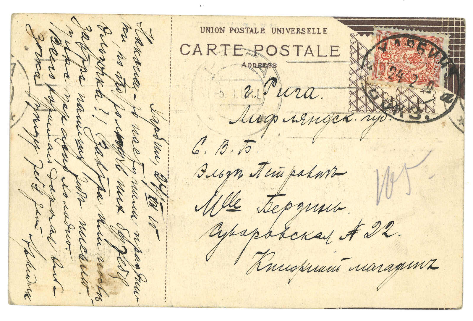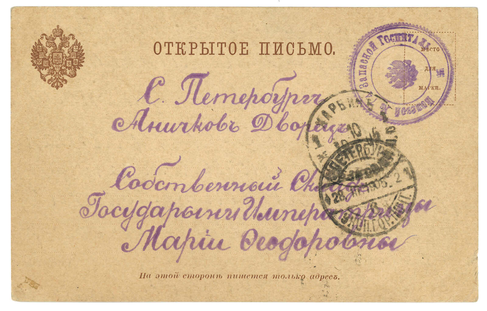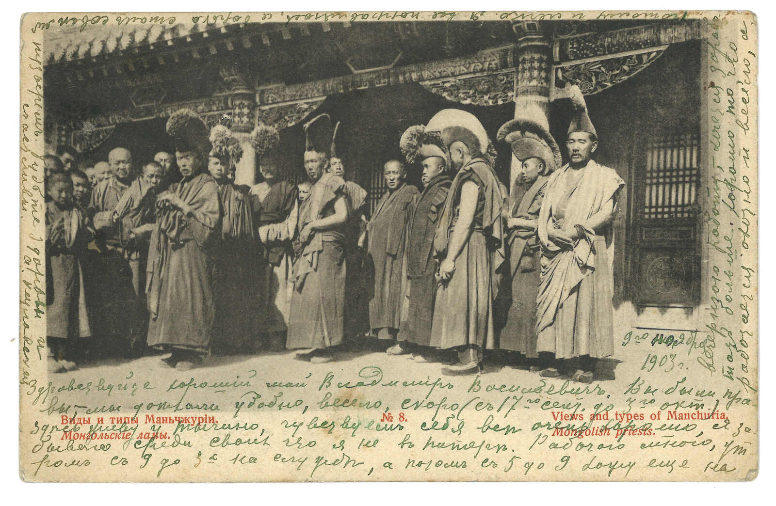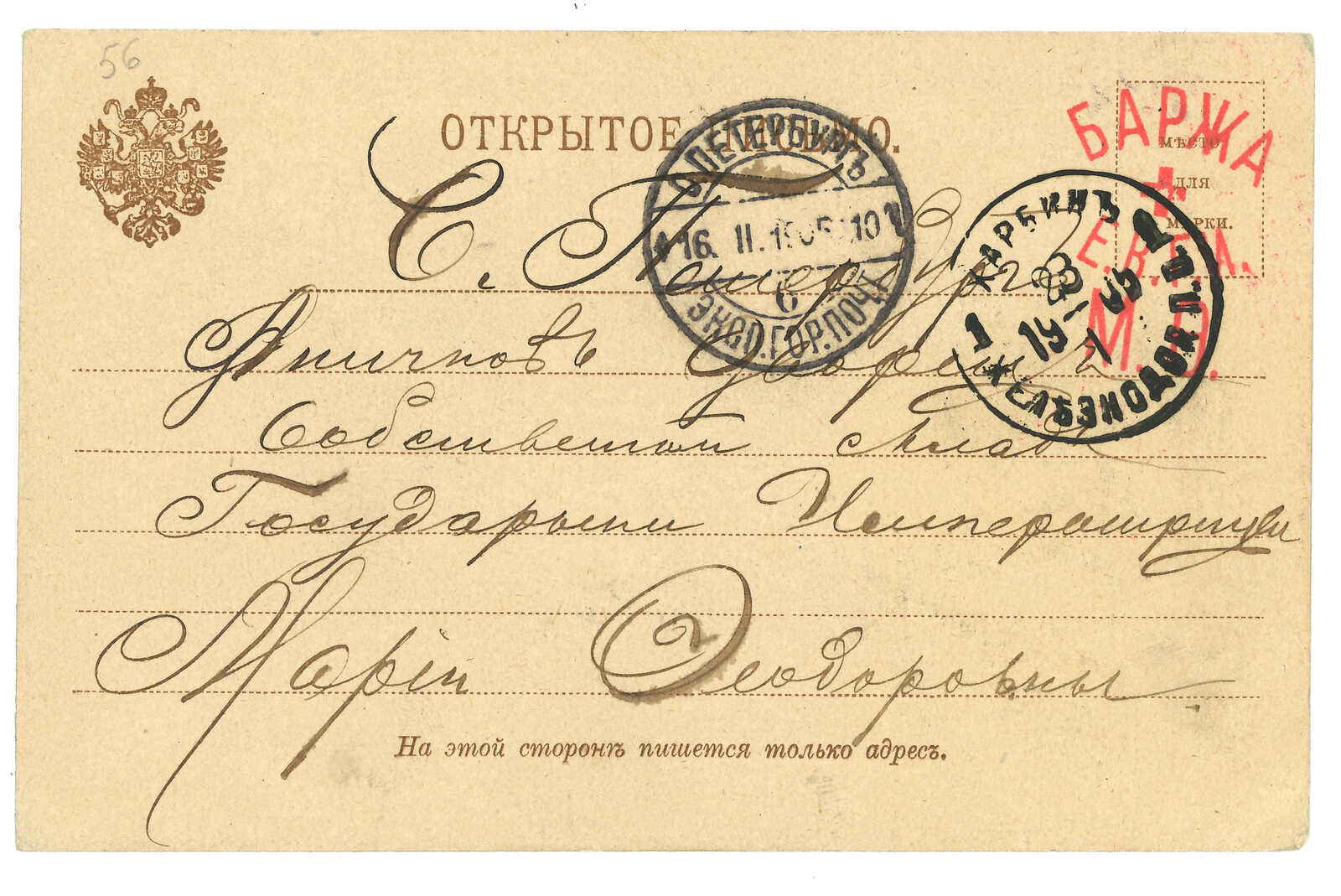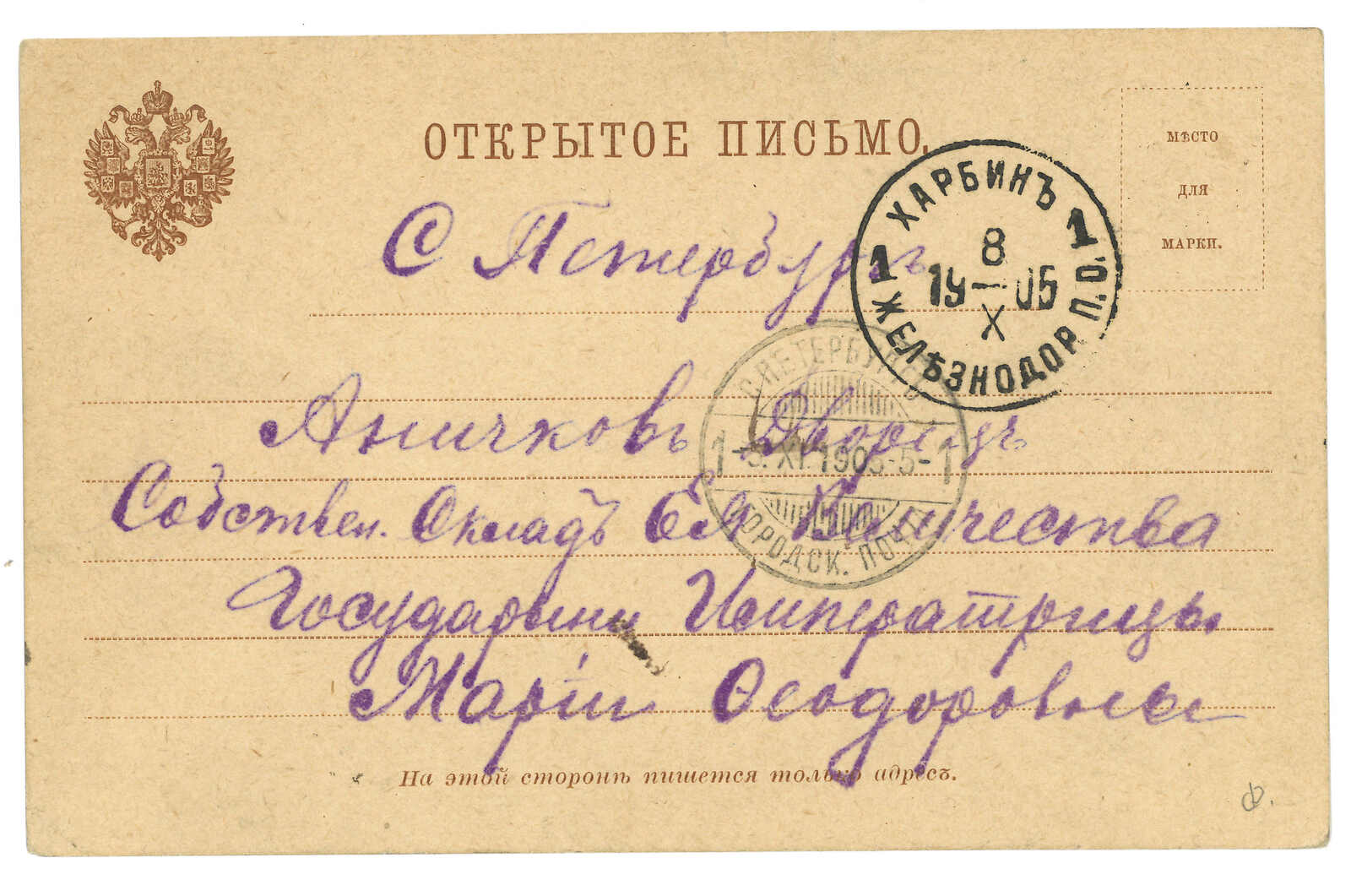 1903.6.16 哈爾濱寄聖彼得堡。圖片明信片,貼軍徽圖3戈比,銷哈爾濱中央車站T&S 1型日戳。7.1抵聖彼得堡。(Image 1) (Image 2) (Image 3) (Image 4)