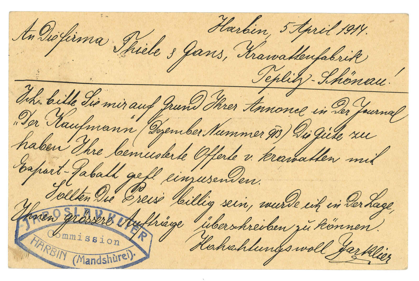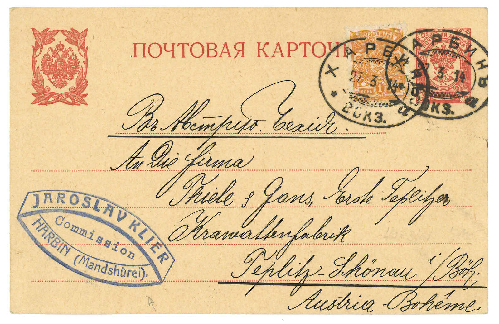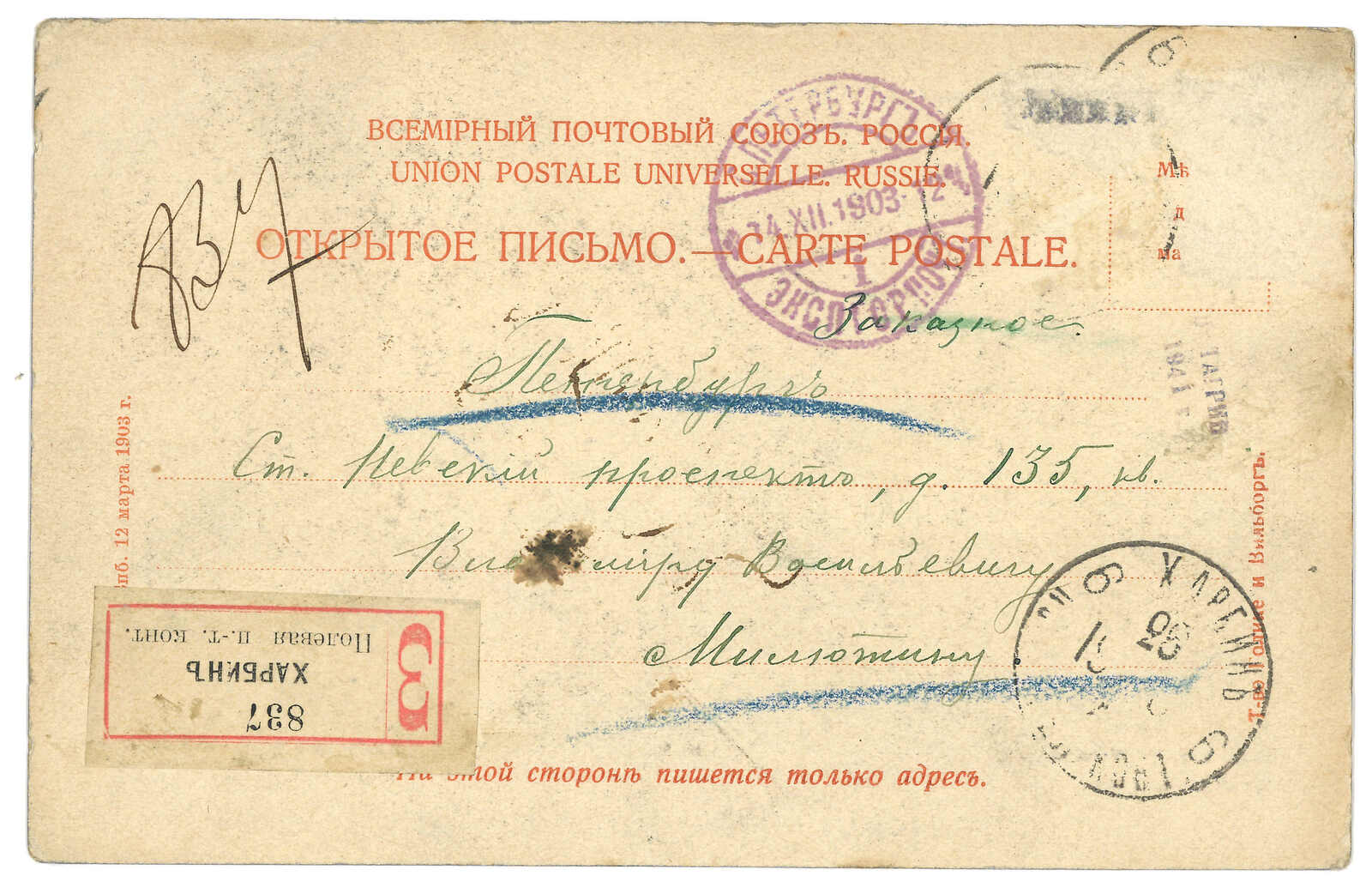 1903.1.13 俄國4戈比加蓋KITAI郵資片,寄自哈爾濱,銷哈爾濱俄局T&S 4型日戳。於滿洲使用加蓋KITAI郵資用品亦較少見。片左上角有損。(Image 1) (Image 2) (Image 3) (Image 4) (Image 5)