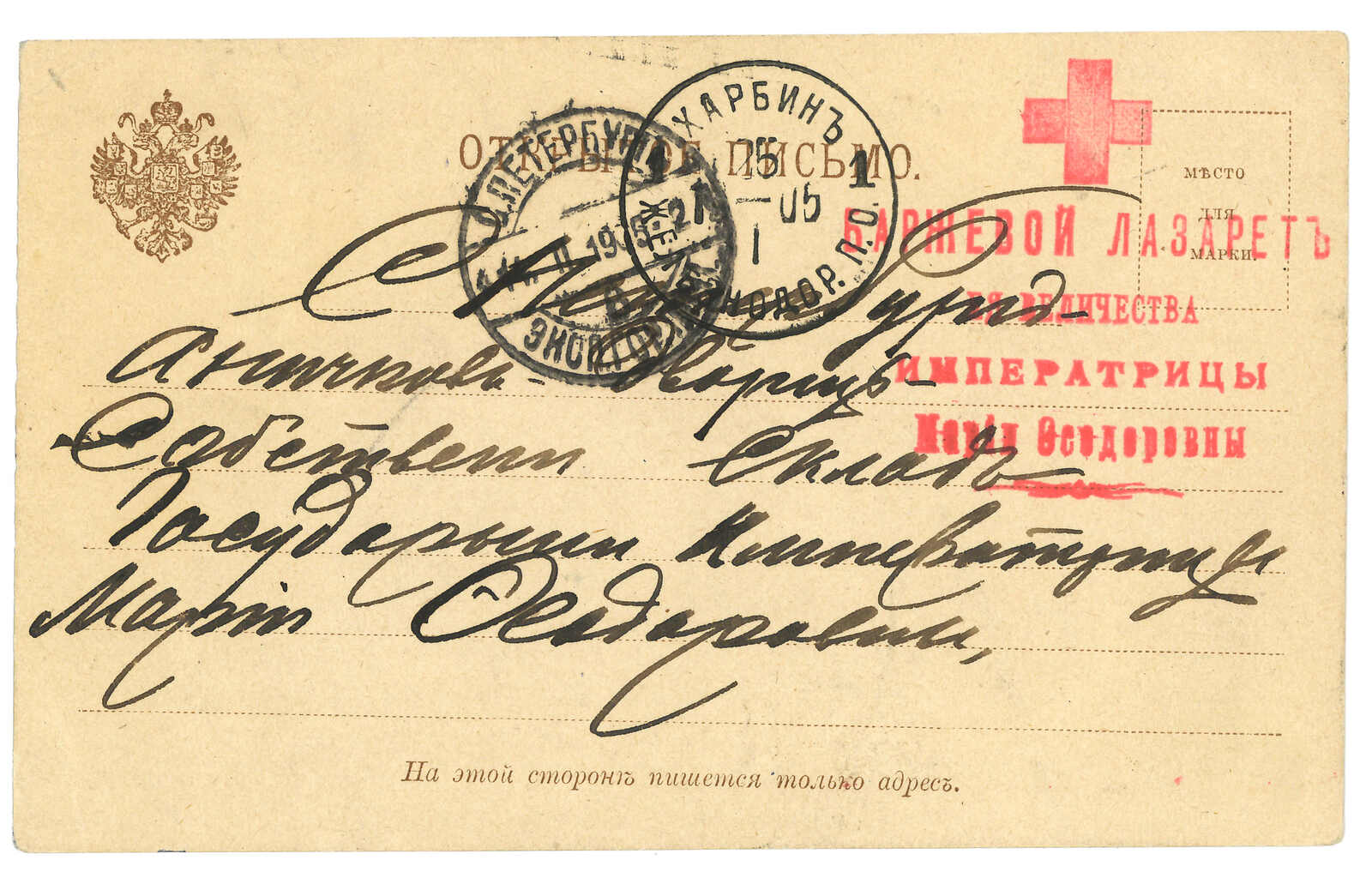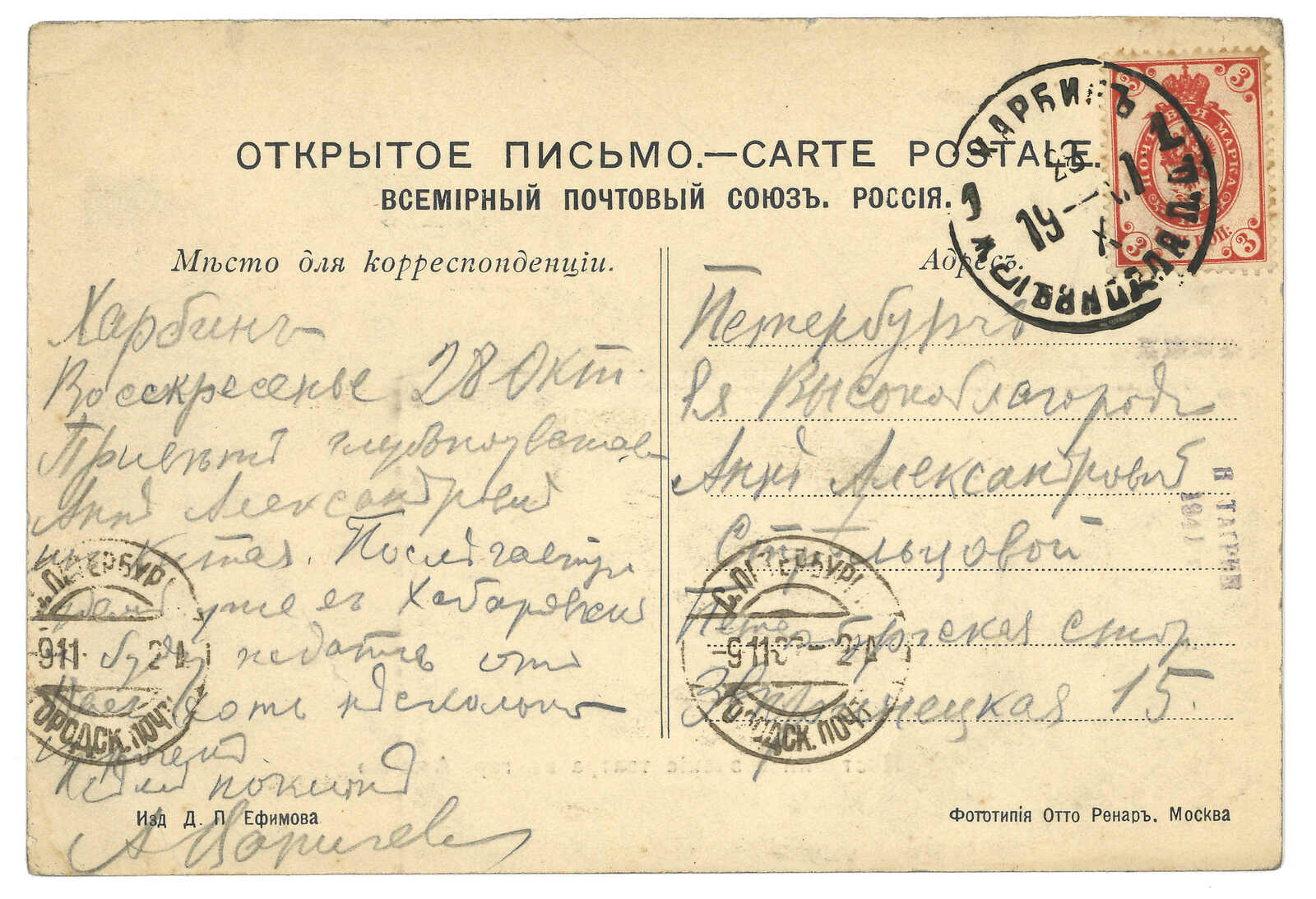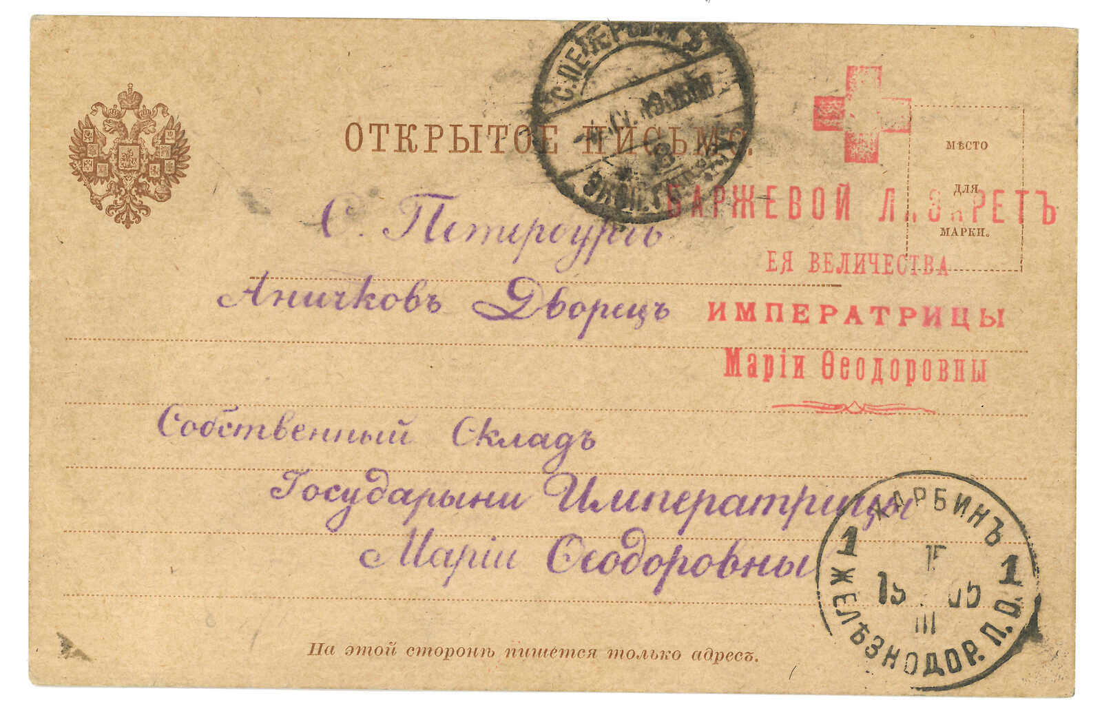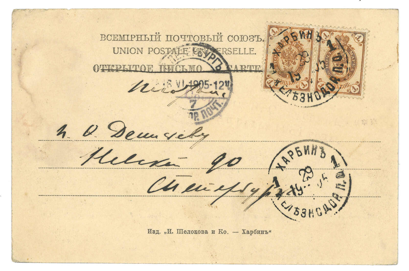 2644 image1903 Harbin (16 Jun) to St. Petersburg. Picture postcard, f.w. Coat of Arms 3k, tied by Harbin Central Station T&S type 1 cds. Arrived St. Petersburg (1 Jul).
