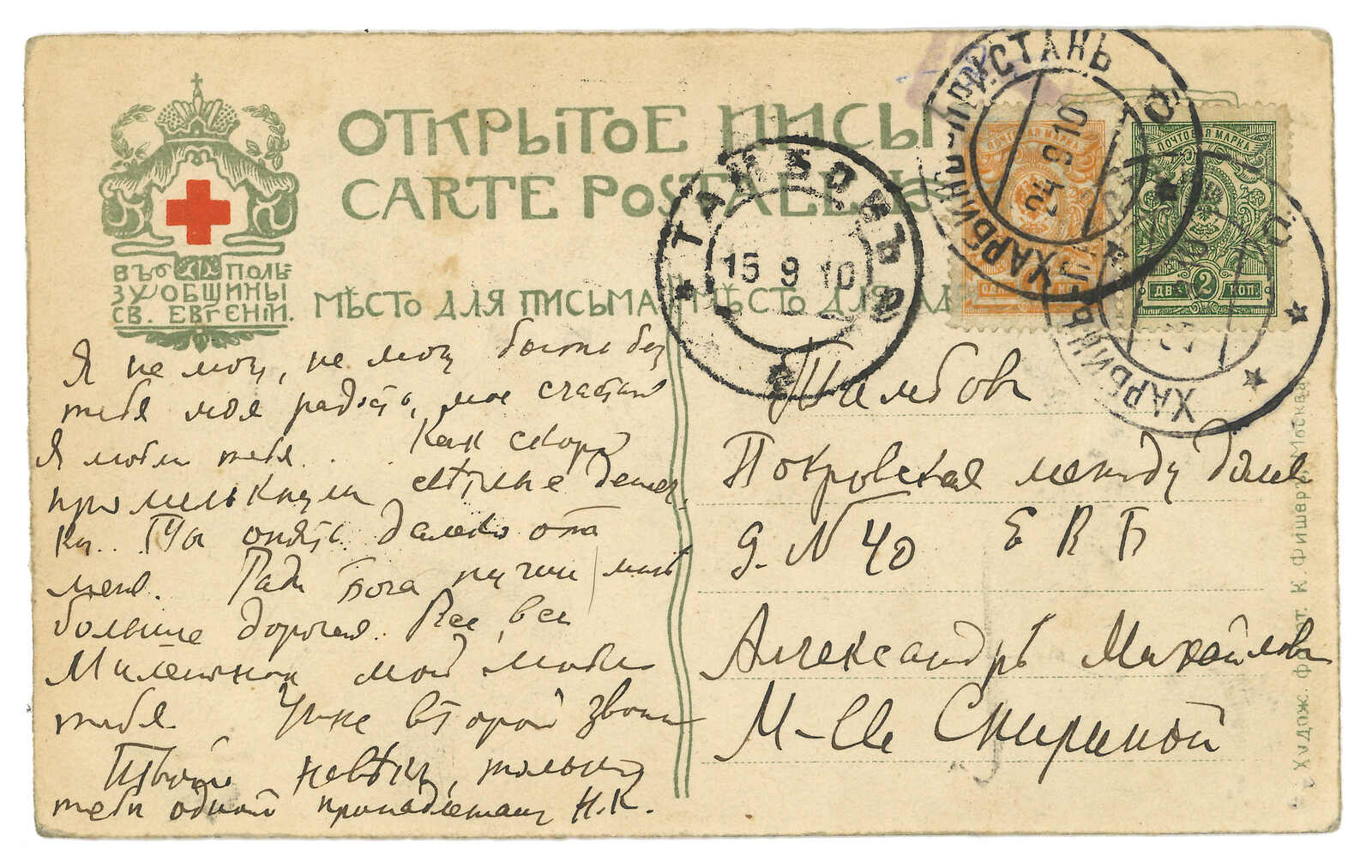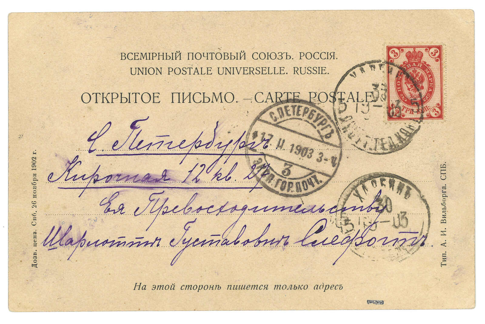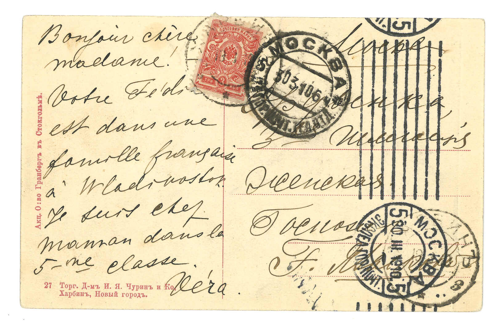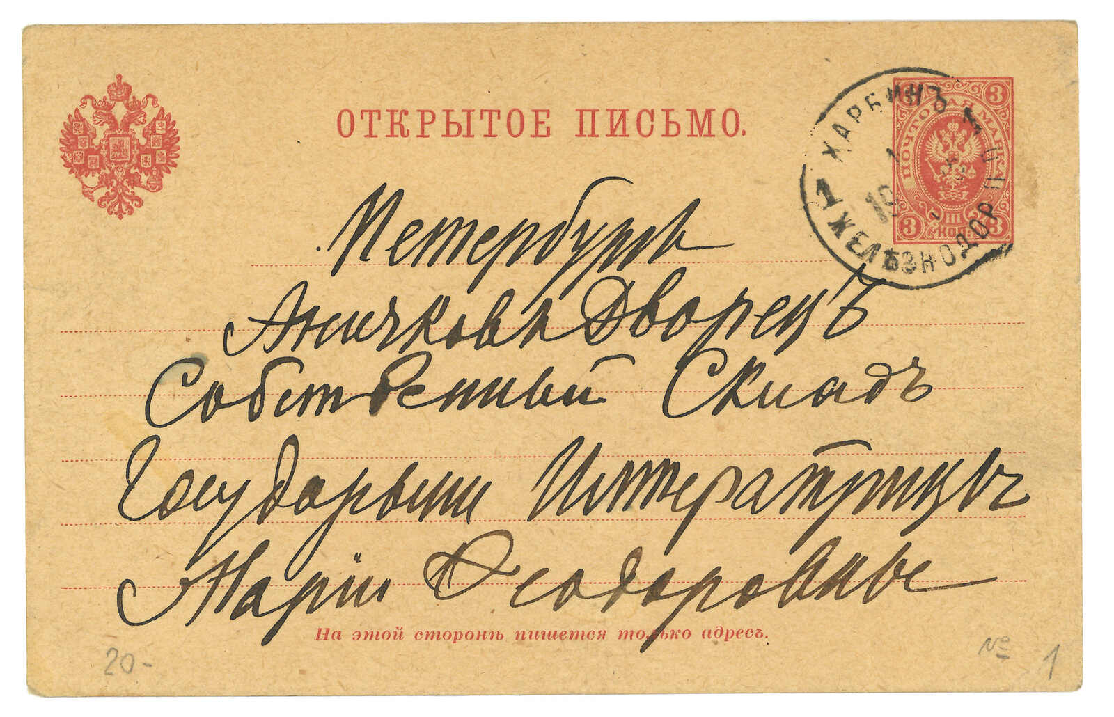 2644 image1903 Harbin (16 Jun) to St. Petersburg. Picture postcard, f.w. Coat of Arms 3k, tied by Harbin Central Station T&S type 1 cds. Arrived St. Petersburg (1 Jul).