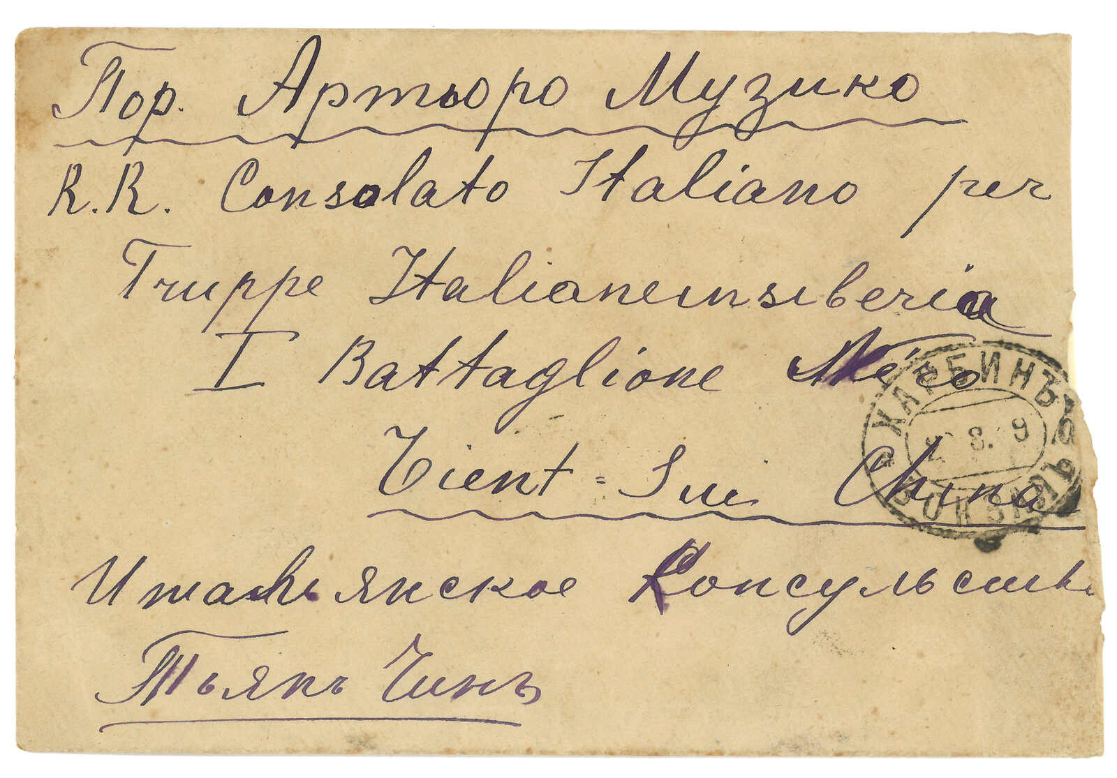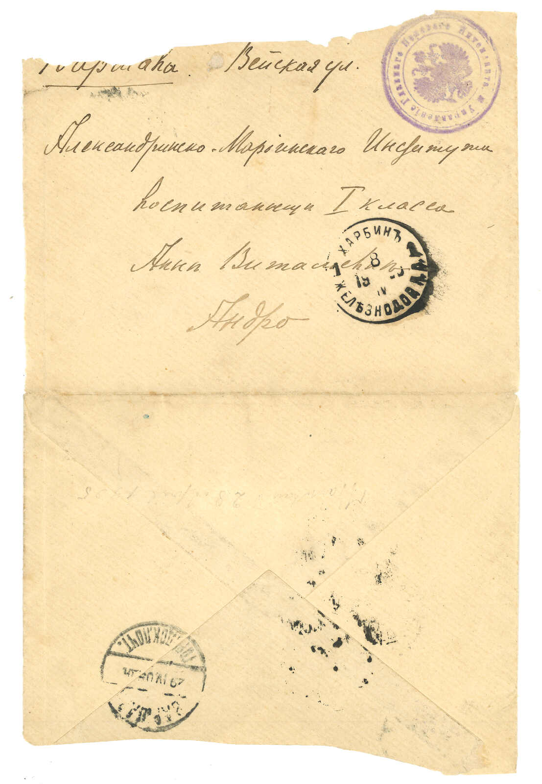 2626 image1900 (Sep) A pair of covers from St. Petersburg to 3rd East Siberian Infantry Brigade, Port Arthur, f.w. Coat of Arms 7k in pair. Showing “Removed from Box” Russian h.s. and via Tientsin annotation. Arrived Port Arthur Russian PO. Rare Russian military correspondence during Boxer Uprising related to Port Arthur. Long transit time. Cover roughly opened.