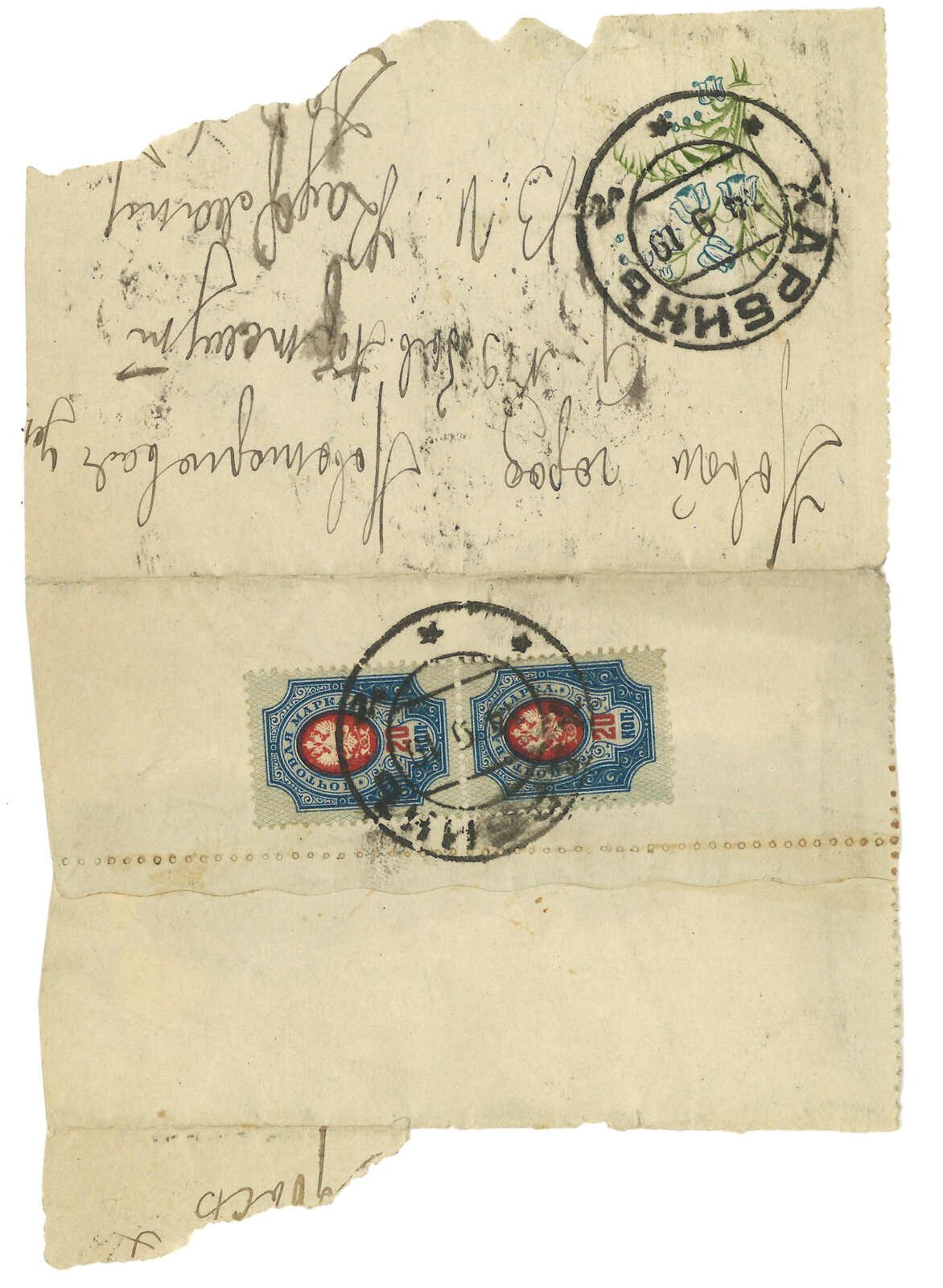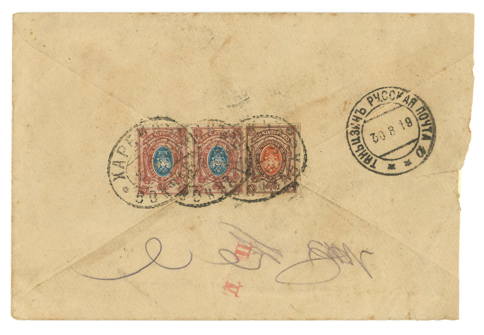 2650 image1918 Harbin Pier (22 Jan) to French Indochina, f.w. Russian Coat of Arms 15k + 5k, tied by Harbin Pier cds., alongside with Russian censor mark. Transit Shanghai Chinese PO (24 Feb). Arrived Tuyen Quang (6 Mar) with Tonkin oval censor mark. Sending to French Indochina from Russian PO is rather scarce.