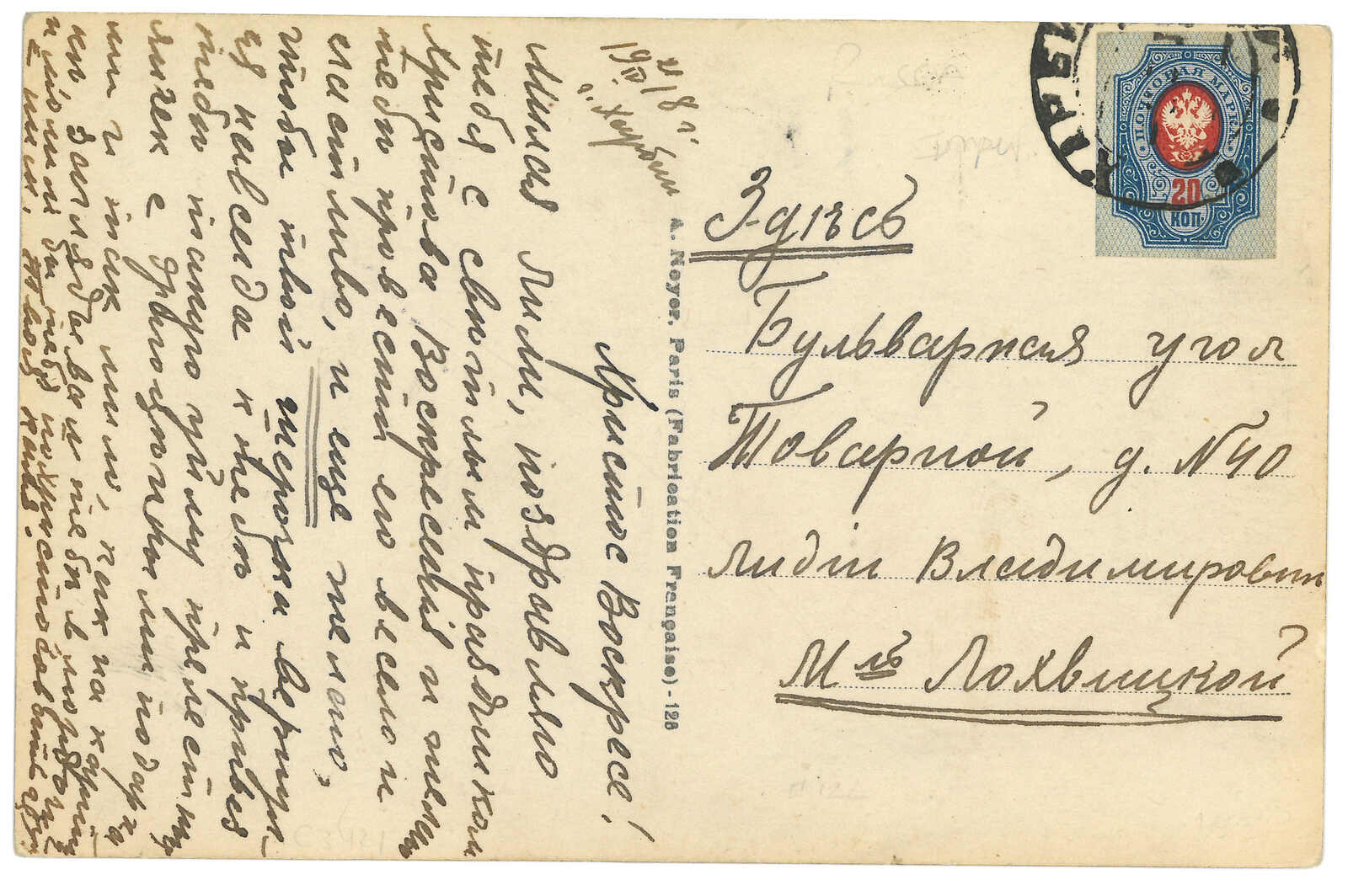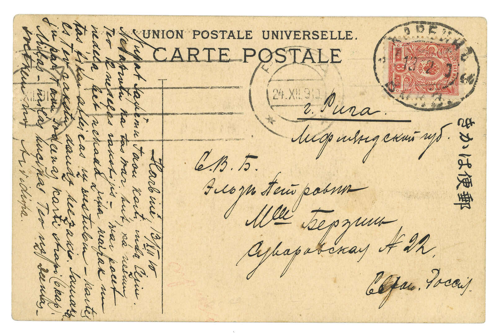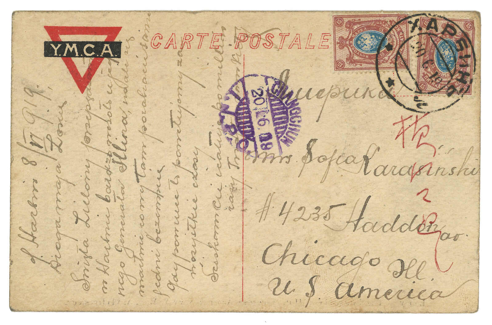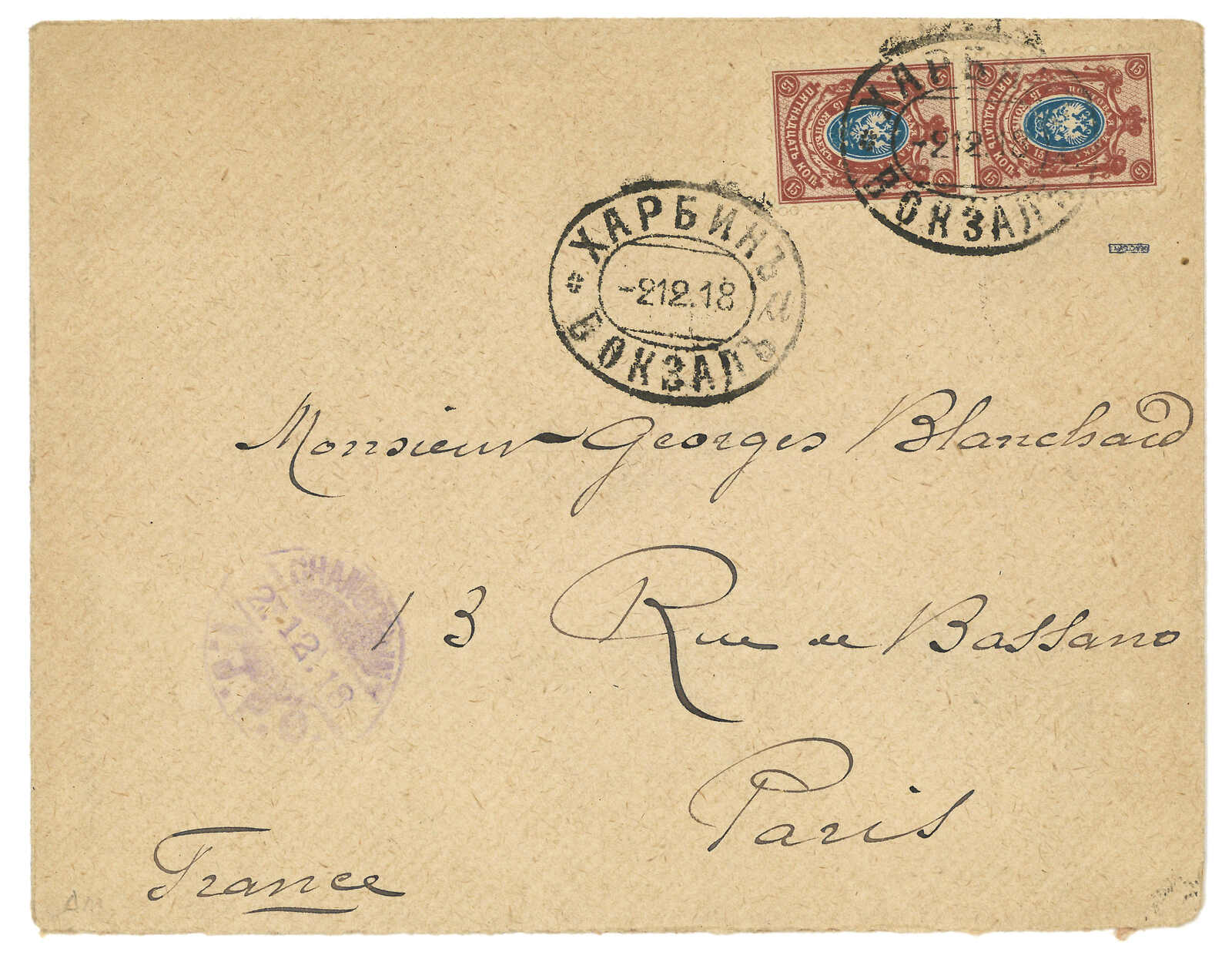 1918.1.22 哈爾濱碼頭寄法屬印支,貼俄國軍徽圖15戈比 + 5戈比,銷哈爾濱碼頭日戳,旁鈐俄文檢查章。2.24經上海中國郵局。3.6抵Tuyen Quang,鈐東京檢查章。由俄國客郵局寄印支十分少見。(Image 1) (Image 2)