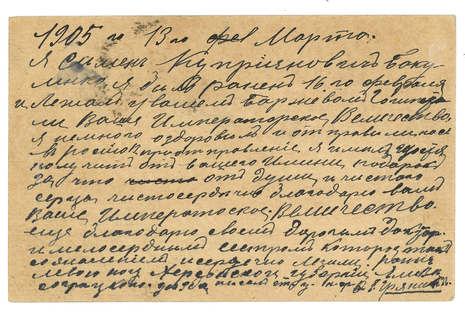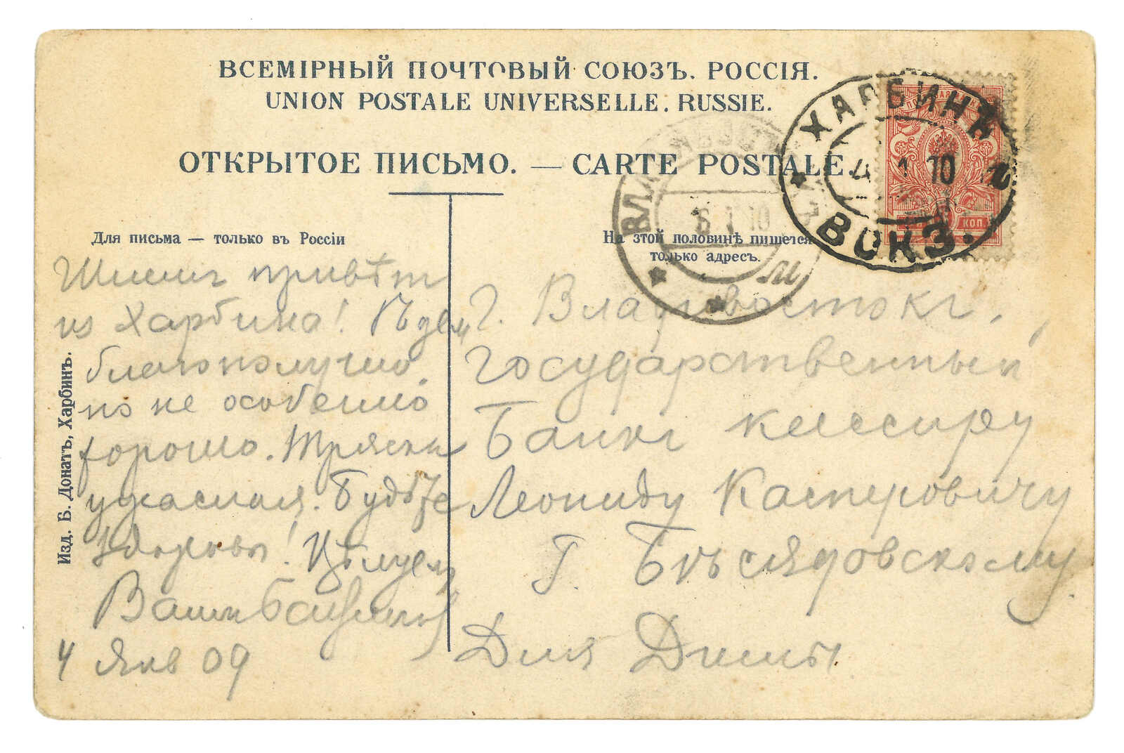 2633 image1903 (13 Jan) Russian 4k ovpt. KITAI stationery card from Harbin, tied by Harbin Russian PO T&S type 4 cds. Usage of ovpt. KITAI stationery in Manchuria is rather scarce. Top left corner damaged.