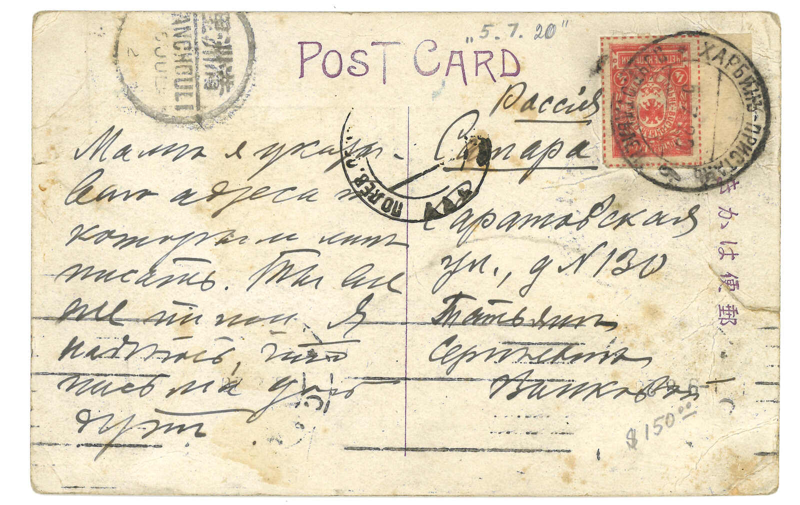 2634 cover image1903-1919 a group of 8 covers and postcards from Harbin Russian PO, f.w. Coat of Arms issues, tied by T&S type 2, 3, 4 cds etc.