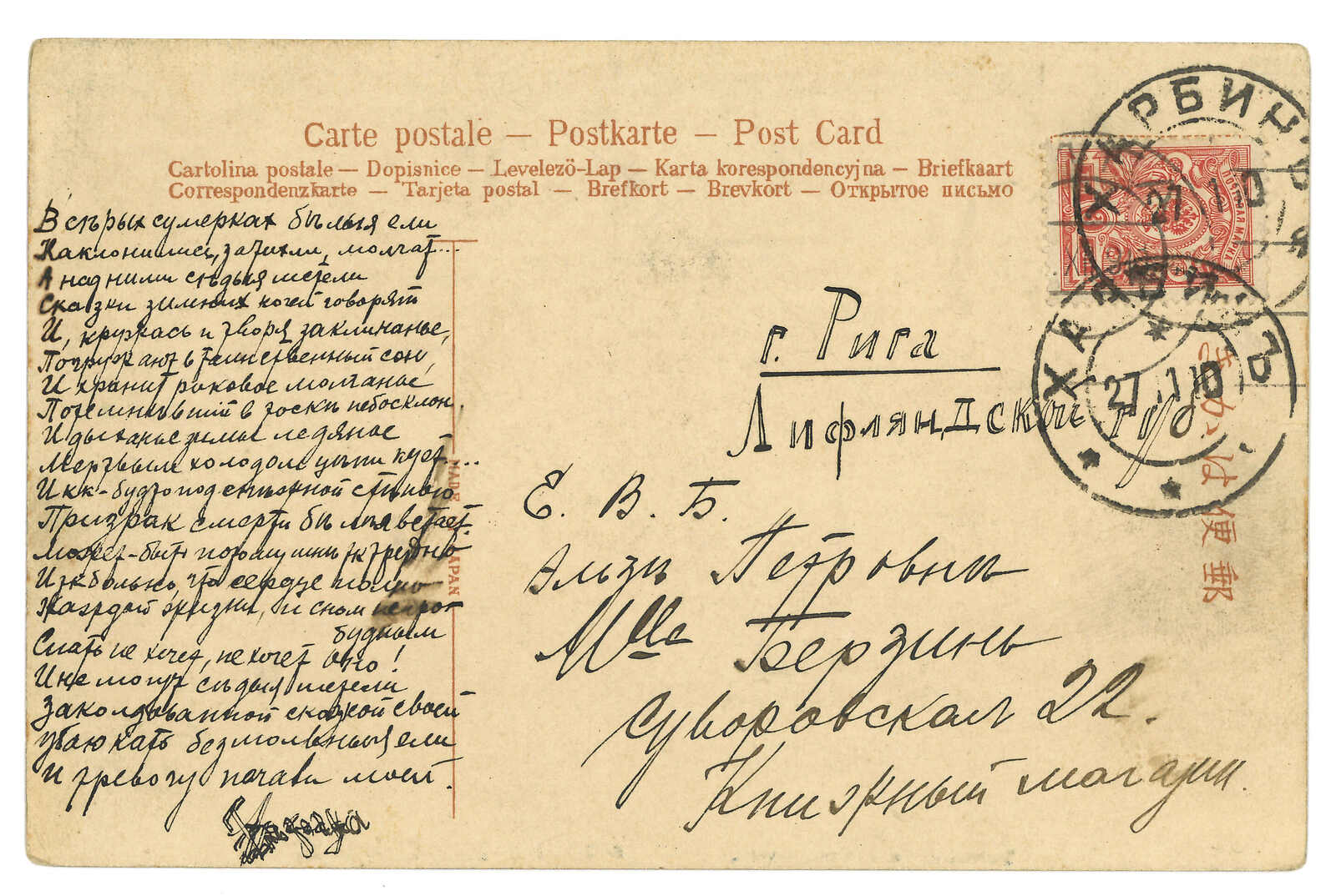1910至1917年一組約11件哈爾濱俄局封片,當中較出色者包括貼用報值標籤及郵局局長橫戳之信封、貼用羅曼諾夫票之郵例、郵資封皮、寄南非郵例等,十分豐富,別具特色。請預覽。(Image 1) (Image 2) (Image 3) (Image 4) (Image 5) (Image 6) (Image 7) (Image 8) (Image 9) (Image 10) (Image 11) (Image 12) (Image 13) (Image 14) (Image 15) (Image 16) (Image 17) (Image 18) (Image 19) (Image 20) (Image 21) (Image 22)
