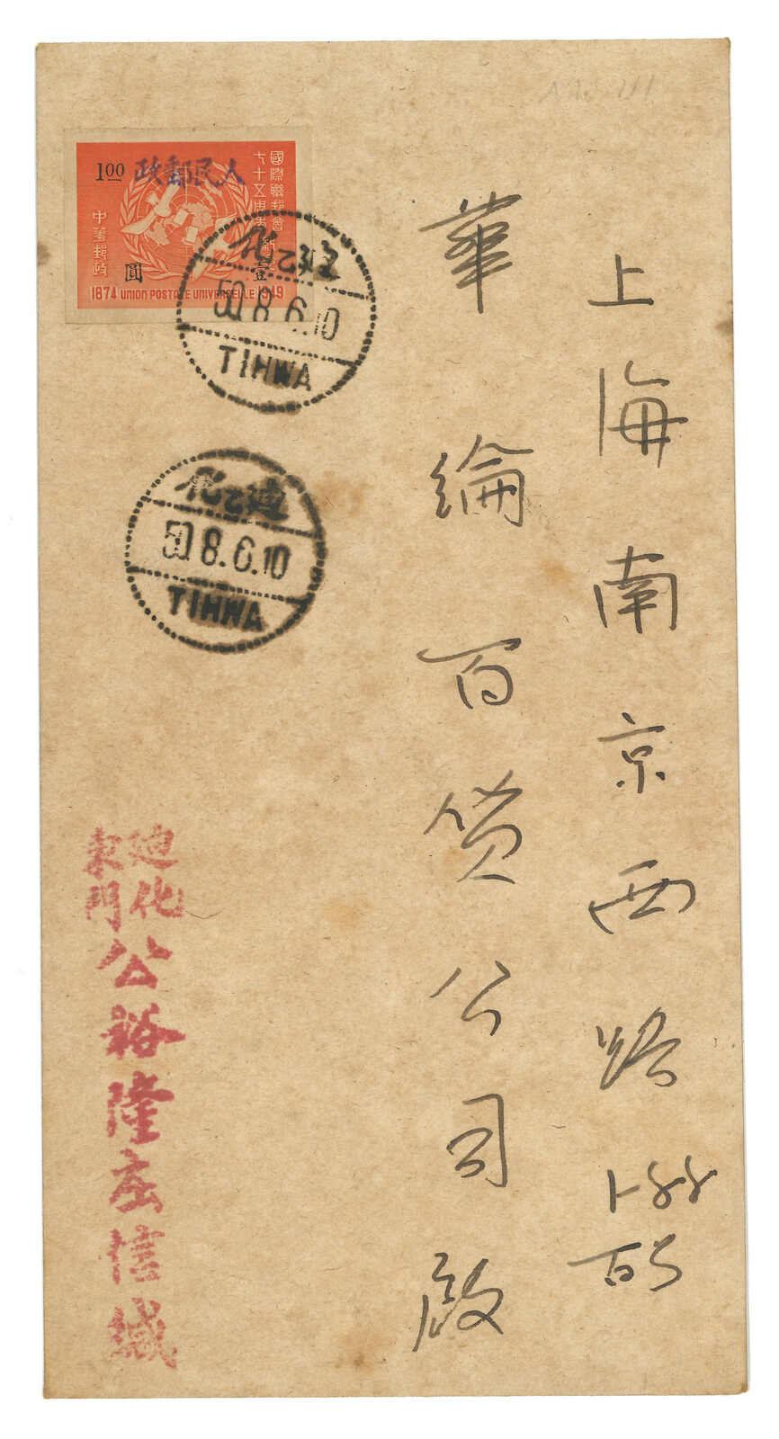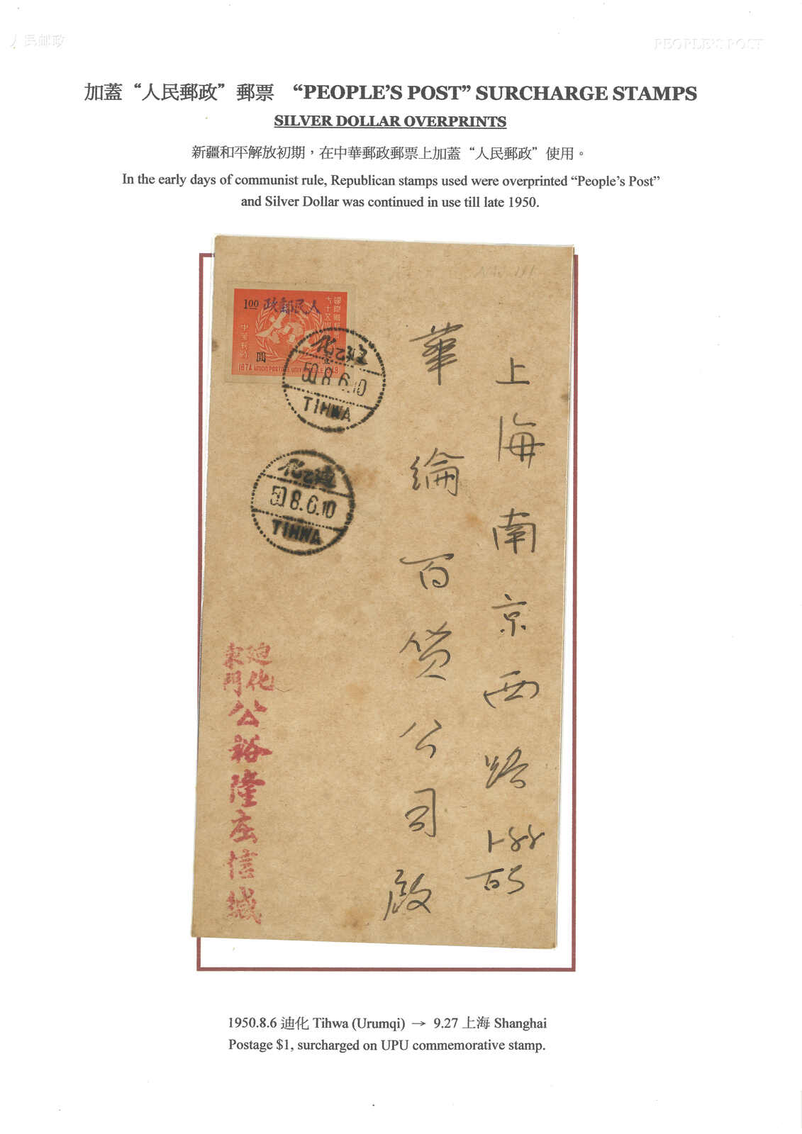 1950.8.6 迪化寄上海,貼新疆手蓋“人民郵政”於萬國郵盟1元,銷迪化三格點線漢英日戳。無中轉或到達戳。(Image 1) (Image 2) (Image 3)