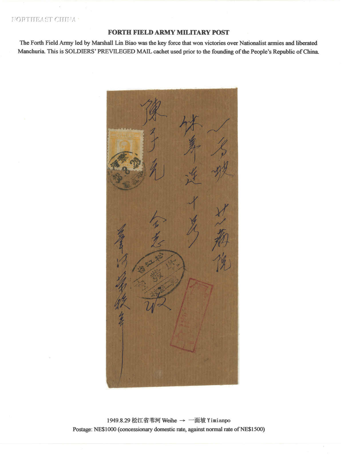 3314 cover image1949 (29 Aug) Military cover from Weiho to Imienpo, f.w. Northeast Directorate General of Post and Telecommunications Chairman Mao $1000 for concessionary rate (normal rate should be $1500), tied bby Weiho cds., along with "Concessionary Military Mail" cachet.