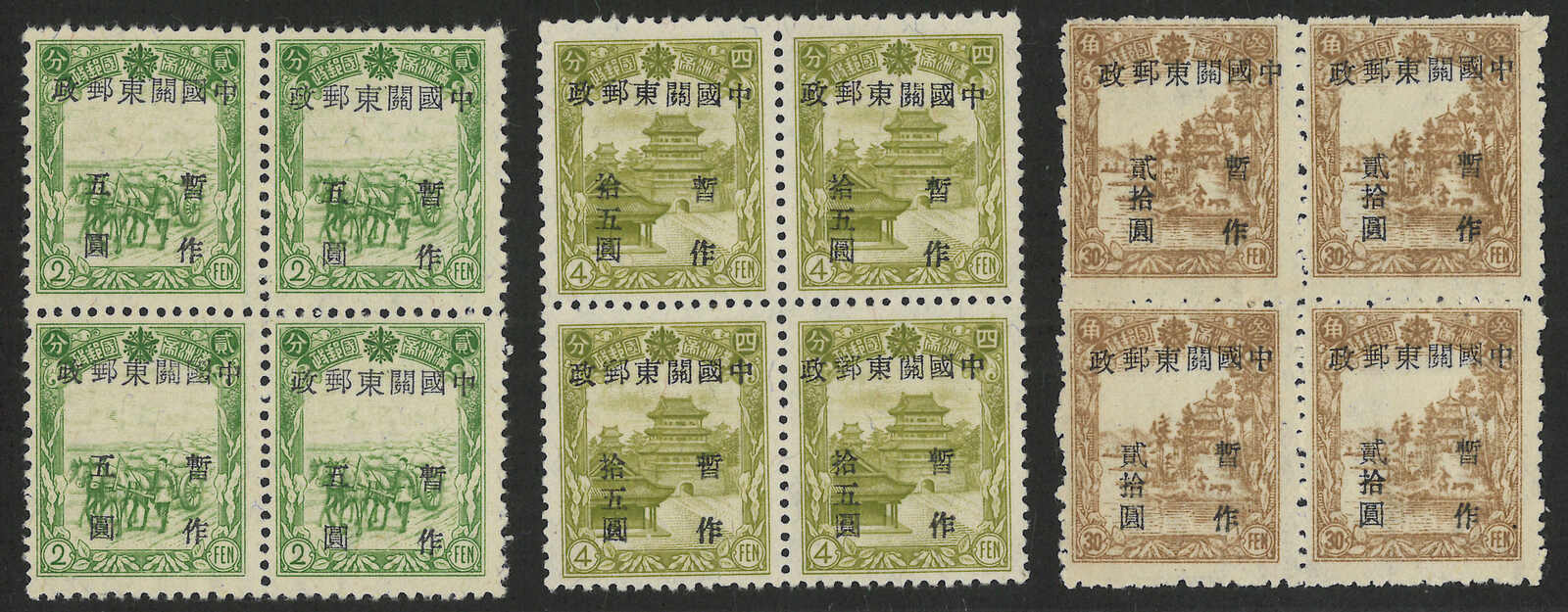 3308 ** image1947 Kwantung Post surch $5/2f, $15/4f + $20/30f Manchukuo issue in block of 4 (Yang AD28-30), MNH.