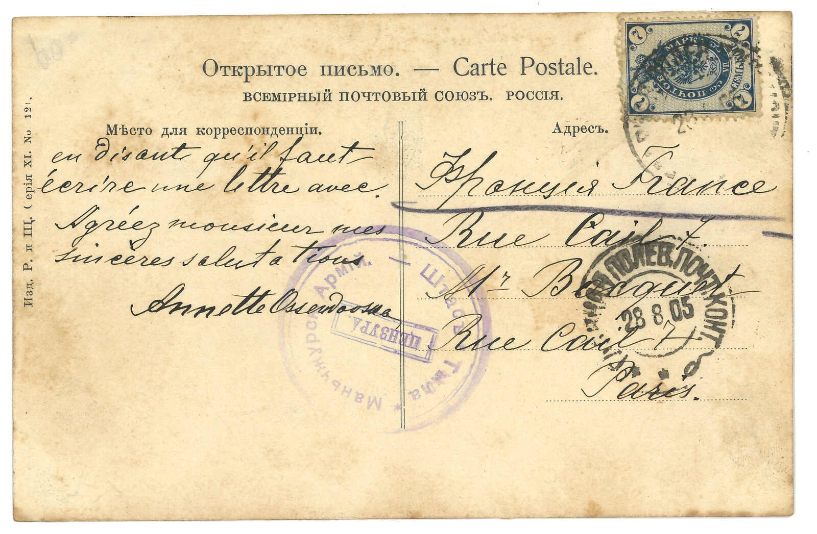 1905 Harbin (28 Aug) to France. Picture postcard, applied with Main Field PO cds. F.w. Coat of Arms 7k, tied by Harbin Russian PO (28 Aug) cds. Showing Manchurian Army Headquarters Censorship circular seal.