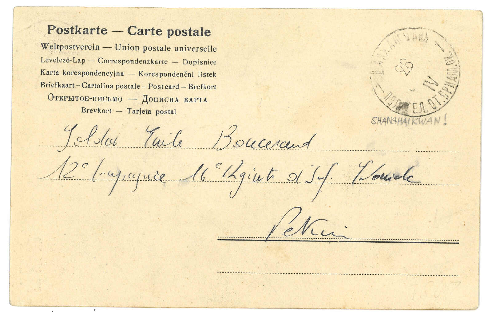 1902年山海關寄法國。圖片明信片,貼軍徽圖4戈比,銷山海關俄局T&S 2型日戳。抵法國。Kennth G Clark著《The History and Postal History of Japan's War》第二冊第152頁圖47原件。(Image 1)
