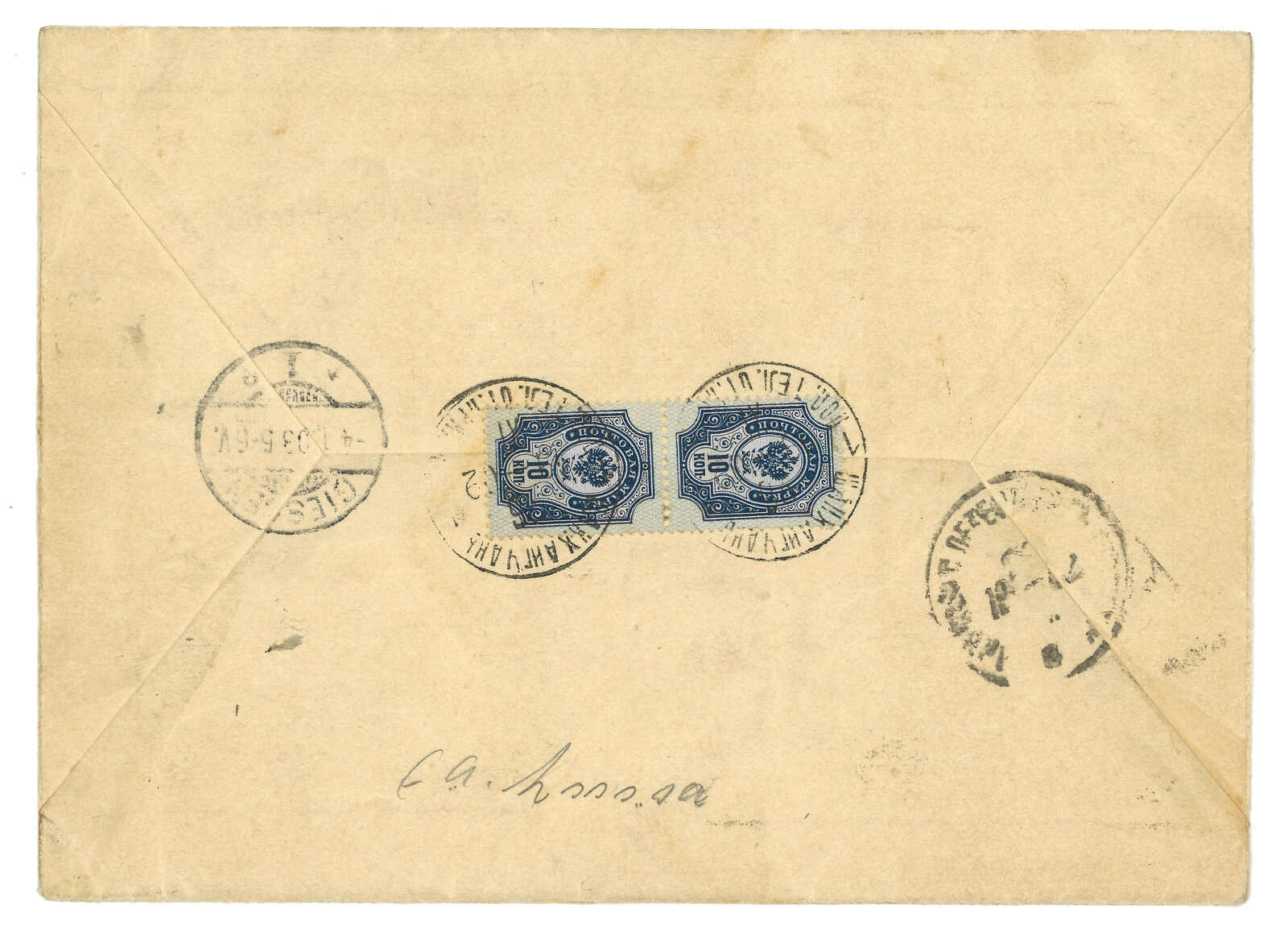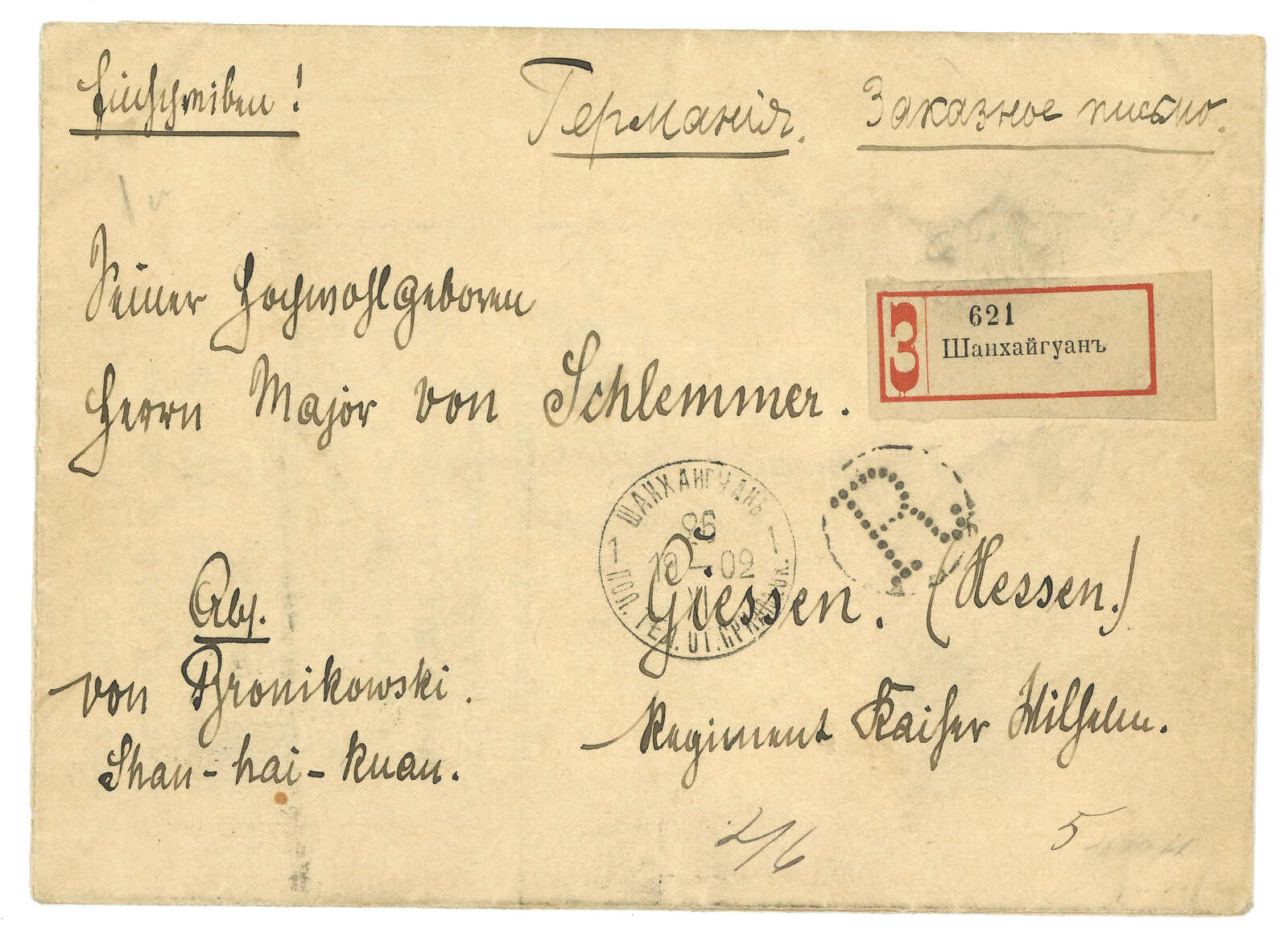 1902.11.26 山海關寄德國。掛號封,背貼軍徽圖10戈比雙連,銷珍罕少見之山海關俄局T&S 2型日戳。正貼掛號標籤。經聖彼得堡。1.4抵德國。此戳在T&S記錄中僅見一件蓋於無貼票封上作中轉戳的例子。(Image 1)