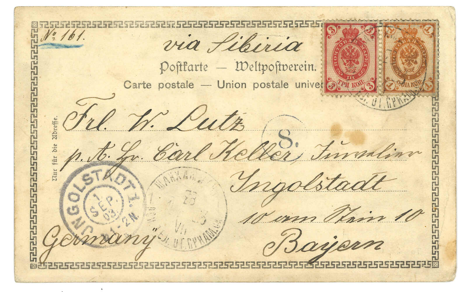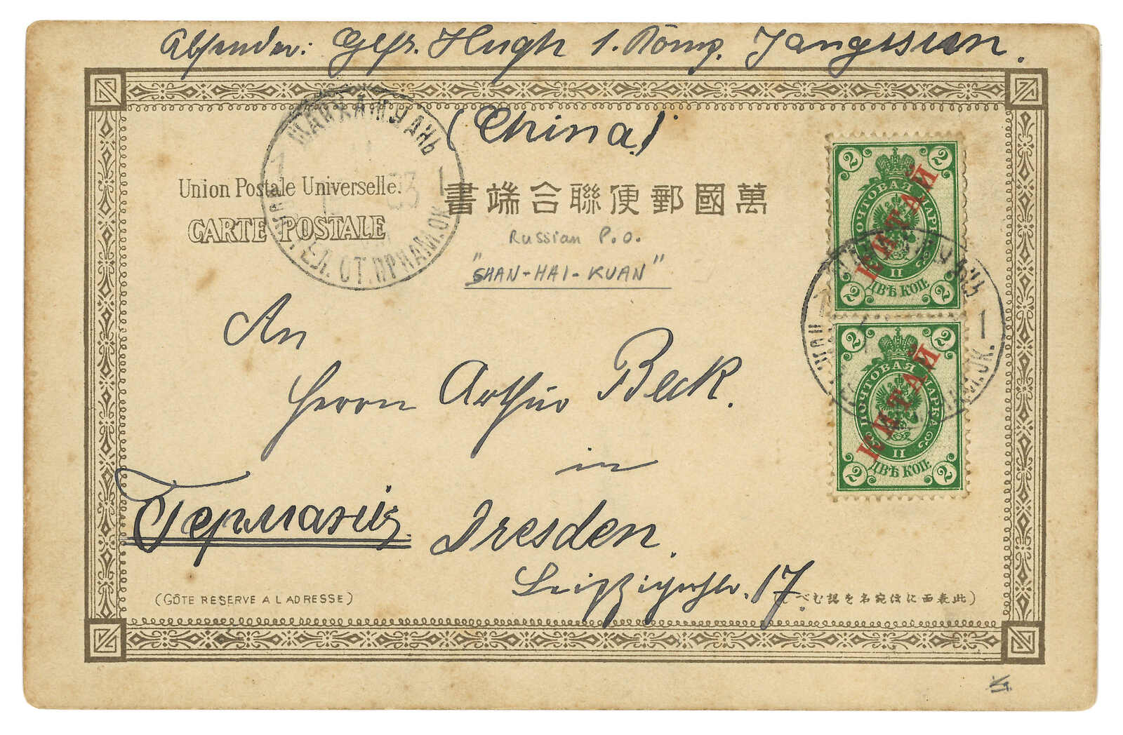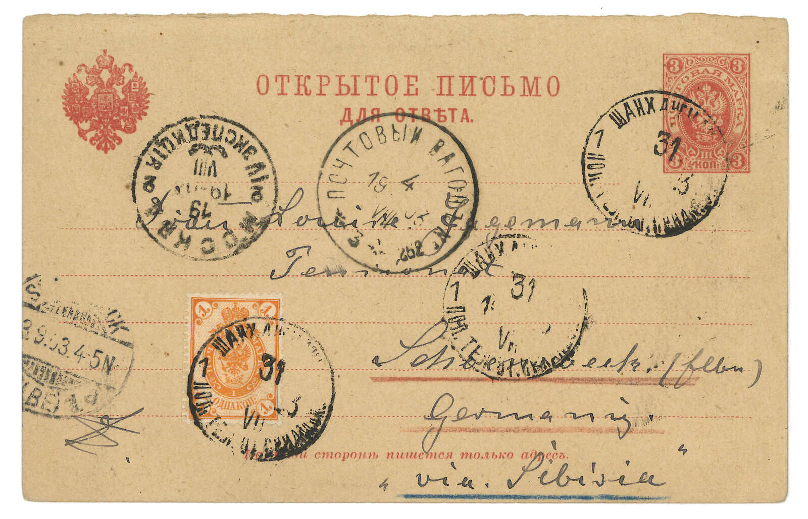 1903 Shanhaikwan (29 May) to Germany. Russian 3k PSC, uprated by 1k, tied by Shanhaikwan Russian PO T&S type 2 cds. Transit Chinese Eastern Railway line 262 (1 Jun) with T&S type 1 serial 7 cds. Arrived Germany (1 Jul).