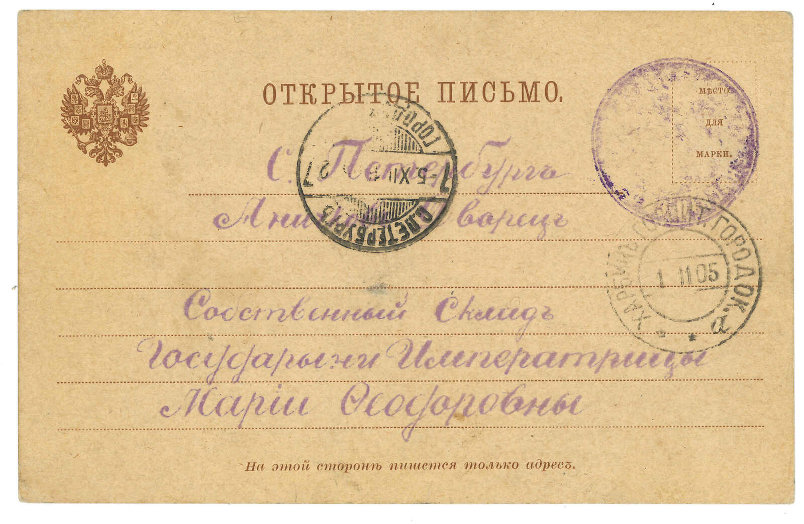 1905 Russia (26 Mar) to Newchwang. Picture postcard, f.w. Coat of Arms 3k, tied by obliterator., alongside with St. Petersburg cds. Arrived Newchwang with FPO No. 13 cds (14 Apr).