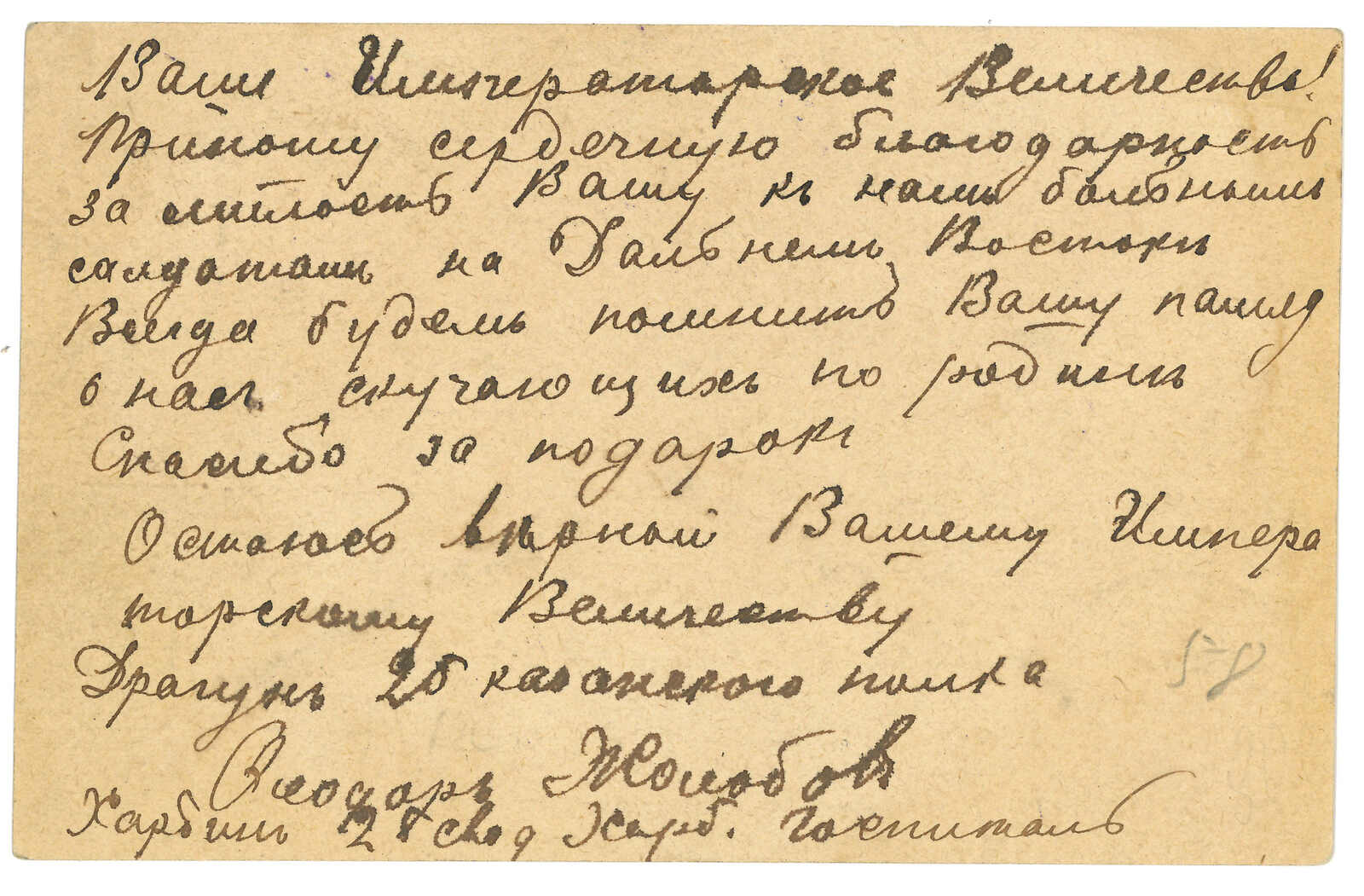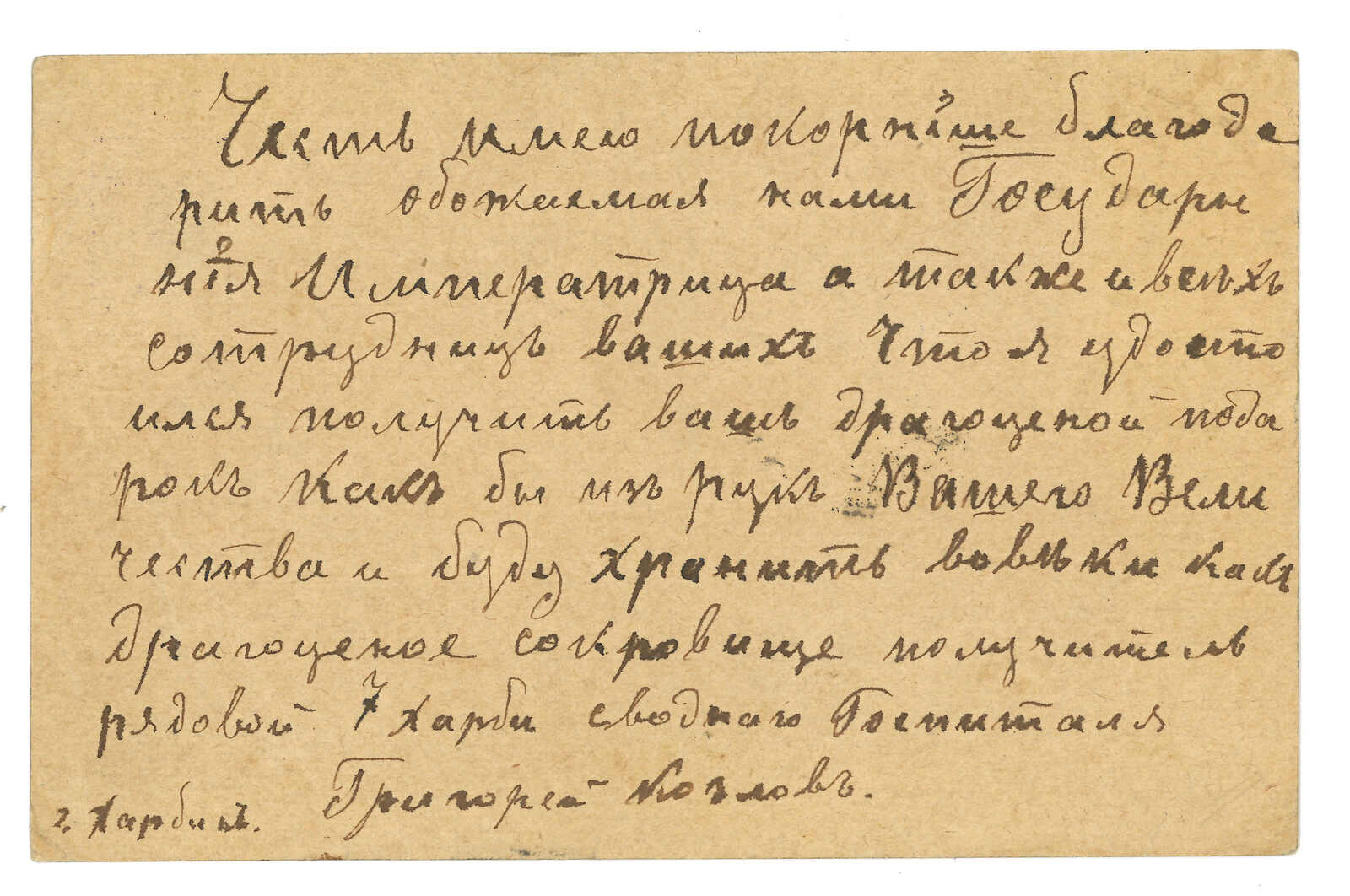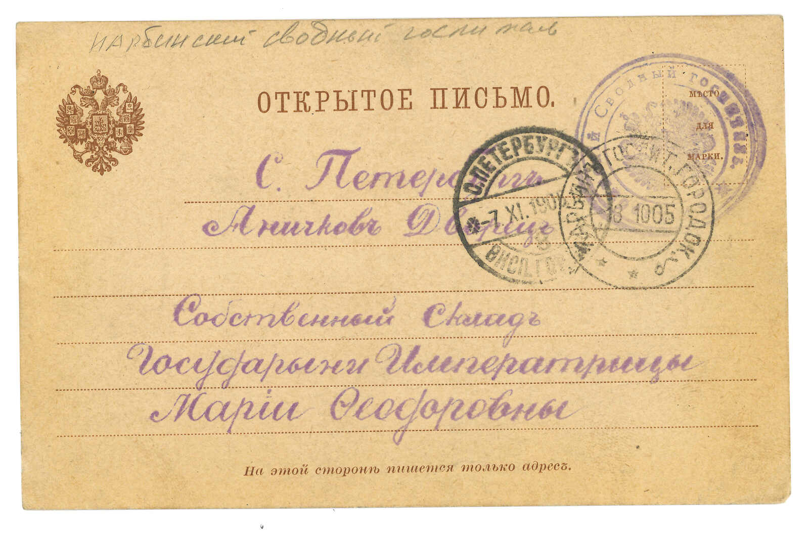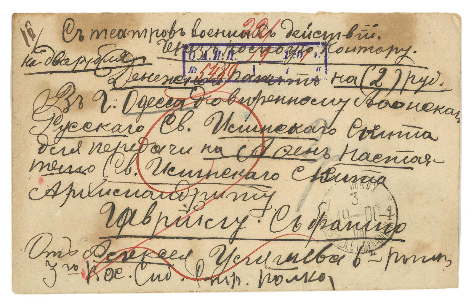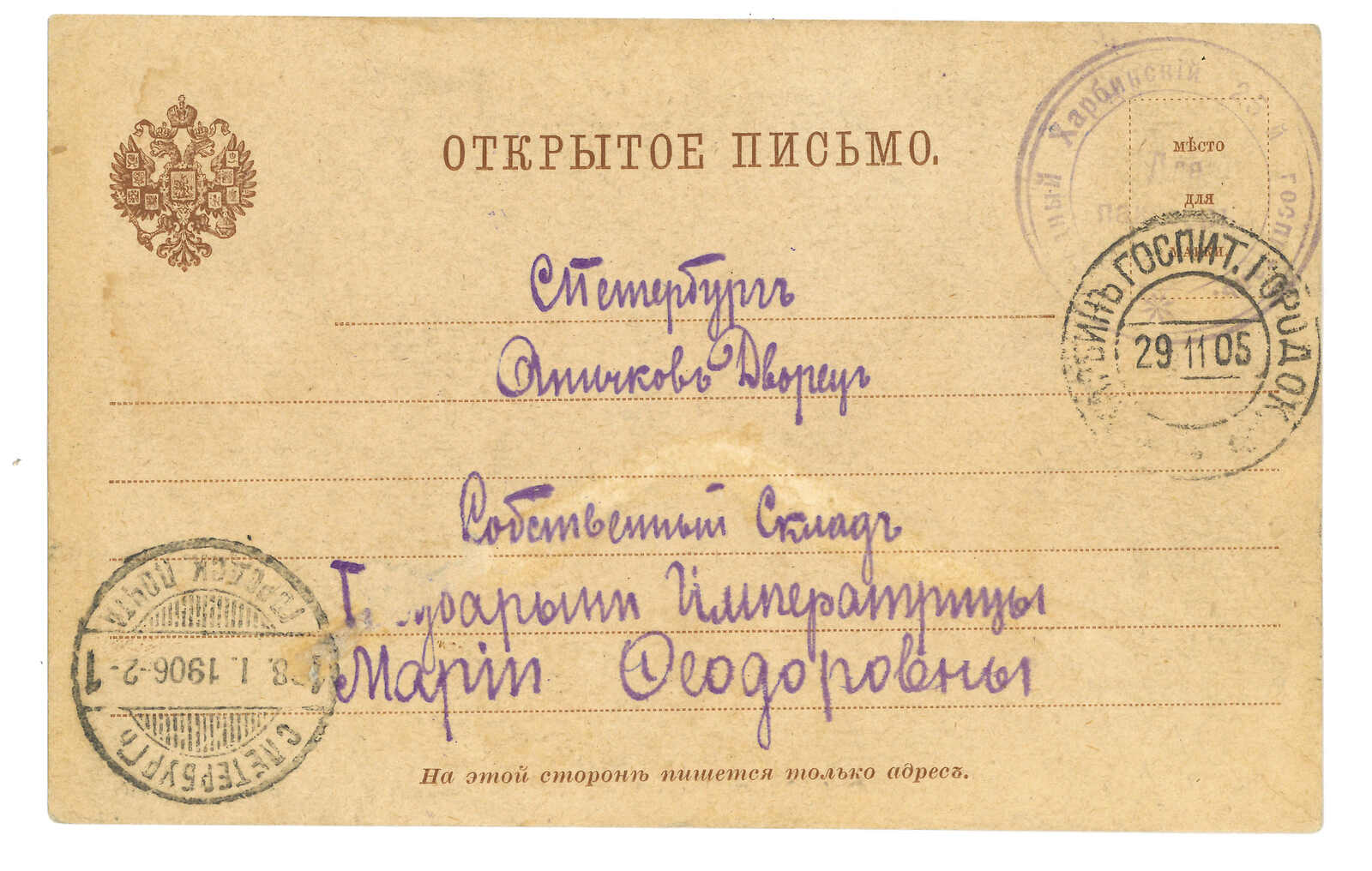 哈爾濱寄法國。圖片明信片,鈐野戰總局日戳。貼軍徽圖7戈比,銷哈爾濱俄局同日日戳。另見滿洲軍總部檢查圓戳。(Image 1)