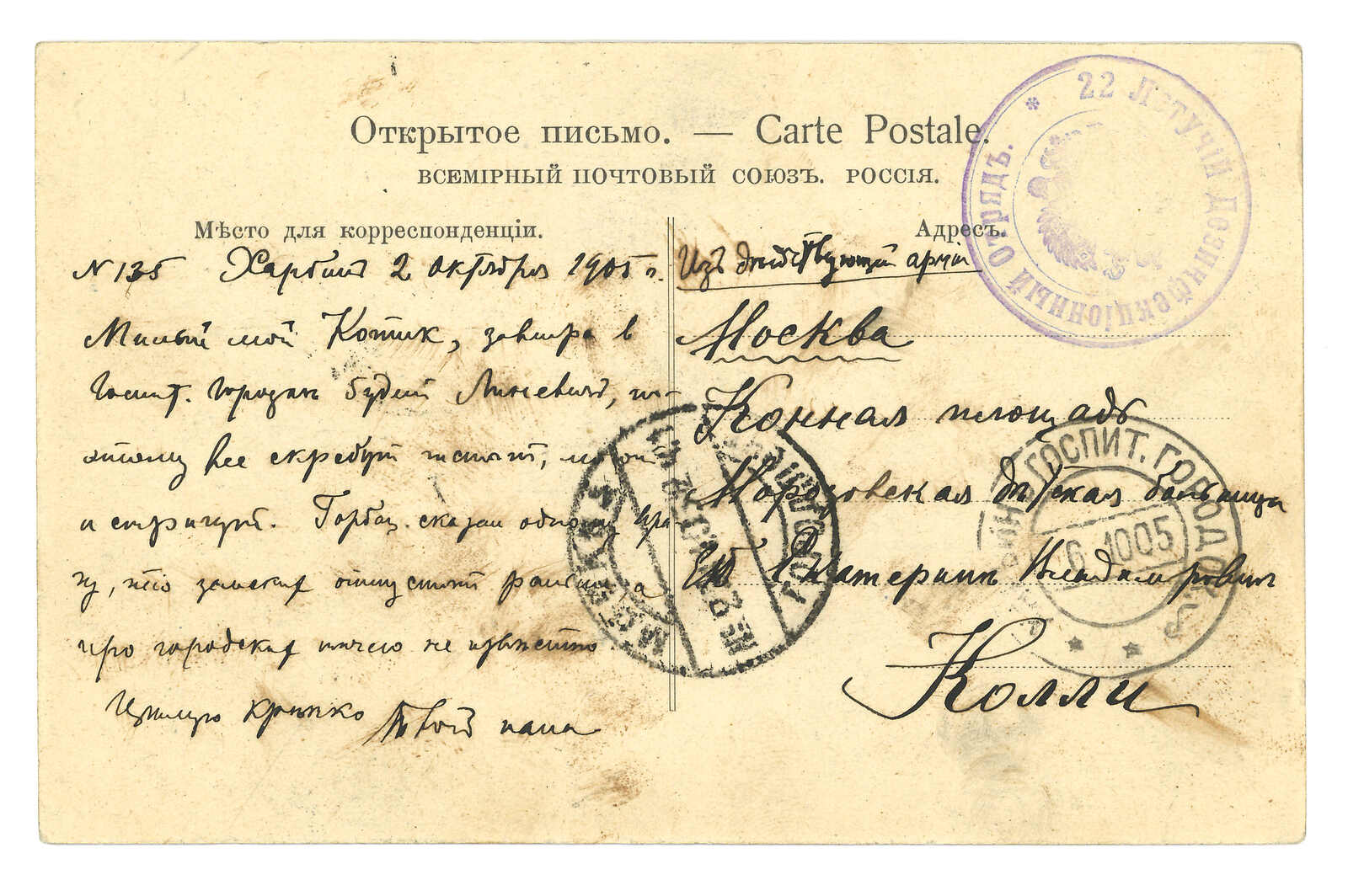 1905年一組四件俄軍軍郵明信片,出自哈爾演醫院,旁鈐部隊章。(Image 1)
