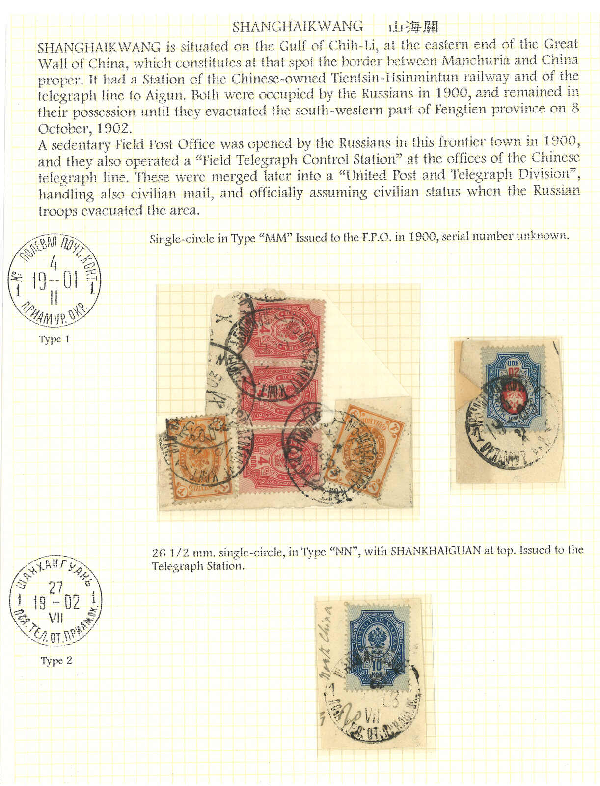 一組三件軍徽圖舊票剪片,銷極罕之山海關俄局T&S 1型及2型日戳。T&S記錄中僅見一件蓋有2型中轉戳之無貼票封例子,可見極罕。(Image 1)