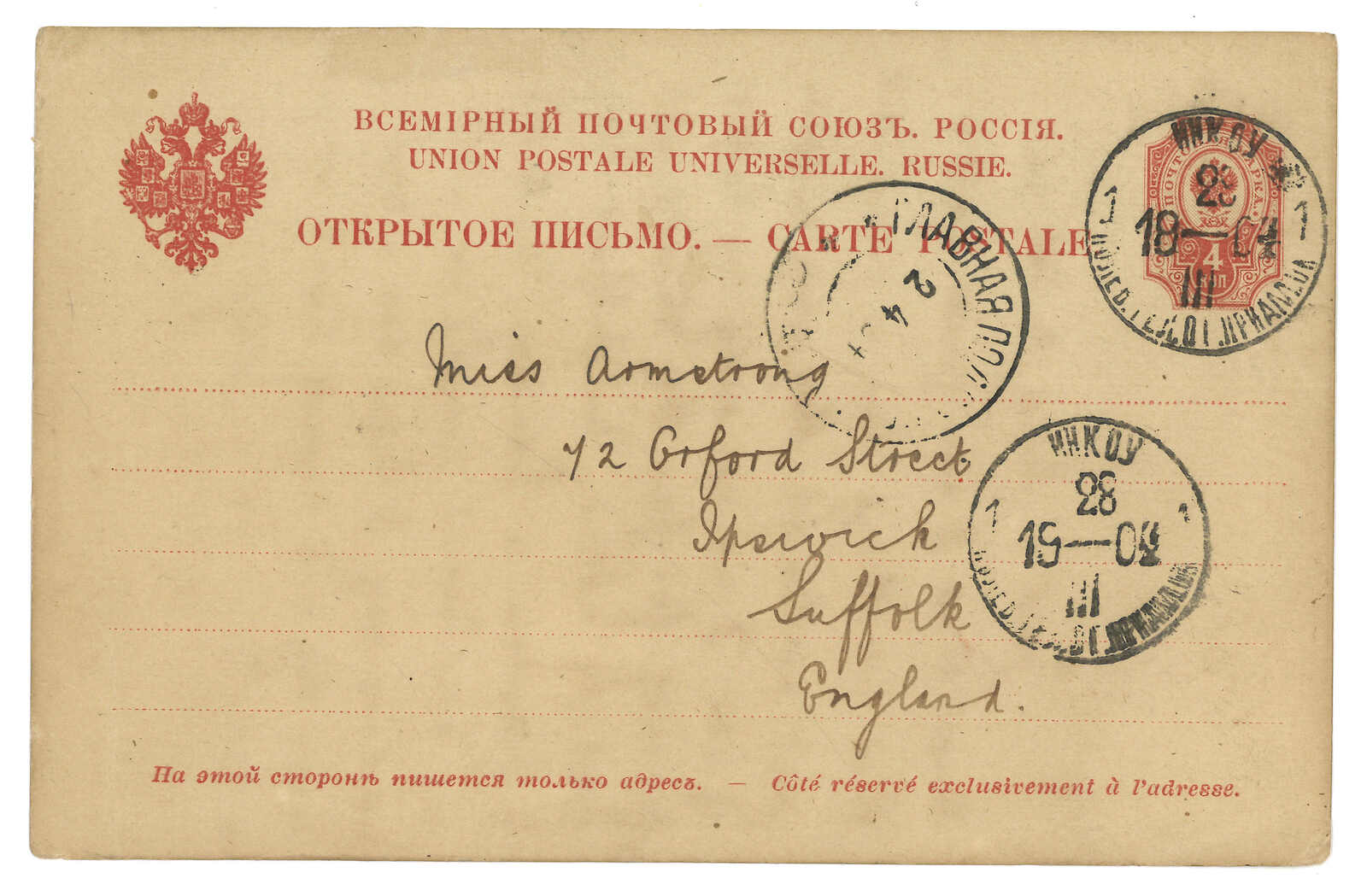1904 (2 Mar) Russian 4k PSC from Inkow to England, tied by Inkow Russian PO T&S type 2 cds. Transit Head FPO (2 Apr) with cds as censor mark. Probably an early example of censorship.