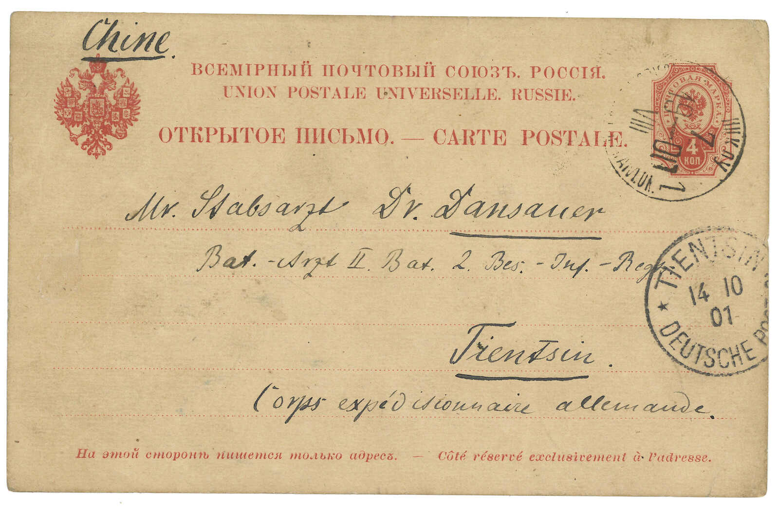 1901 Inkow (Newchwang) (7 Aug) to Tientsin. Russian 4k PSC, tied by Inkow Russian PO T&S type 2 cds with wrong year digit "00" instead of "01". Transit Tientsin Russian PO (21 Aug). Arrived Tientsin German PO (14 Oct). Long