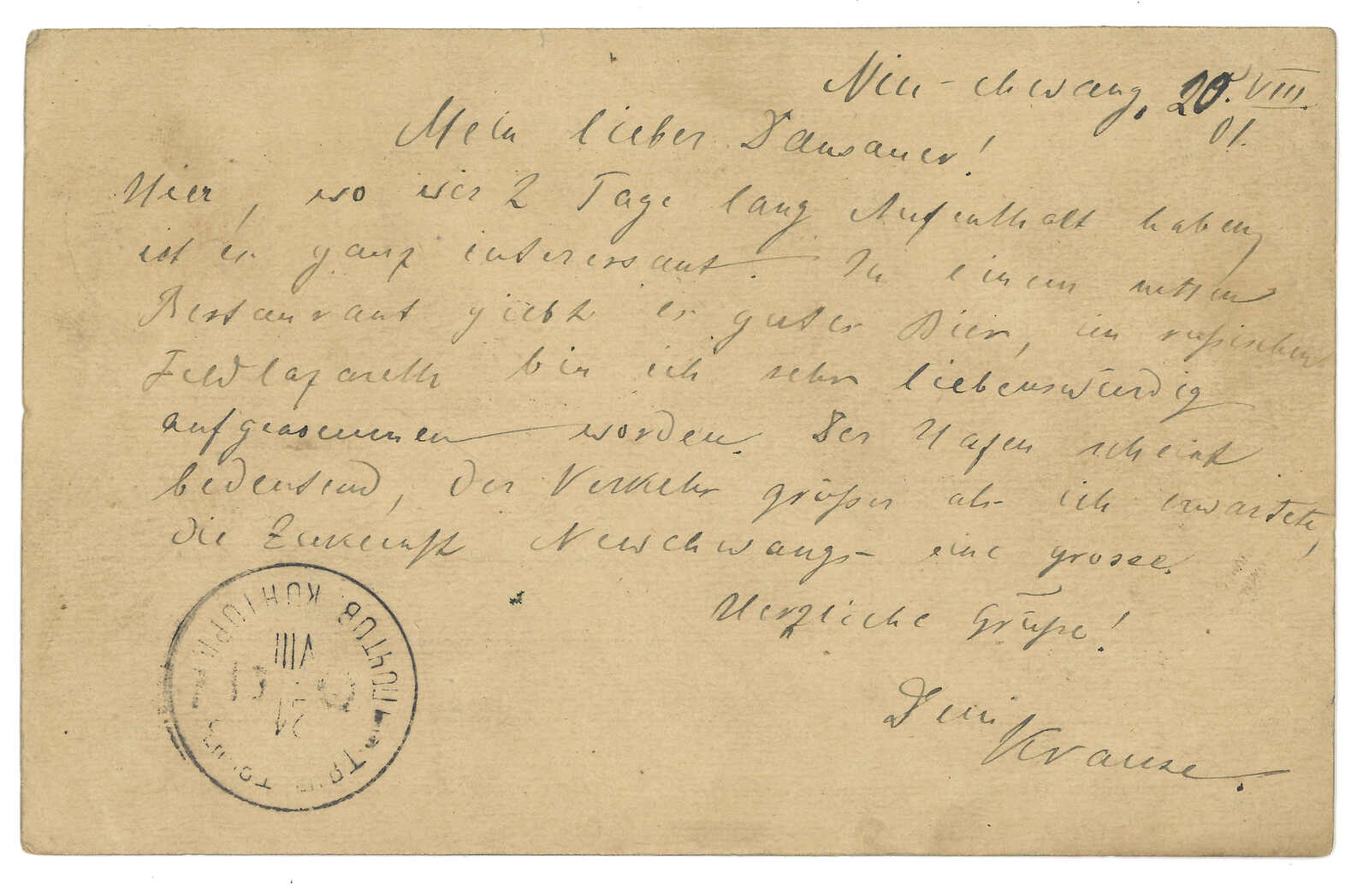 1901.8.7 營口(牛莊)寄天津。俄國4戈比郵資片,銷營口俄局T&S 2型日戳(年份誤作“00”而非“01”)。8.21經天津俄局。10.14抵天津德局。天津俄局及德局間中轉時間甚長。(Image 1)