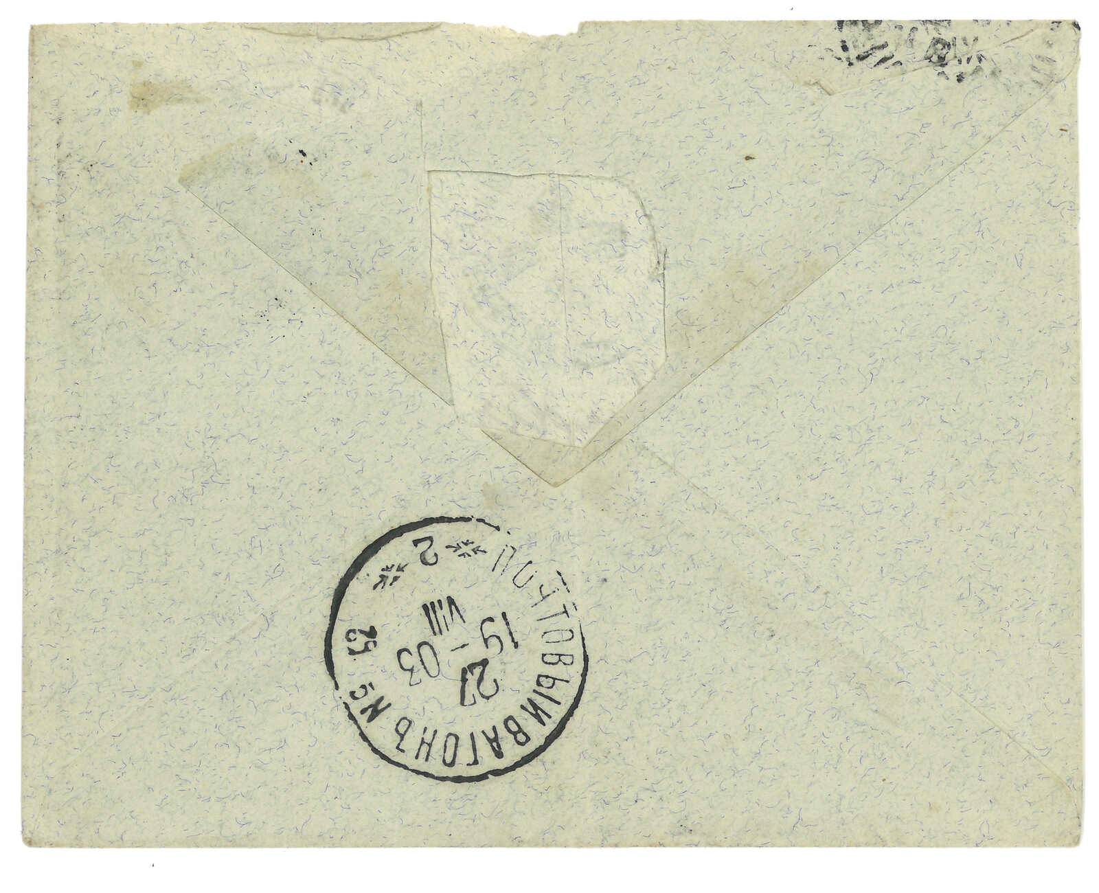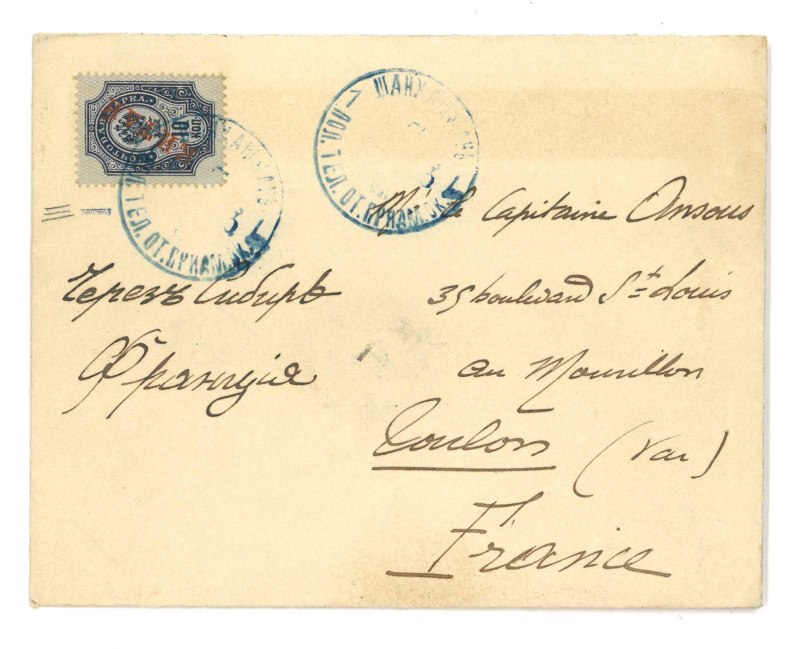 1903.8.7 海關寄法國,貼軍徽圖10戈比,銷少見之山海關俄局T&S 2型藍色日戳。經中東鐵路261線,鈐T&S 1型日戳。9.17抵Toulon。山海關2型日戳在T&S記錄中僅見一件蓋於無貼票封上作中轉戳的例子。而1900年代初之中東鐵路261線存世例子亦甚罕,T&S記錄之1型日戳存世例子僅有數枚散票。(Image 1)