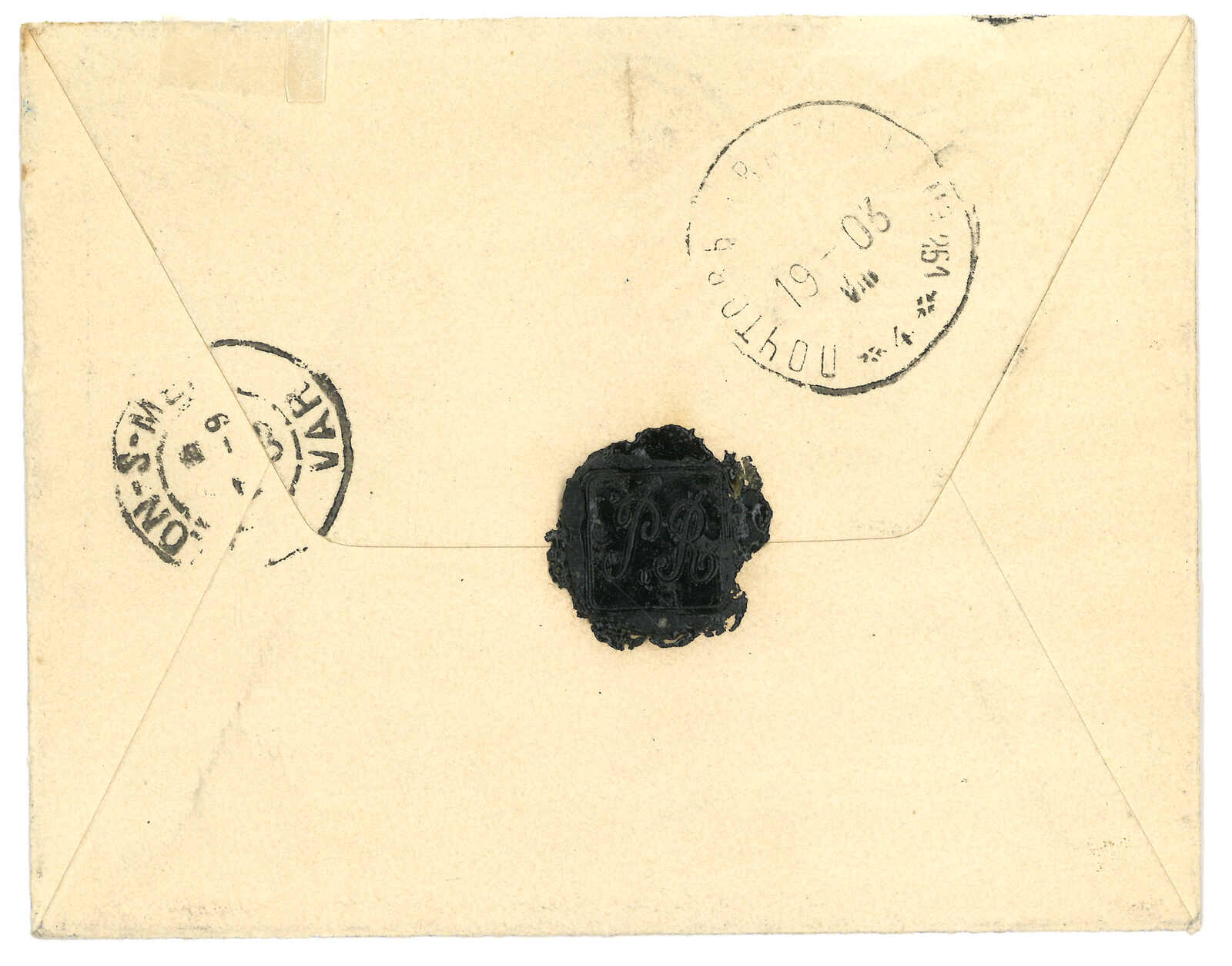 1901.8.4 營口(牛莊)寄俄國。保險匯款封,鈐營口俄局T&S 2型日戳,另見五處火漆。寫有“2”(盧布)及“17+3/20”(郵資)。雖然出自營口之郵件甚多,但保險匯款封難得一遇。(Image 1)
