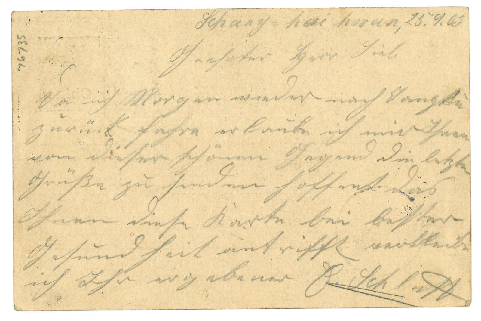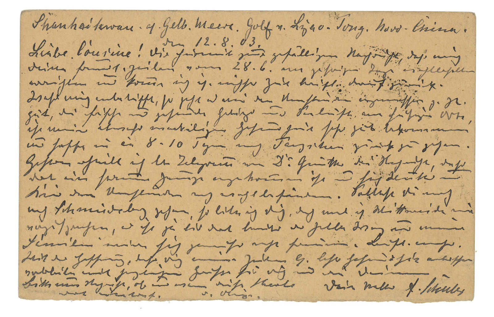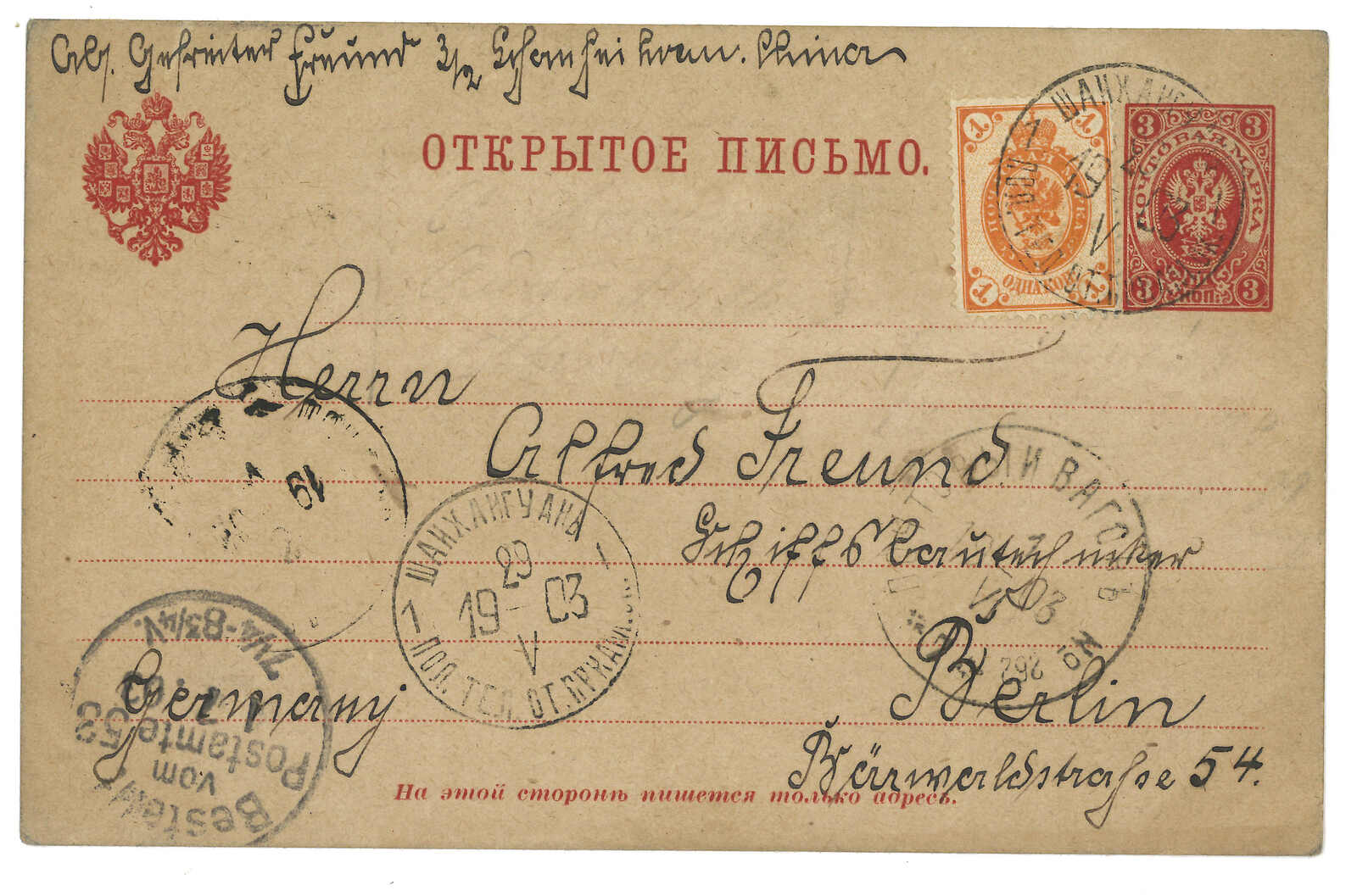 1900 Inkow (Newchwang) (7 Aug) to Germany. Russian 4k PSC, tied by Inkow Russian PO T&S type 2 cds. Transit Chefoo Russian PO and Chinese PO (27 Aug), Shanghai Chinese and Russian PO (29 Aug), Hong Kong (4 Sep). Arrrived