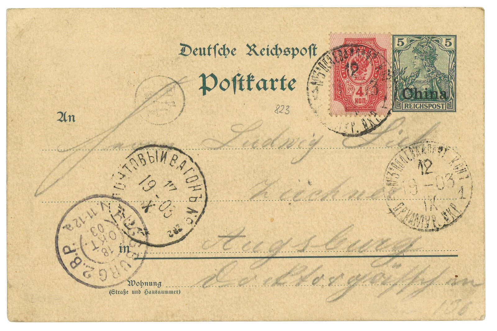 1903.9.12 營口(牛莊)寄德國。德國加蓋China 5芬尼郵資片用作明信片,貼軍徽圖4戈比,銷營口俄軍13局T&S