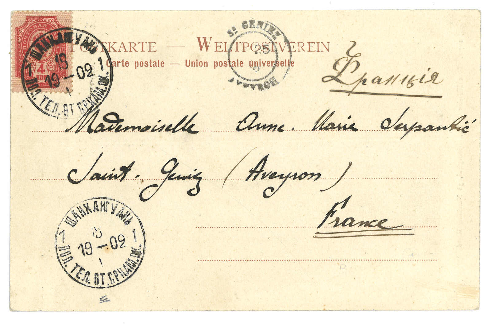 1902 Shanhaikwan (15 Jun) to France. Picture postcard, f.w. Coat of Arms 4k, tied by Shanhaikwan Russian PO T&S type 2 cds. Arrived St Geniez (25 Jul). Illustration fig 47, p. 152 in "The History and Postal HIstory of