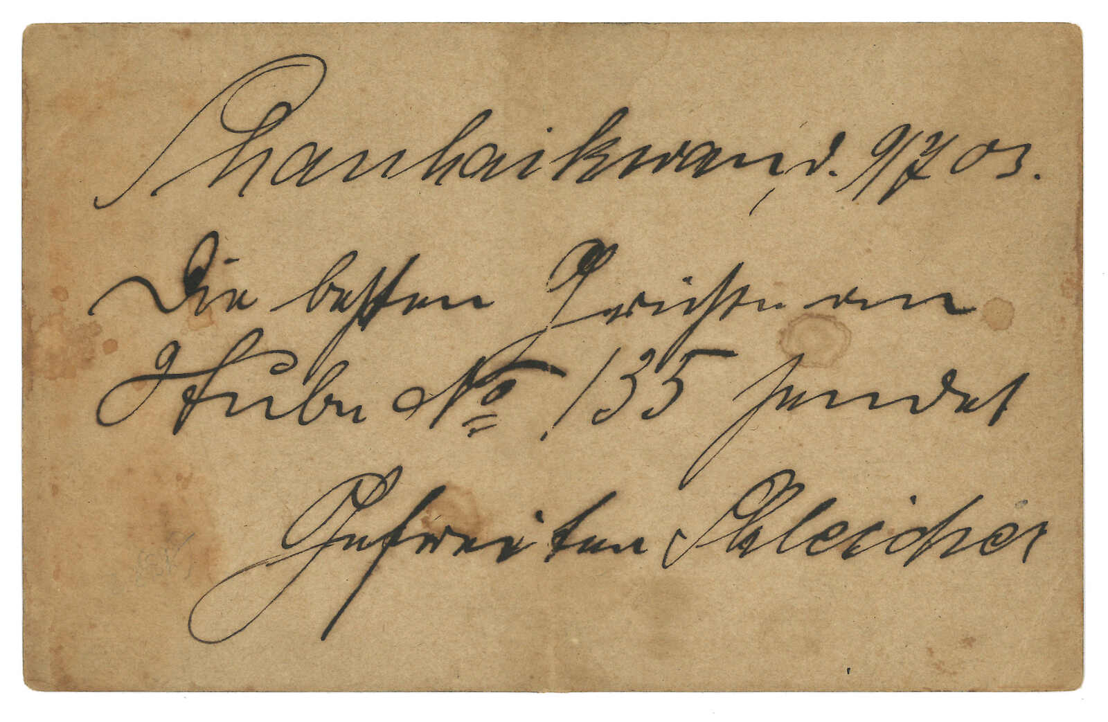 1903.5.29 山海關寄德國。俄國3戈比郵資片,加貼1戈比,銷珍罕少見之山海關俄局T&S 2型日戳。6.1經中東鐵路262線,鈐T&S 1型7字日戳。7.1抵德國。T&S記錄中僅見一件山海關2型日戳蓋於無貼票封上作中轉戳的例子。而1900年代初之中東鐵路262線存世例子亦甚罕,T&S記錄之1型日戳存世例子僅有數枚散票。(Image 1)