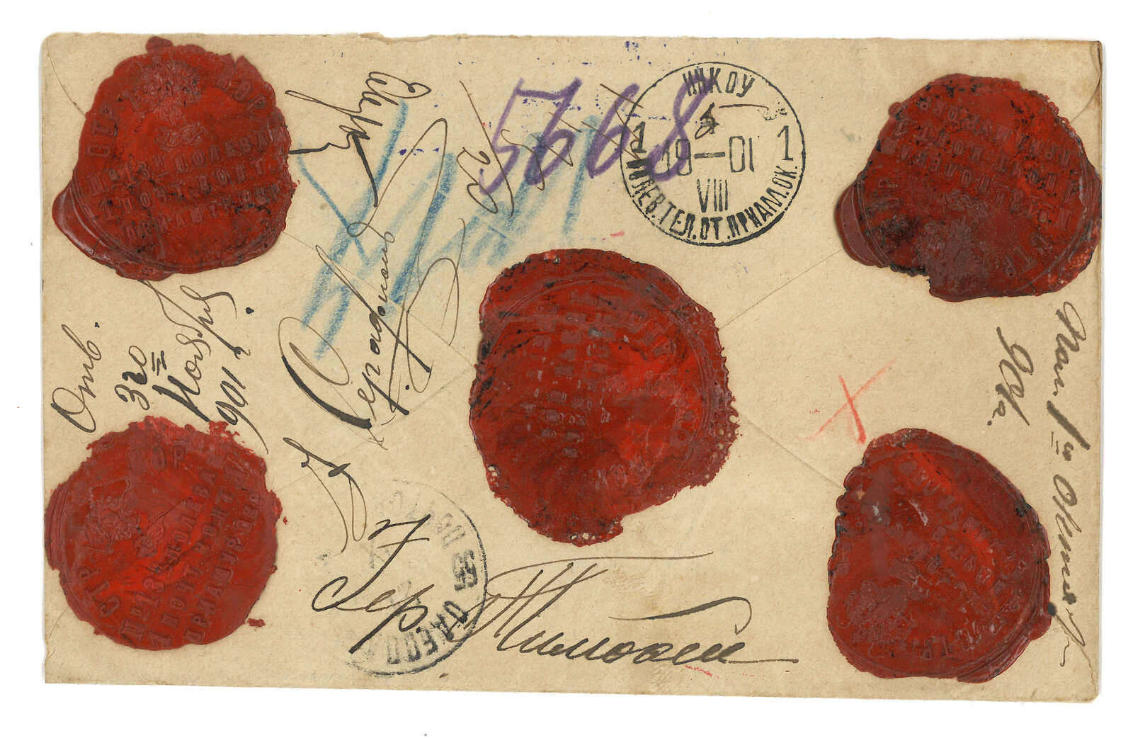 1901 Inkow (Newchwang) (4 Aug) to Russia. Insured remittance cover, applied with Inkow Russian PO T&S type 2 cds. On reverse with five wax seals. Showing manuscript of "2" (ruble) and "17+3/20" postage charge. Although