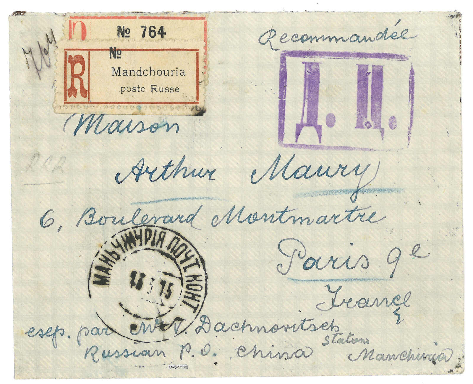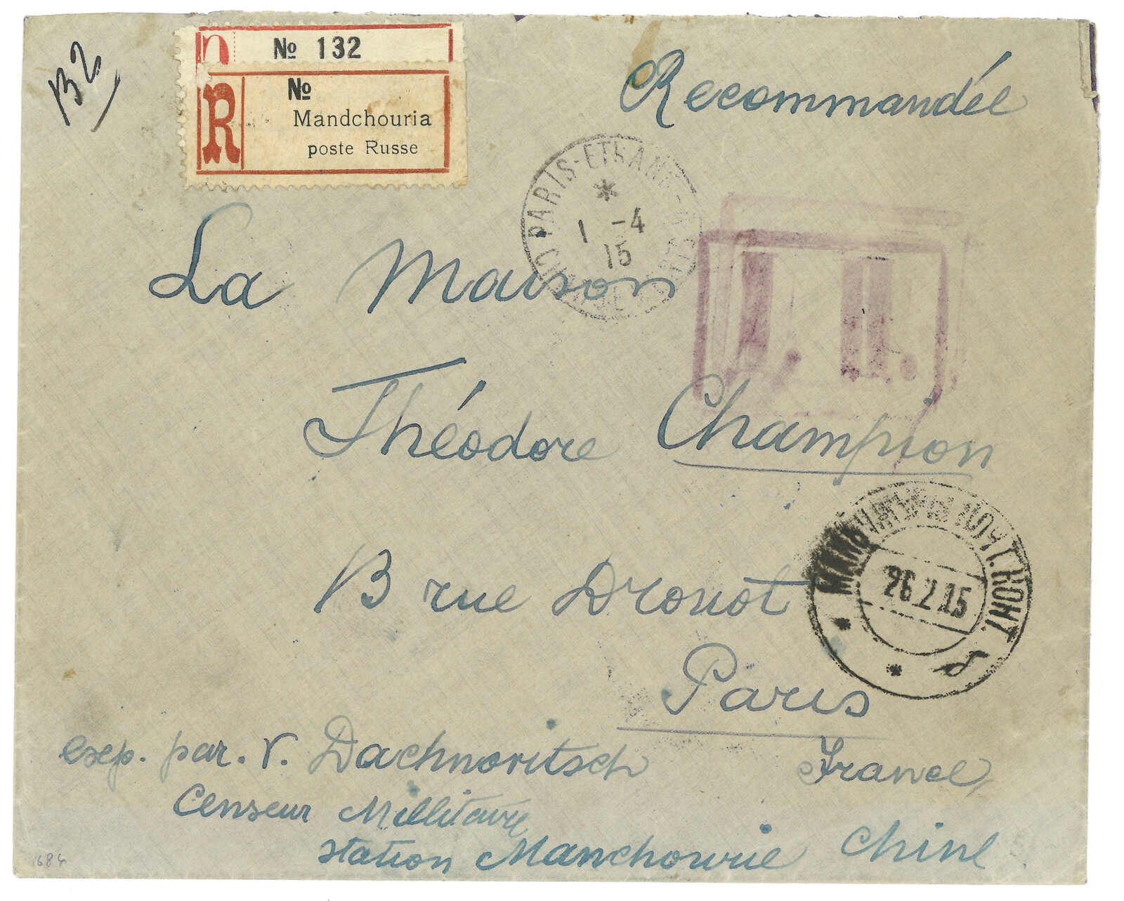 1915 Manchouli (26 Feb) to France. Registered cover, f.w. Coat of Arms 10k x2 on reverse, tied by Manchouli Russian PO T&S type 1b cds. On front with type 3 circular and type 4 boxed censor mark. Transit St Petersburg .