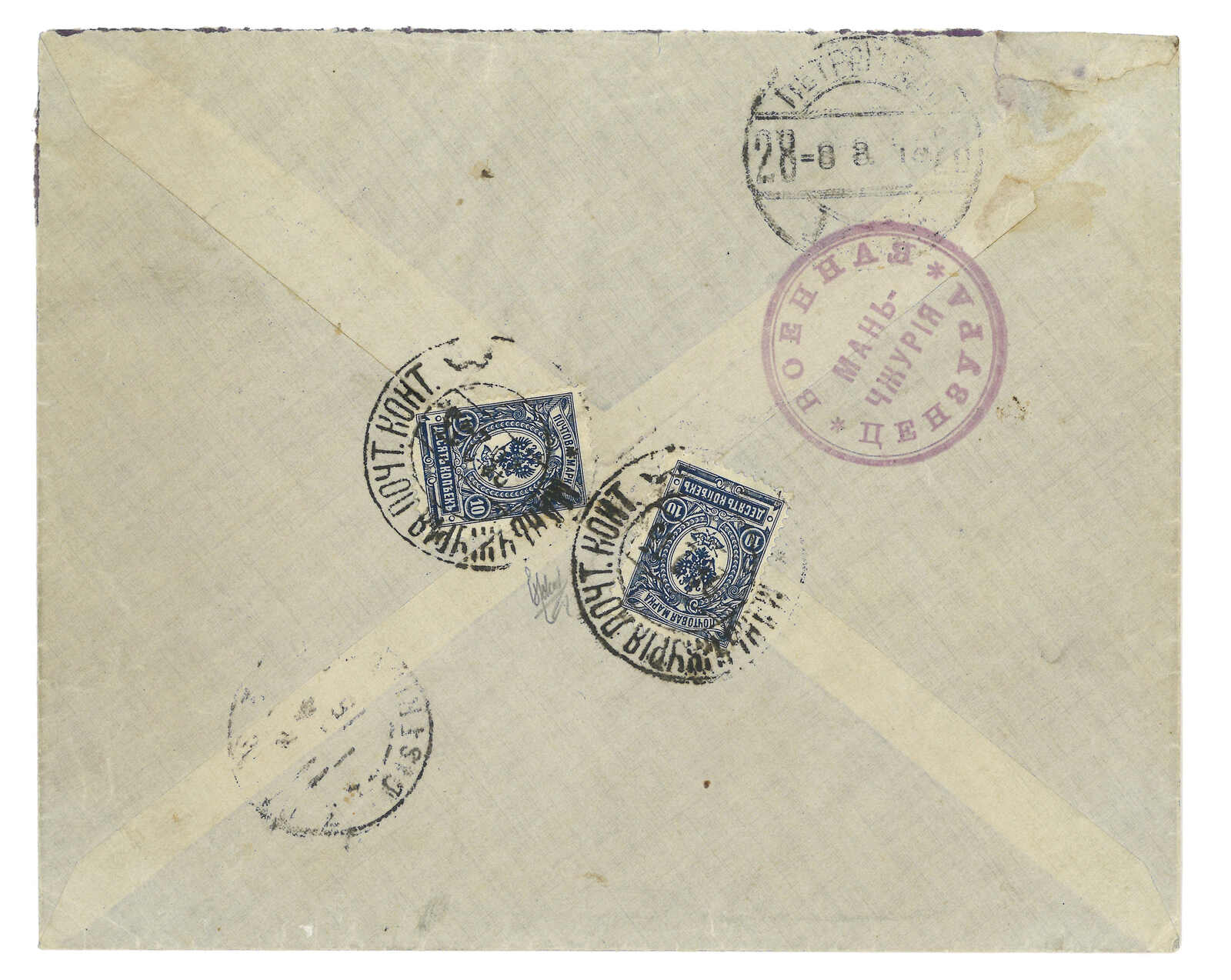 1914 Manchouli (9 Oct) to USA. Registered cover, f.w. Romanov 10k x2 on reverse, tied by scarce Manchouli Town Russian PO T&S type 1b cds. On front with registered labels and type 3 circular censor mark. On reverse with