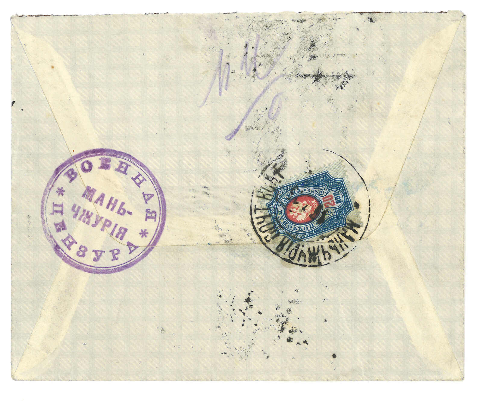 滿洲里寄法國。掛號封,背貼軍徽圖20戈比,銷滿洲里俄局T&S 1b型日戳,另見3型圓戳檢查章及4型方形檢查章。(Image 1)