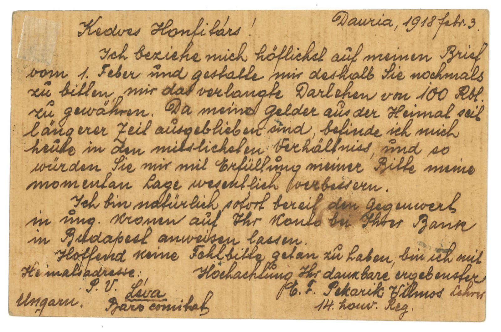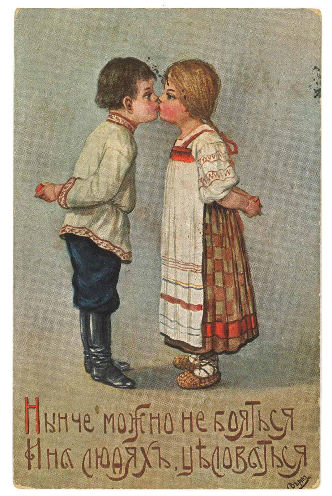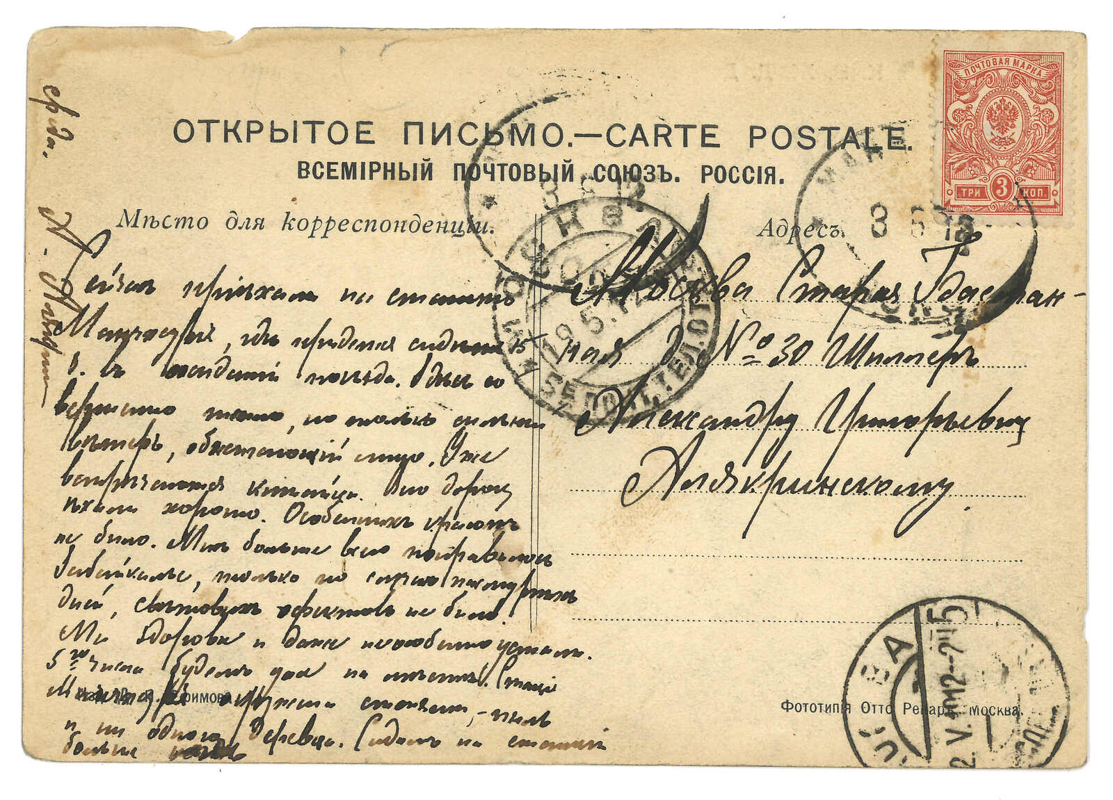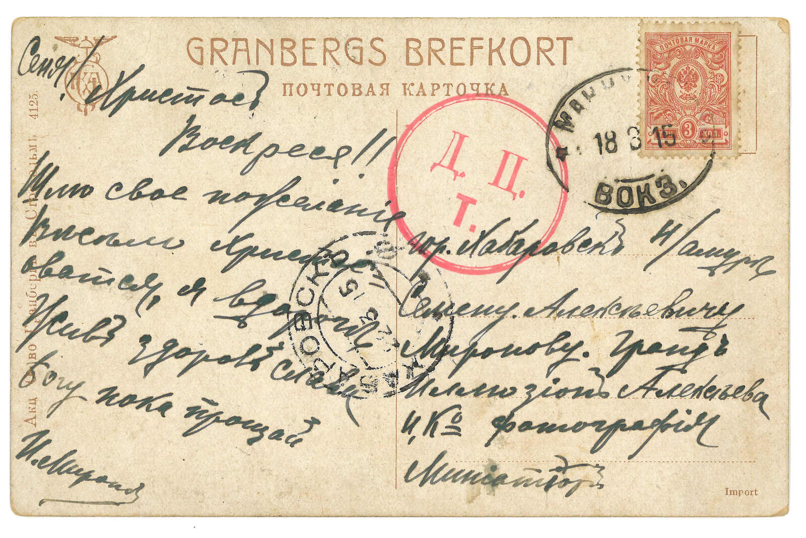 圖片明信片,由滿洲里車站寄德國,貼軍徽圖3戈比,銷滿洲里車站T&S 2型橢圓日戳。5.19經莫斯科,同月抵德國。(Image 1)