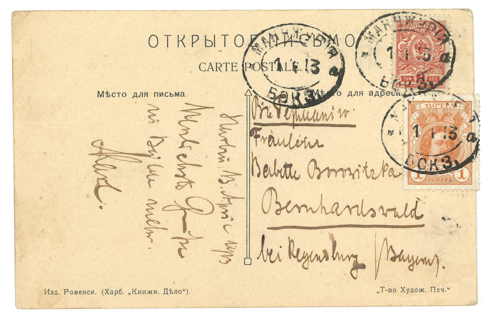 1913.1.1 圖片明信片,由滿洲里車站寄德國,貼軍徽圖3戈比 + 羅曼諾夫1戈比,銷滿洲里車站T&S 2型橢圓日戳。(Image 1)