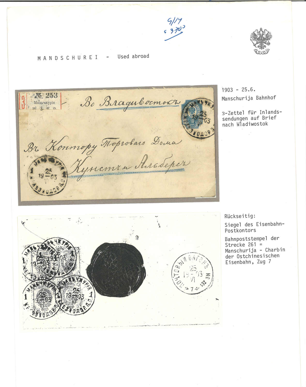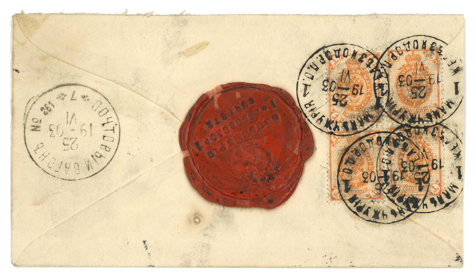 1903.6.25 滿洲里車站寄海參崴。俄國10戈比郵資封,背加貼1戈比四方連,銷少見之滿洲里車站T&S 1型日戳,另貼掛號標籤。4.25經中東鐵路261線,鈐同樣少見之T&S 1型日戳。滿洲里車站1型日戳極為難得,T&S未見任何存世例子。而1900年代初之中東鐵路261線存世例子亦甚罕,T&S記錄之1型日戳存世例子僅有數枚散票。(Image 1)