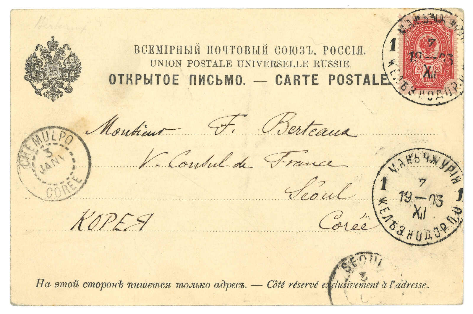 1903.12.7 滿洲里車站寄漢城。旅順港風光明信片,貼軍徽圖4戈比,銷少見之滿洲里車站T&S 1型日戳。1.3經仁川,同日抵漢城。滿洲里車站1型日戳極為難得,T&S未見任何存世例子。寄朝鮮亦甚為少見。(Image 1)