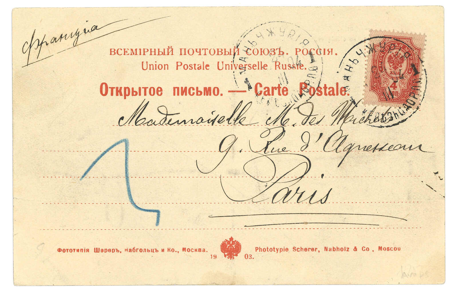 1904 Manchouli Station (24 Mar) to France. Picture postcard, f.w. Coat of Arms 4k, tied by Manchouli Station T&S type 1 cds. T&S did not record any example of Manchouli Station type 1 cds.