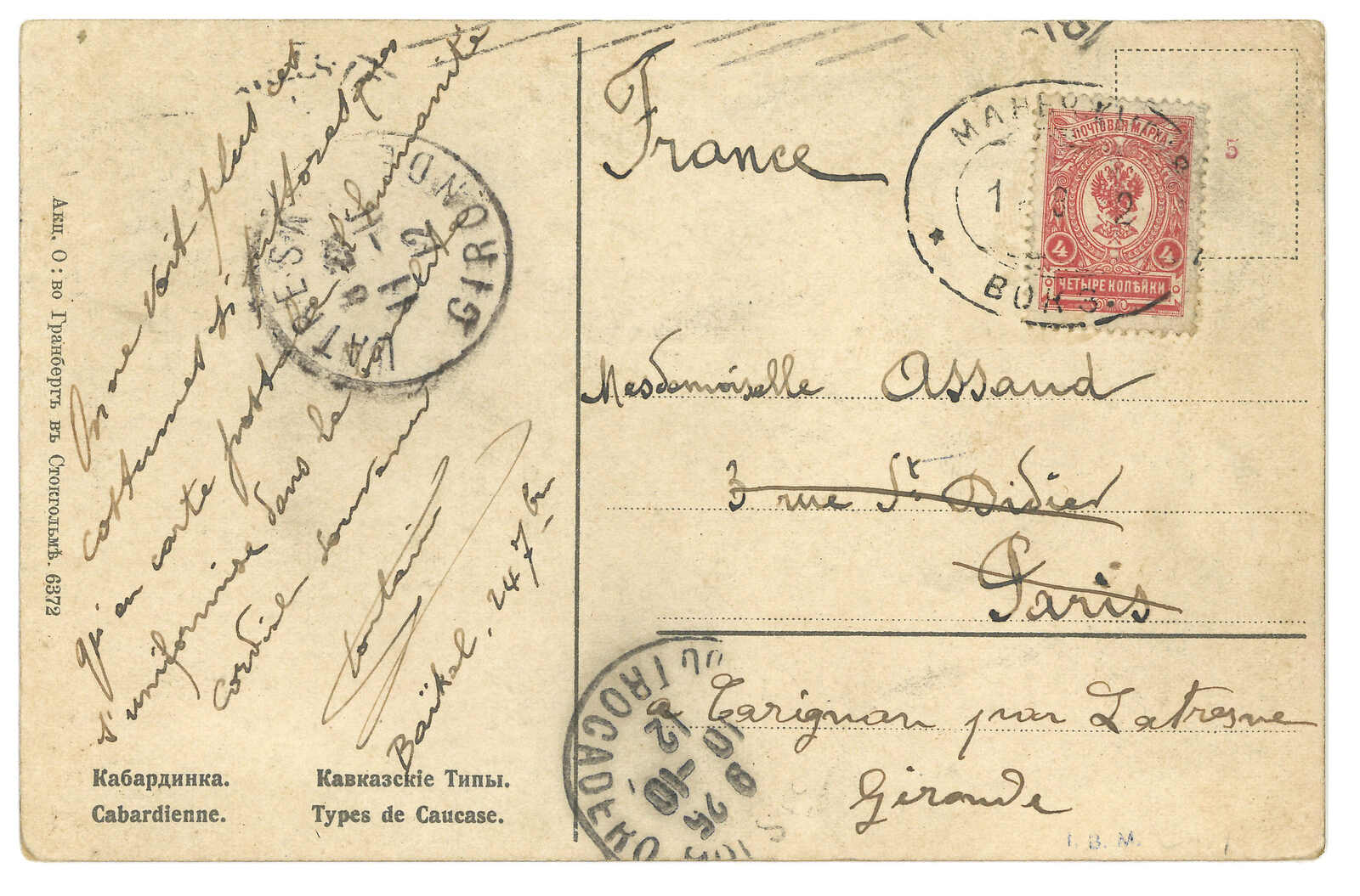 1912.9.1 滿洲里車站寄法國。圖片明信片,貼軍徽圖4戈比,銷滿洲里車站橢圓日戳(與T&S 2型相似但未有記錄)。10.10抵巴黎,改寄Latresne,10.11抵達。可能為孤品。(Image 1)